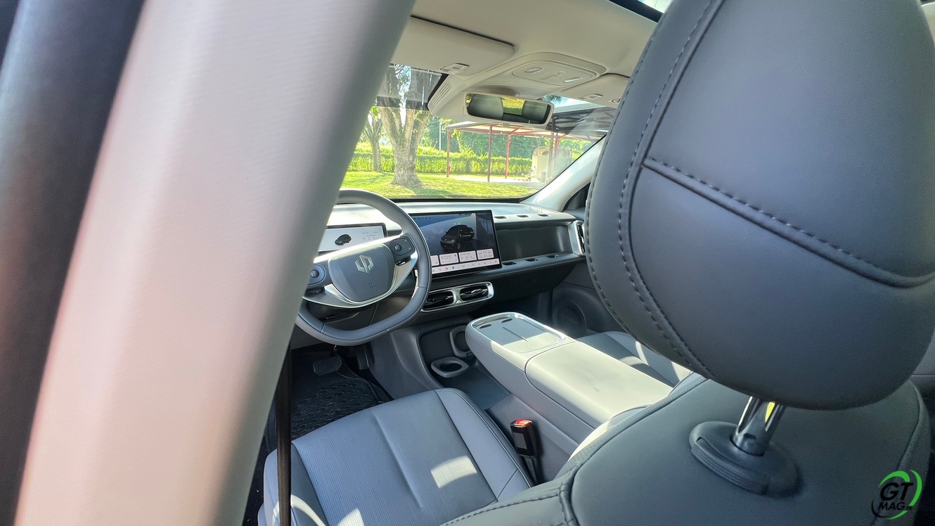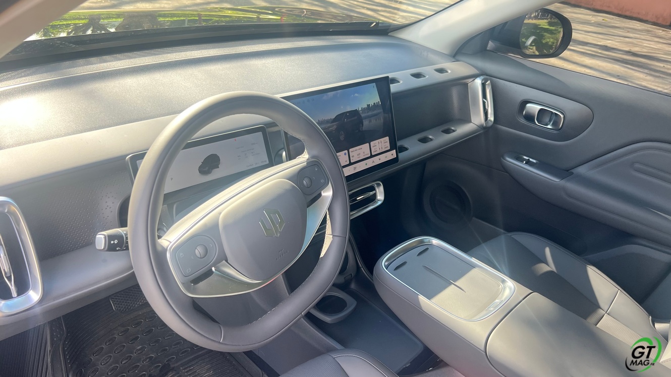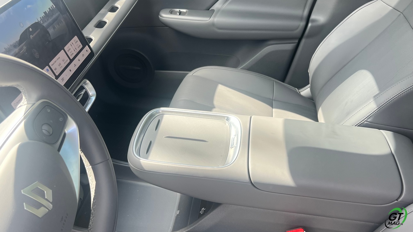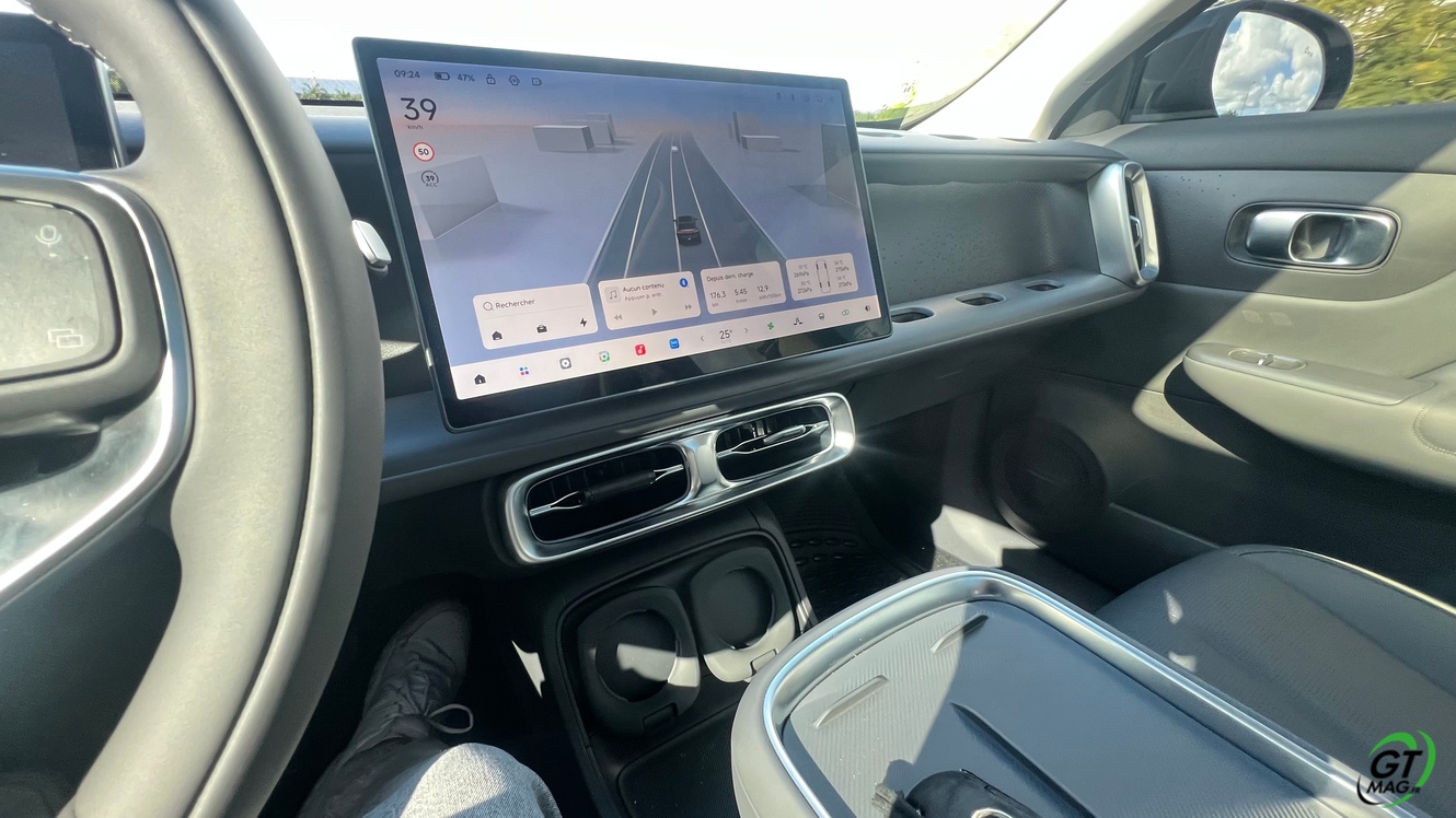 Dans l’habitacle, le Leapmotor B10 suit son propre chemin avec une planche de bord à deux étages. À notre grand étonnement et plaisir, on trouve des buses de ventilation, ainsi qu’un espace de rangement bien pratique devant le passager. En sus, il y a un grand bac dans la console centrale et deux porte-gobelets escamotables. Une chose est sûre : ce ne sont pas les rangements qui manquent ! D’ailleurs, toujours sur le point du rangement et de l’habitabilité : le Leapmotor B10 joue bien de sa taille pour offrir un habitacle généreux. Devant comme derrière, tous les passagers seront bien assis, tandis que le coffre taille à 430 litres. Mieux encore, il y a 25 litres d’espace sous le capot. Pratique pour les câbles ! Côté infodivertissement, tout passe va une grande dalle tactile de 14,6 pouces – en plus d’une instrumentale digitale de 8,8 pouces. Quand on dit « tout », c’est vraiment « tout », puisque le B10 ne présente aucun bouton. Pas même pour régler les rétroviseurs…