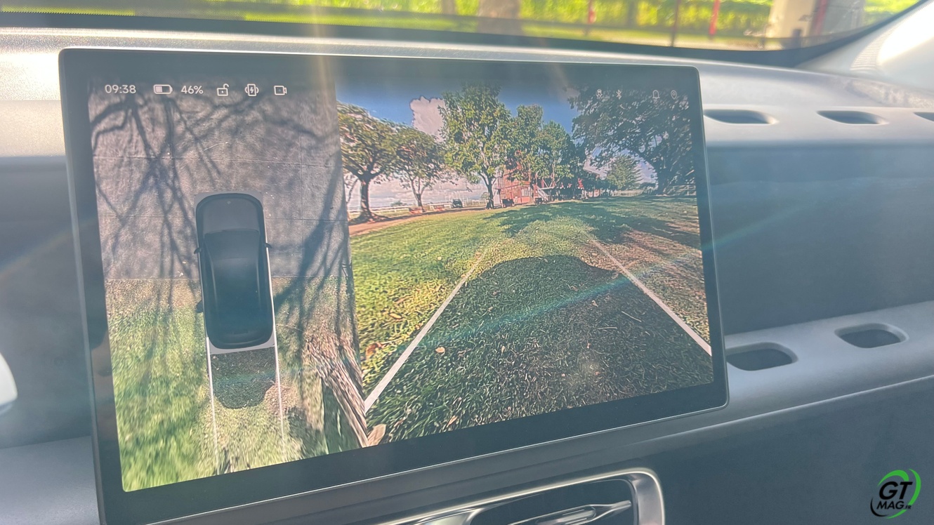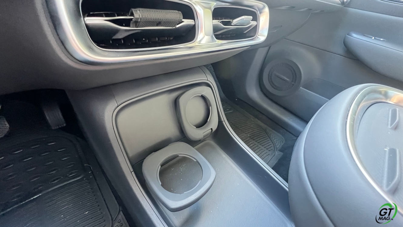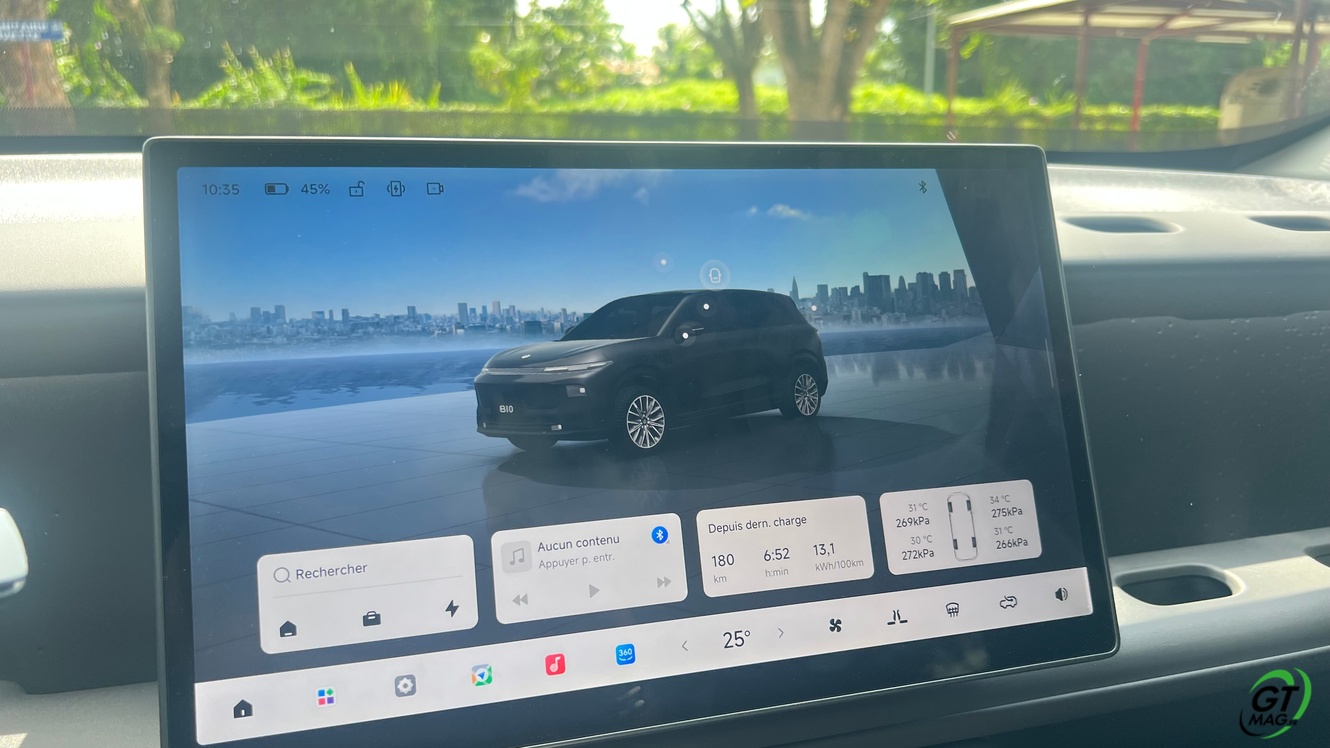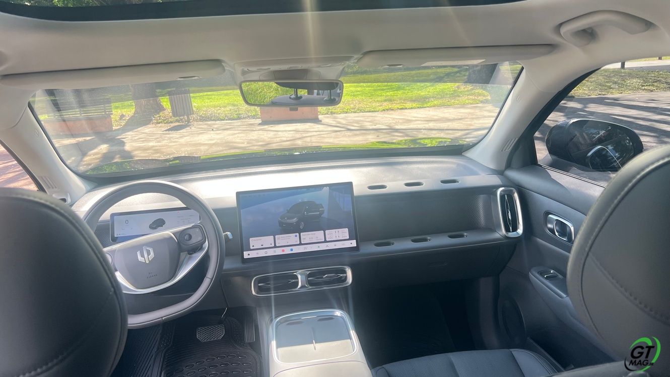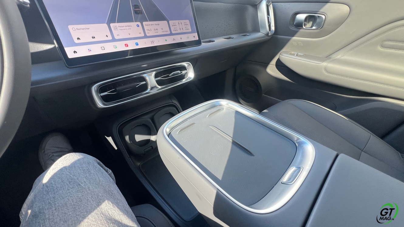 Dans l’habitacle, le Leapmotor B10 suit son propre chemin avec une planche de bord à deux étages. À notre grand étonnement et plaisir, on trouve des buses de ventilation, ainsi qu’un espace de rangement bien pratique devant le passager. En sus, il y a un grand bac dans la console centrale et deux porte-gobelets escamotables. Une chose est sûre : ce ne sont pas les rangements qui manquent ! D’ailleurs, toujours sur le point du rangement et de l’habitabilité : le Leapmotor B10 joue bien de sa taille pour offrir un habitacle généreux. Devant comme derrière, tous les passagers seront bien assis, tandis que le coffre taille à 430 litres. Mieux encore, il y a 25 litres d’espace sous le capot. Pratique pour les câbles ! Côté infodivertissement, tout passe va une grande dalle tactile de 14,6 pouces – en plus d’une instrumentale digitale de 8,8 pouces. Quand on dit « tout », c’est vraiment « tout », puisque le B10 ne présente aucun bouton. Pas même pour régler les rétroviseurs…