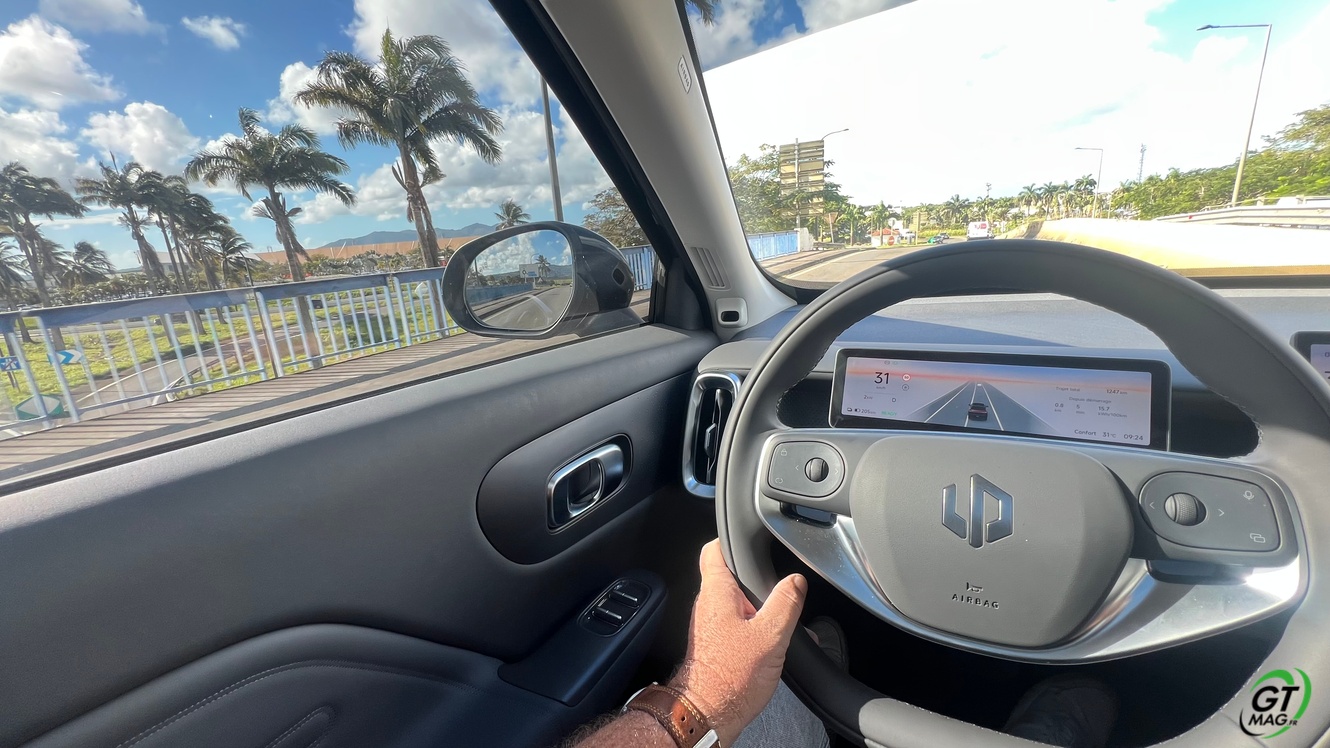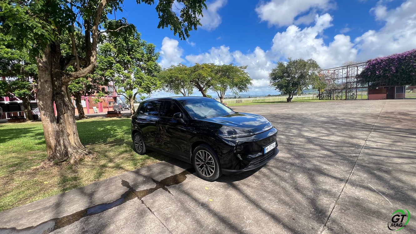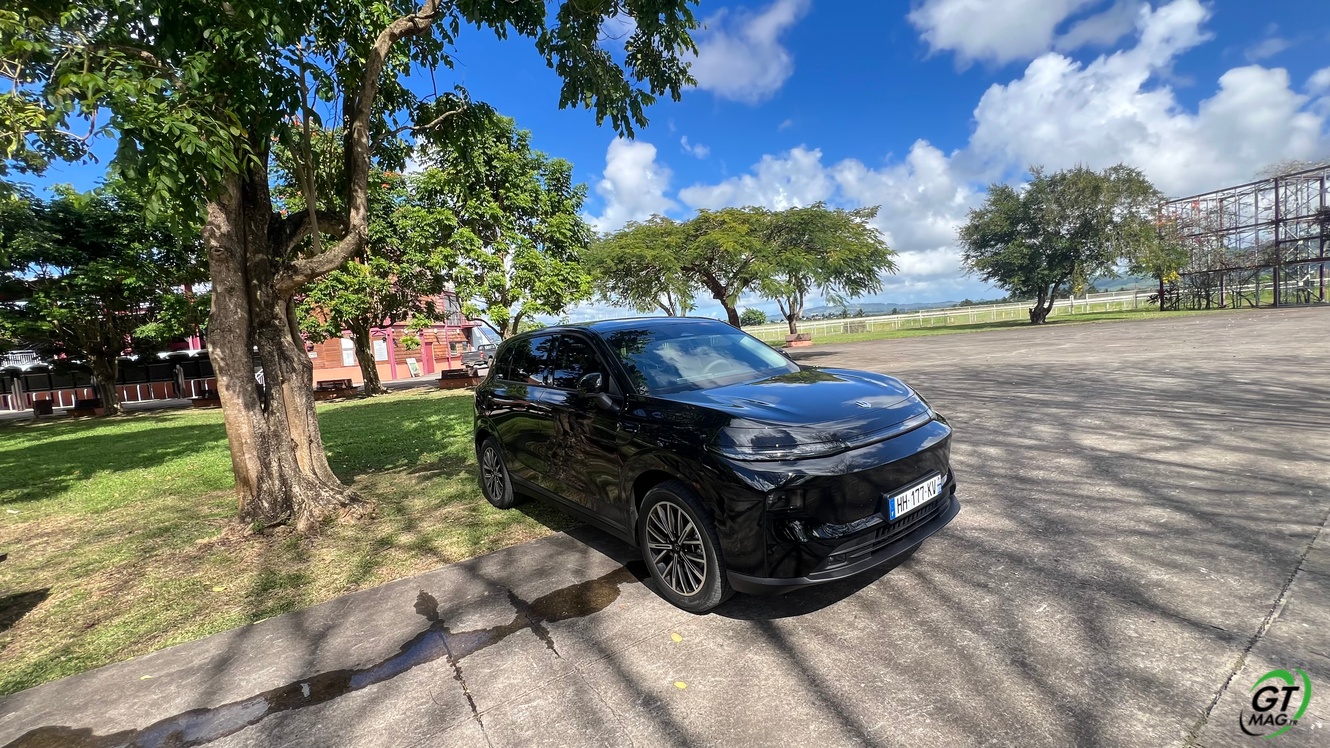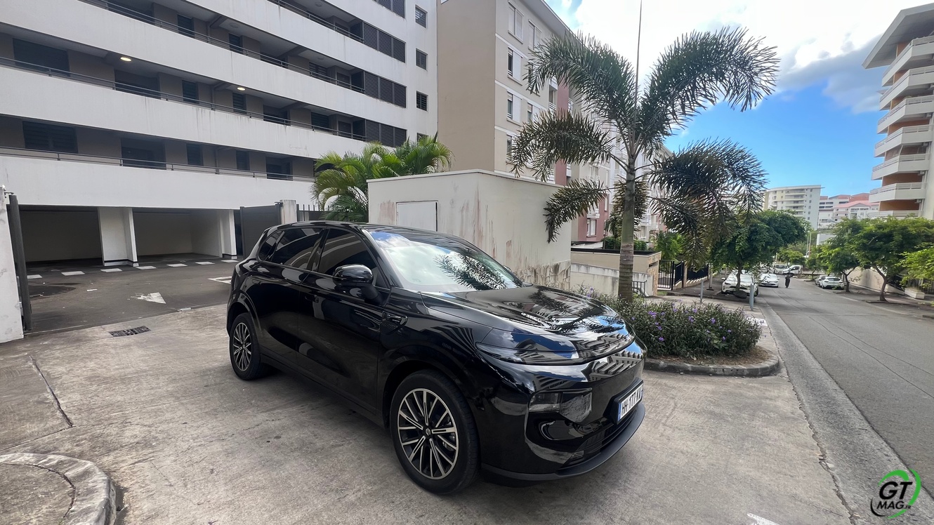 Les Leapmotor B10 et C10 partagent une plateforme et leurs technologies. Pas étonnant donc de retrouver le moteur électrique de 218 ch sur le train arrière du petit crossover. Il présente aussi une suspension McPherson à l’avant, 5 bras à l’arrière et même une répartition du poids 50/50. Ce dernier élément est sans doute aidé par les batteries. Eh oui, il y a en a deux au catalogue on l’a vu. En Martinique la grande batterie présente une capacité de 67,1 kWh, ce qui lui permet d’offrir une autonomie de 434 km. Elle charge à 168 kW elle prendra 20 min pour passer de 10 à 80 % de charge sur une borne rapide. Côté consommation et d’après mes petits calculs, il faudra toutefois tabler sur un appétit moyen gravitant autour des 16 à 18 kWh/100 km, soit près de 360 km à 390 km d’autonomie. Ma conduite, mon style ont été plutôt raisonnable flirtant parfois avec une écoconduite que je maitrise très bien, mais aussi des moments d’accélérations voulues et prolongées sur notre rocade ou autoroute…