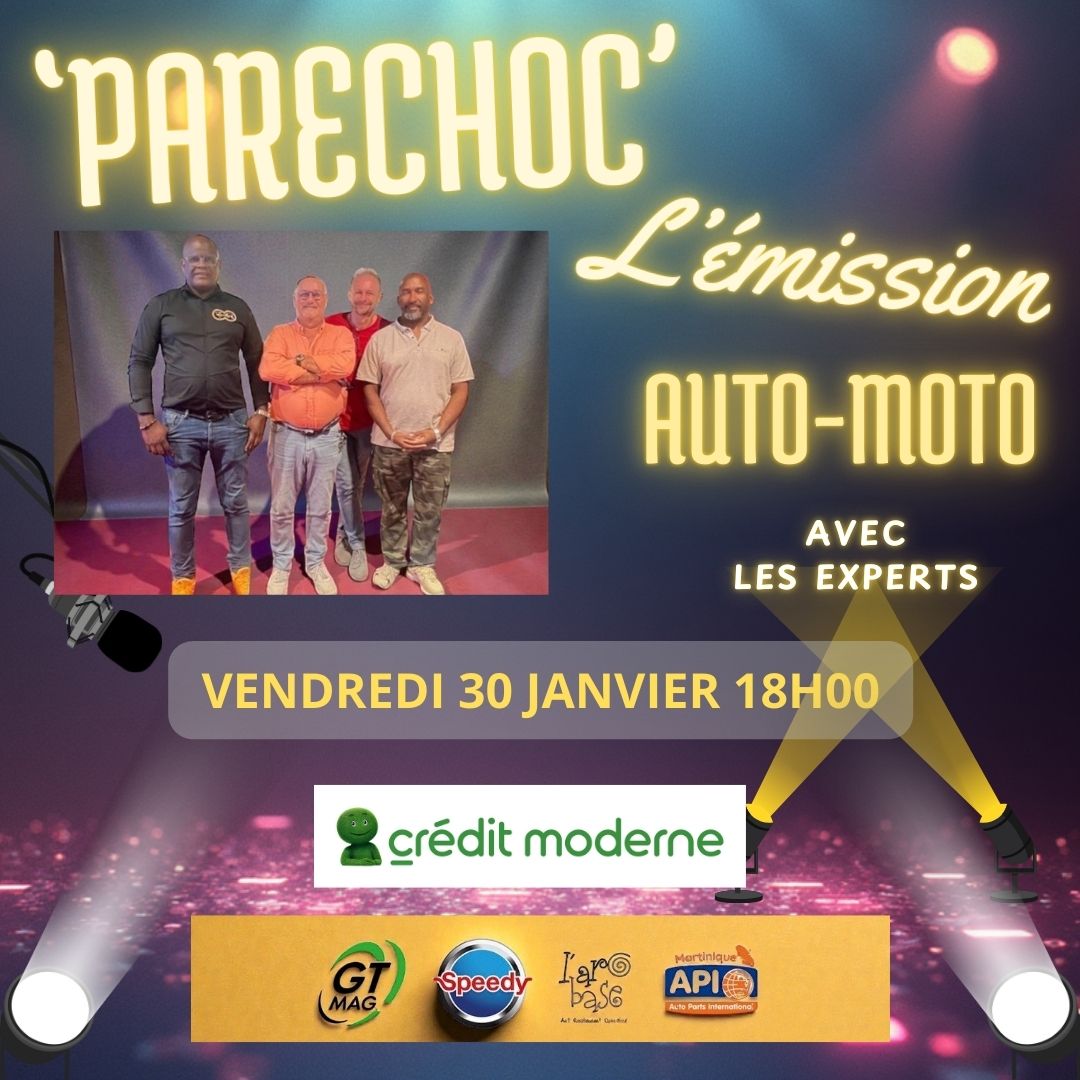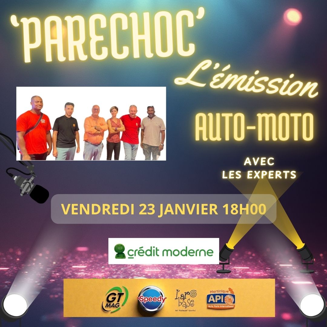Vendredi 23 janvier retrouver le numéro 0 de notre nouvelle émission #parechoc AVEC JM de la bande à JM, www.gtmag.fr et tous ses invités du secteur #automoto en #martinique et aux #antillesfrancaises ! Vendredi depuis l'#Arobase du CASINO BATELIERE PLAZZA je recevrai avec Éric Rouget #lucanieddu de l'#avere Martinique nous aborderons avec lui les nouvelles fiscalités en 2026 pour les automobilistes... Nous retrouvons #willemessart de l'association #bwadjackaddict nous parlerons du carnaval bien...