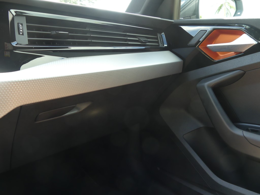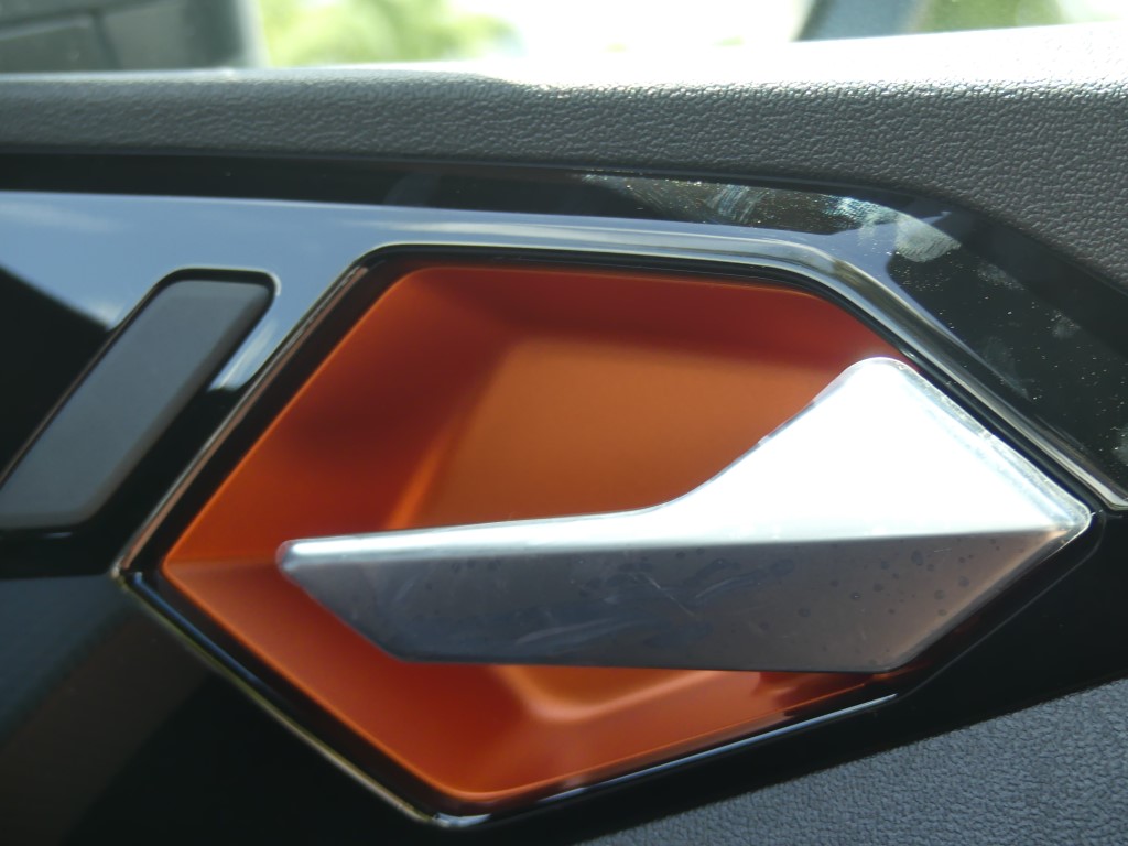 Vous trouviez l’A1 trop basse et trop citadine ? Audi vous a entendu et a sorti le modèle country voir offroad pour sa petite citadine. En Martinique c’est une vraie petite tendance : oui le marché est de plus en plus envahit par les SUV et autres crossovers dont la cote de popularité ne faiblit pas, aussi la marque allemande préférée des martiniquaises à jouée sur les bases de l’A1 pour en faire une baroudeuse des villes. Un peu de garde au sol surélevée par-ci (+ 40 mm), des boucliers différents par là et en un tour de passe-passe, voilà l’A1 devenue citycarver. Et pour être sincère, le coup de baguette des ingénieurs est plutôt réussi. La petite orange (4,05 m de long) a ce qu’il faut d’agressivité et de personnalité pour facilement sortir du lot, sans pour autant en faire trop et verser dans l’ostentatoire. Les sabots de protection en inox sur le bas des pare-chocs renforcent le côté off-road, bien que l’A1 ne soit pas du tout faite pour poser ses roues ailleurs que sur le bitume. C’est d’ailleurs dans son nom, citycarver, que l’on peut traduire grossièrement par « sculpteuse de ville ».