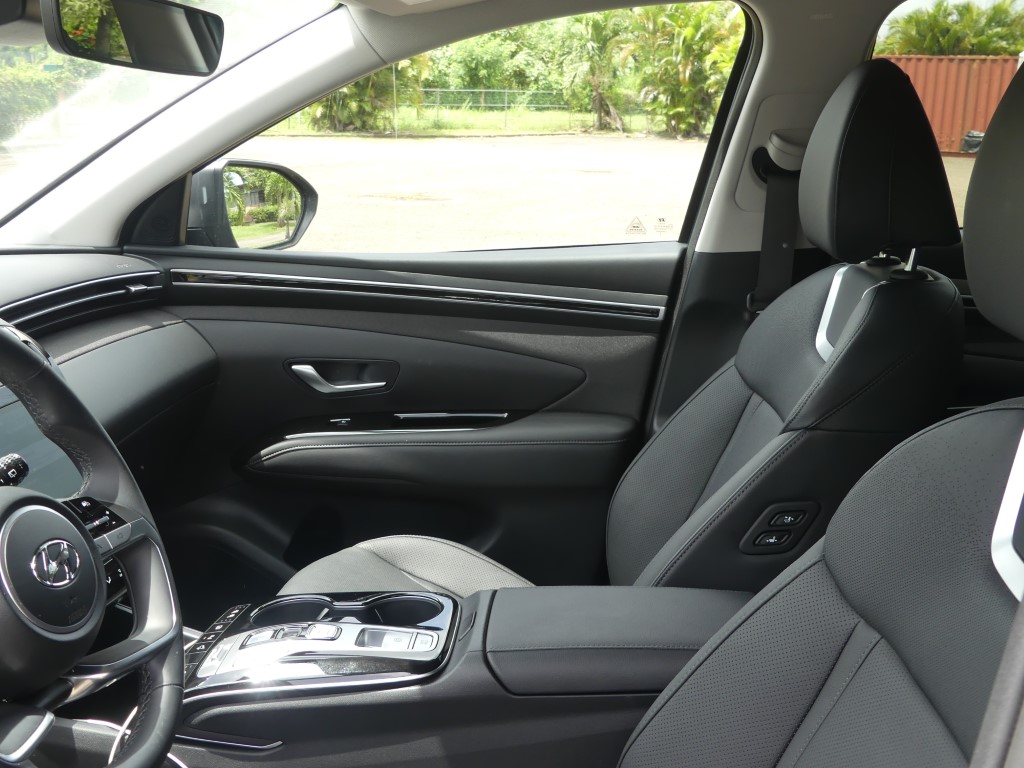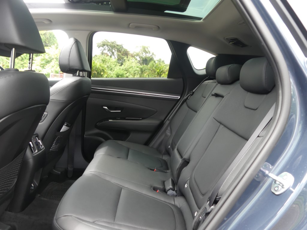 Tout en conservant des dimensions plus raisonnables que son grand frère le Santa Fé, le design s’en inspire, avec une énorme face avant et des lignes coupées au sabre pour renforcer son caractère dynamique. Hyundai lui offre toutefois quelques exclusivités stylistiques, telles que les optiques directement intégrées dans la calandre, ou encore une bande LED à l’arrière, faisant la jonction avec les deux feux. C’est évident : ce nouveau Tucson est bien plus “Agressif” que son prédécesseur. En marge de ces évolutions conséquentes, Hyundai s’est affairé à proposer un intérieur plus habitable. Avec une longueur augmentée de 20 mm, une largeur supérieure de 15 mm et un empattement allongé de 10 mm par rapport à la génération précédente, les passagers arrière profitent d’un gain d’espace aux jambes de 26mm. Ce dernier concerne aussi bien les versions 100% thermiques qu’électrifiées; les batteries étant placées sous les sièges arrière. Du côté du coffre, il offre jusqu’à 620 litres de stockage. Dans les faits, le nouveau Tucson surprend avec une habitabilité de haut niveau. On s’y sent aussi bien à l’avant qu’à l’arrière, même pour les grands gabarits.