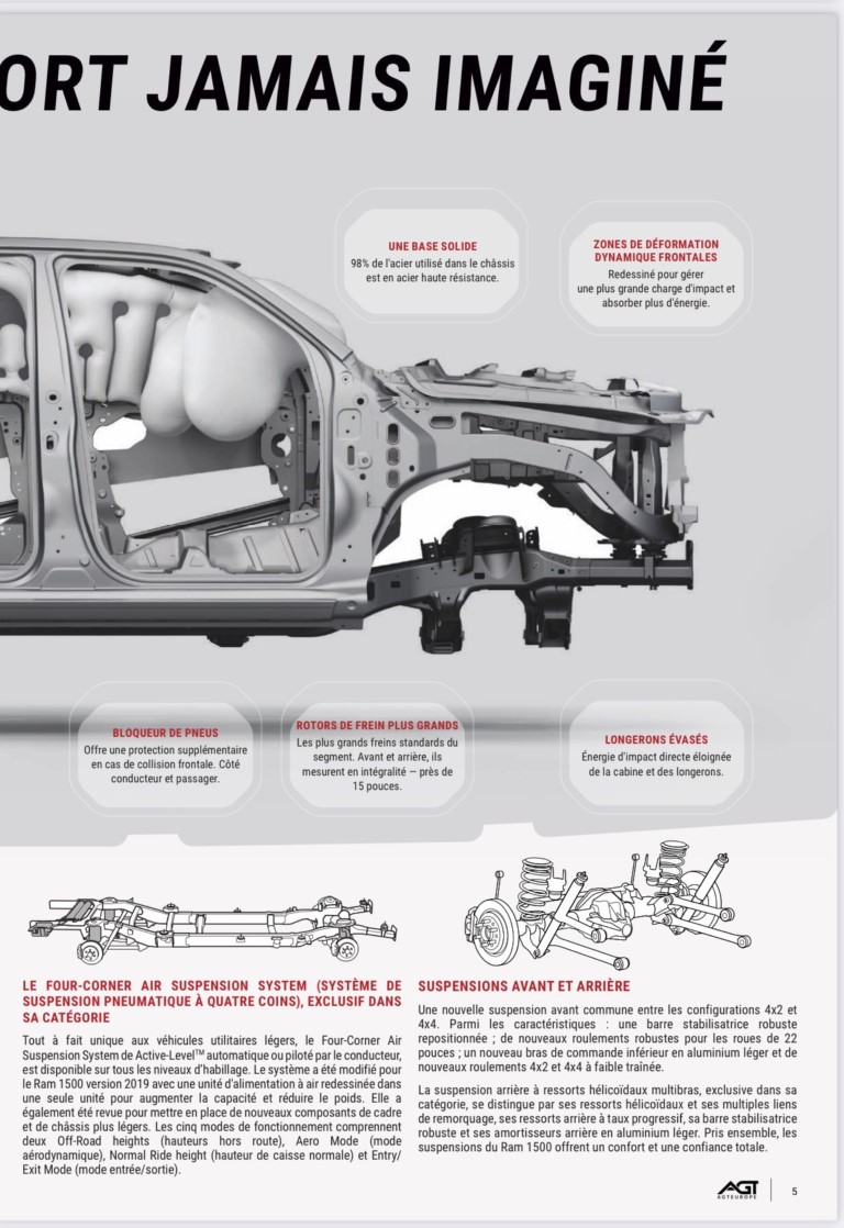 Tout à fait unique aux véhicules utilitaires légers, le Four-Corner Air Suspension System de Active-Level automatique ou piloté par le conducteur, est disponible sur tous les niveaux d’habillage.  Le système a été modifié pour le nouveau RAM avec une unité d’alimentation à air redessinée dans une seule unité pour augmenter la capacité et réduire le poids.