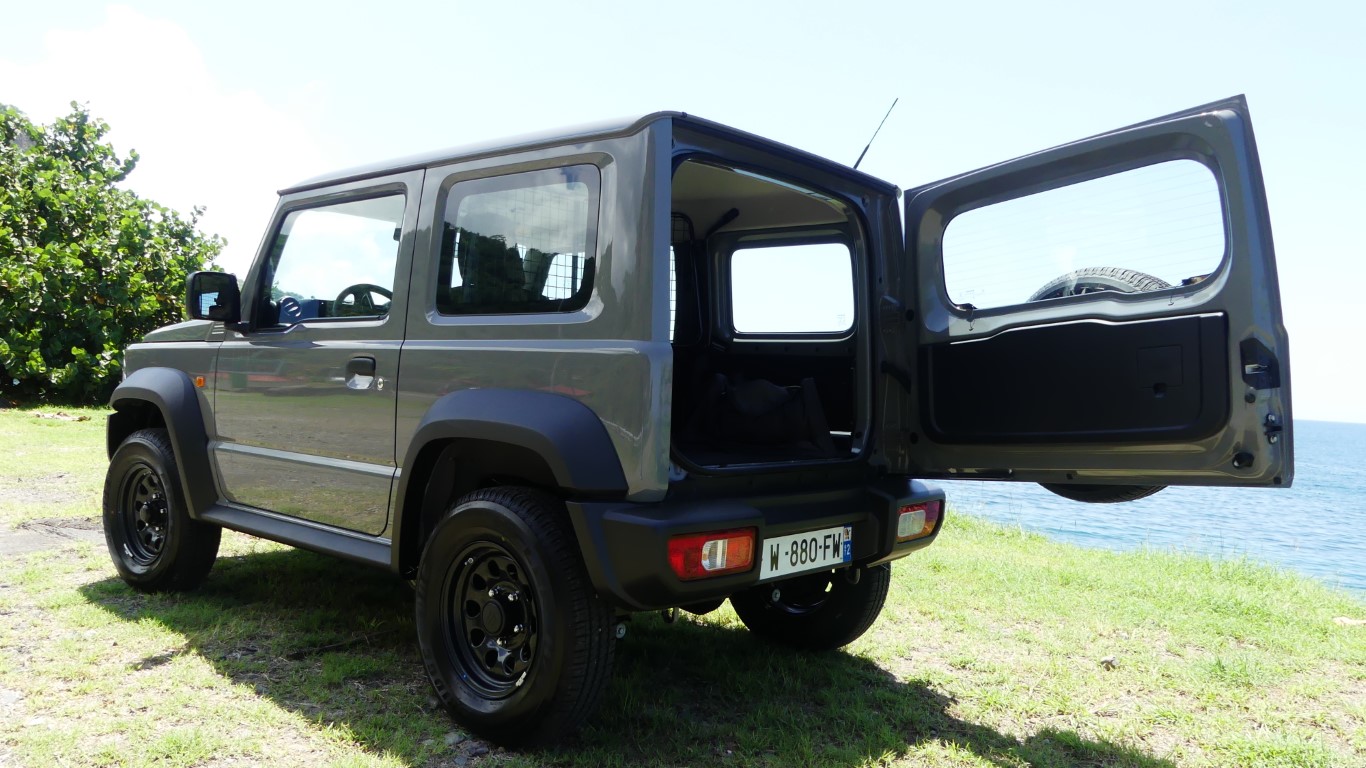 L’arrière, lui, est spécialement carré avec une porte qui s’ouvre vers le côté et qui donne accès à un petit coffre d’à peine 85 litres sauf à baisser un ou deux des sièges passagers… Oui le Jimny peut recevoir quatre adultes de tailles moyennes mais c’est au choix… Deux adultes et un grand coffre de 830 litres avec les deux sièges arrières rabattus ou quatre adultes et 85 litres de capacité soit presque rien… Cette face arrière reçoit la roue de secours impossible à loger ailleurs, mais le tout devient très esthétique et confère à notre Jimny un peu plus encore, une allure d’aventurier…