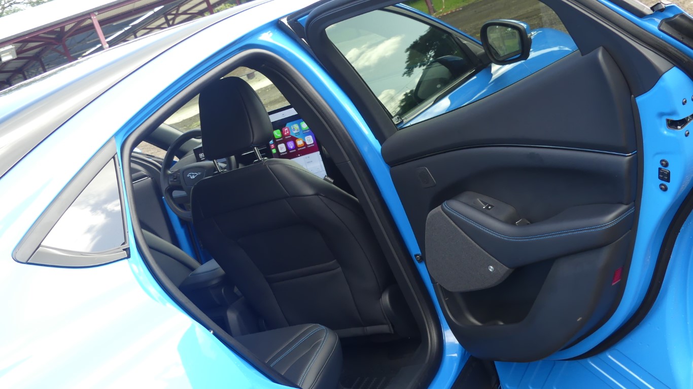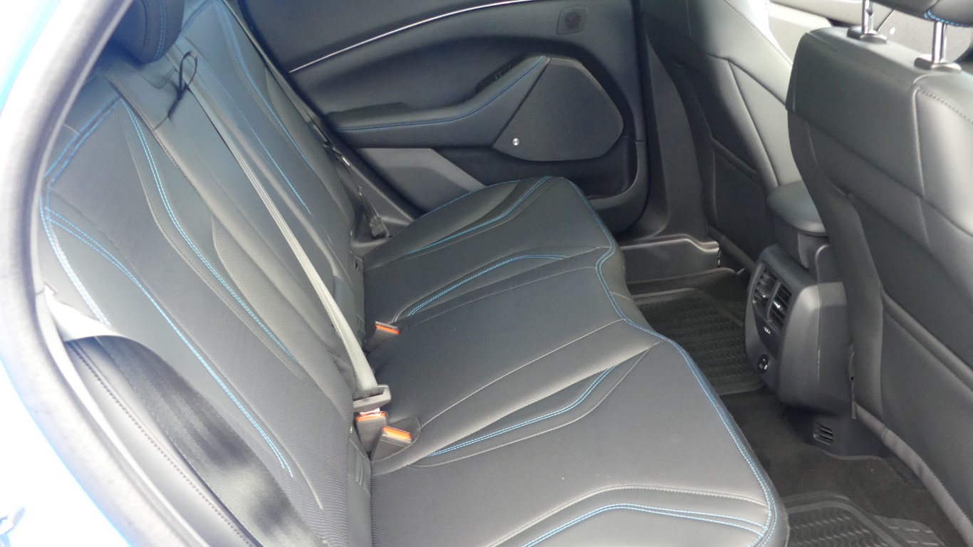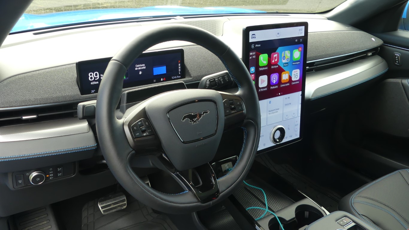 Voyons comment dans le temps, Mike Chevalier chef des ventes et ses équipes Ford vont propulser la Mach-E sur le marché local de la voiture électrique. De sérieux concurrents sont sur papier et sur le terrain mais le SUV Mustang à quelques atouts magiques sur sa fiche technique… Je relève également la présence des volets actifs dans le bas du pare-chocs pour refroidir les composants. À l’avant comme à l’arrière, la signature lumineuse est, selon moi, en adéquation parfaite avec le caractère moderne et dynamique de cette auto. D’ailleurs, le SUV FORD Mach-e est assurément la plus technologique des Mustang, mais sans doute aussi de toutes les autos conçues par Ford. Miam…