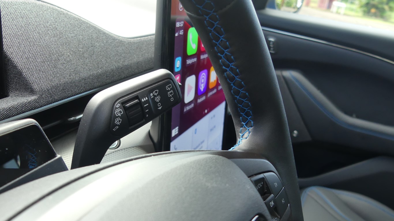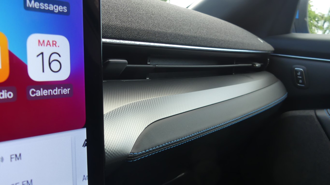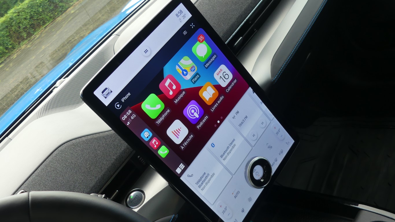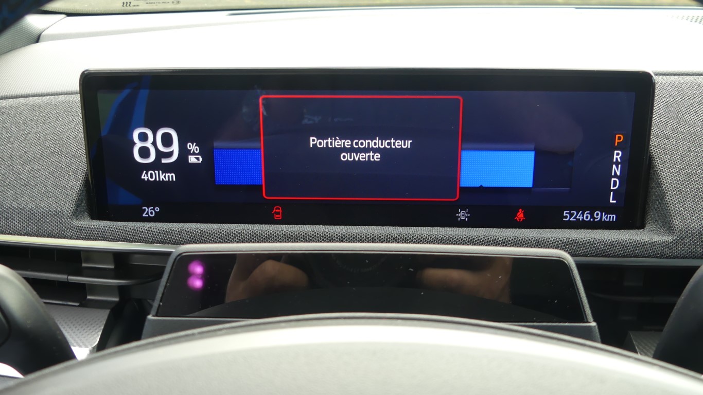 Cet espace à été plus grand afin d’afficher les informations les plus utiles, qu’il s’agisse du GPS, de CarPlay ou d’Android Auto par exemple. Pour finir, les réglages de la voiture sont accessibles via un volet qui prend place tout en haut de l’écran. L’affichage bénéficie d’une définition et d’une luminosité adaptées (notamment pour ne pas voir les traces de doigts). Nous n’avons pas déploré de reflets et un mode nuit est également prévu qui peut aussi être activé manuellement. L’instrumentation est également au format numérique avec un écran plus petit en mode paysage. Placé derrière le volant, il est parfaitement lisible et regroupe toutes les informations utiles : autonomie, vitesse, limitation de vitesse actuelle et rappel de navigation.