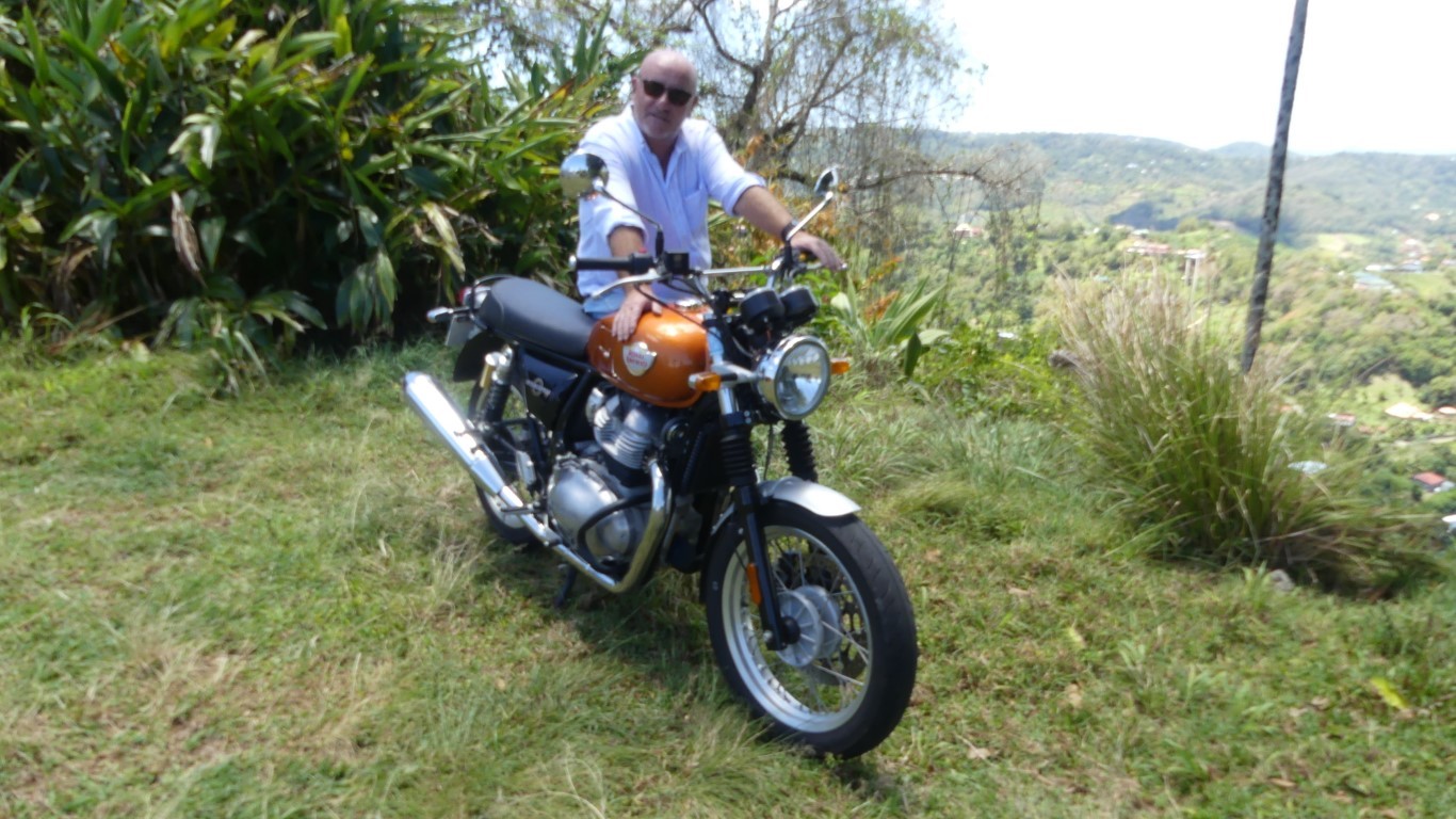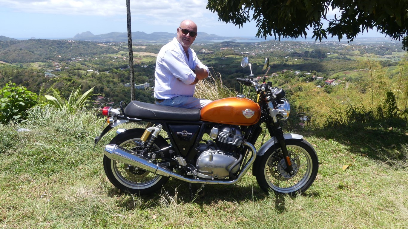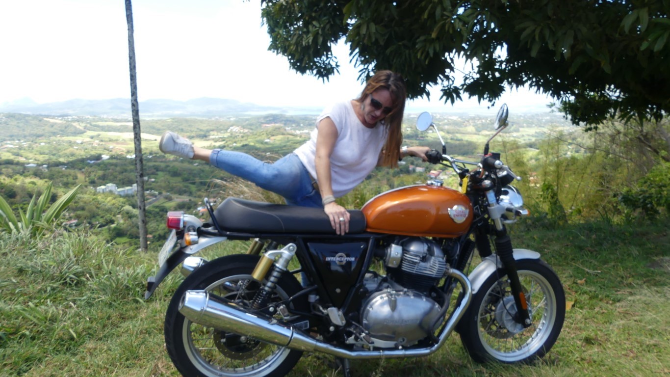 Royal Enfield Interceptor 650 devant des cocotiers à Basse-Pointe en Martinique