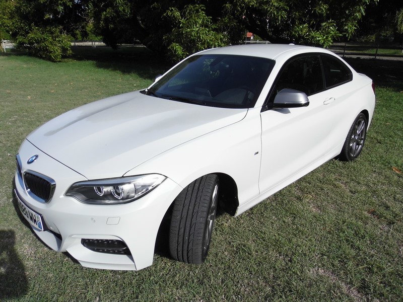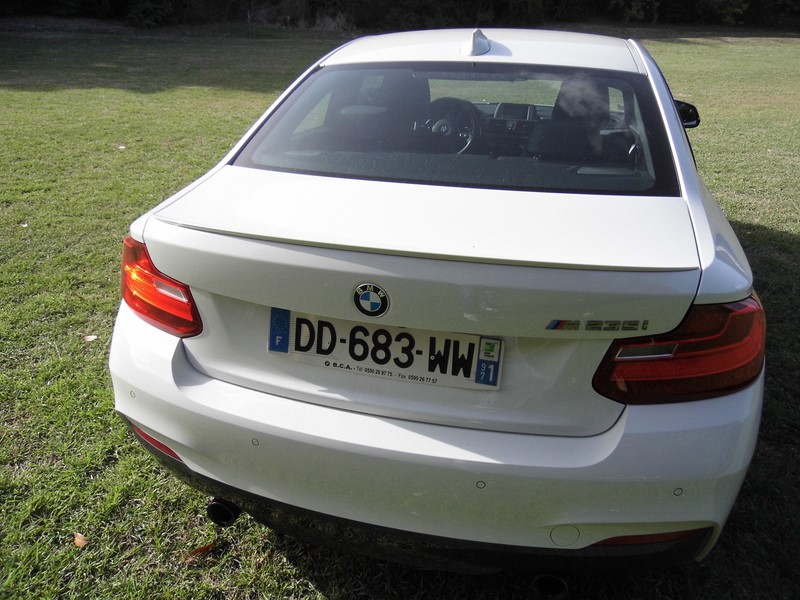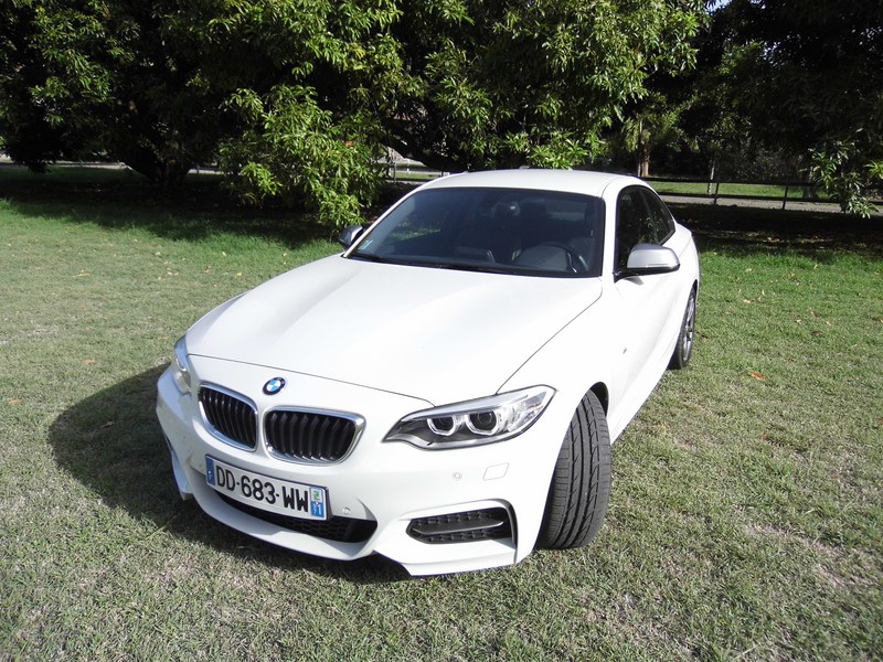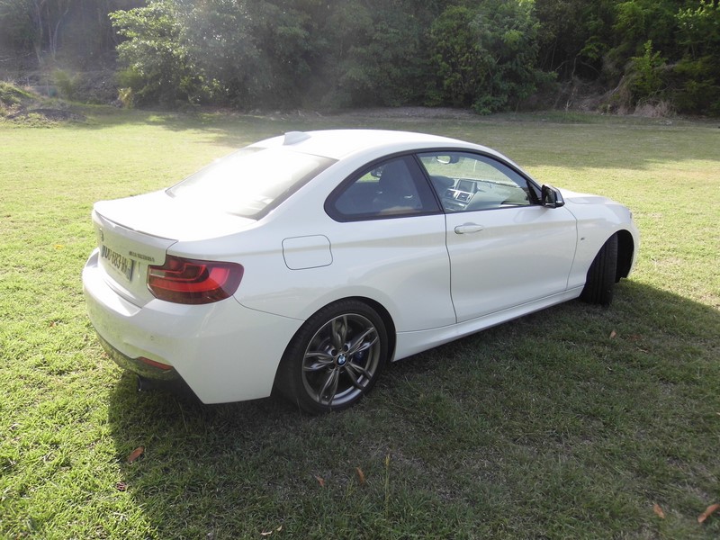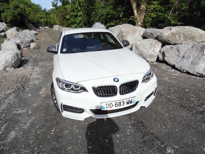 Pour optimiser les performances de cette M235i, BMW lui à réservé un blocage de différentiel M Performance. Lorsque le contrôle dynamique de stabilité (DSC) est déconnecté,il permet de répartir le couple sur les roues arrière pour optimiser la traction. Lorsqu’une roue adhère moins bien au sol, le couple excédentaire est redistribué sur une autre roue grâce à un effet de blocage. La distribution de la puissance est ainsi régulée, optimise la traction et permet par exemple des accélérations encore plus dynamiques pour sortir d’un virage. Côté sensations: Direction les12 heures de Sainte-Marie ou nous rejoignons Denis Chanel qui lui va piloter une Clio de 140 cv… Je suis tenté de lui prêter 100 cv de plus pour être sûr de sa première place? Trêve de plaisanterie… Démoniaque! Epoustouflant! Fulgurante… Une fois de plus nous retrouvons les 4 modes de conduites BMW: Eco, confort, sport et sport +… Le mode Sport + est à déconseiller absolument pour passagers cardiaques… Ce mode + minimise les effets du DSC et redonne au pilote une bonne autonomie de conduite… De fait je trouve toutes les sensations d’un pilotage cérébral… Merci Monsieur ‘M’… Confort de conduite, sous bassement idéal, Regard perçant, naseaux effilés et ligne de caisse creusée, comme sculptée par le vent, cette Série 2 Coupé se fait bien plus agressive que la Série 1 Coupé qu’elle à remplacé. Alors quand comme sur cette M235i on ajoute des boucliers agressifs, un diffuseur arrière apparent et des jantes de 18" au travers desquelles on distingue des étriers de freins peints, je comprends maintenant pourquoi la nouvelle venue porte le "M" de Motorsport, c’est que son tempérament en est digne!!! Comment te dire cher internaute??? Il faut l’essayer si tu aimes les sensations fortes, si tu aimes la gagne et enfin si tu aimes l’élégance des juments sauvages… Bénit soit 'M' assurément... Jean-Marc Wollscheid pourGrantomobil l’émission… Pour essayer la BMW M235i chez BMW Martinique c'est ici !!! La fiche : BMW M235i xDrive 326 cv à partir de : 47700 euros... Equipements : Sélection véhicules concernés par COP-Etendue des mesures CO2-Paquet supplém. selon EU-Volant multifonction-Pneus à capacité de roulage à plat-M Frein sport-Jeu antivol de roues-Roue AL BMW M à rayons doubles 436-Boîte automatique sport-Direction Sport variable-Caméra de recul-Rétro int/ext à commutation automatique-Rétroviseur intérieur jour/nuit automat.-Siège sport-Kit rangement-Accoudoir central avant coulissant-Baguettes accentuation bleu mét. mat-intérieures aluminium Hexagon-Lave-projecteurs-Système d'aide au stationnement (PDC)-Détecteur de pluie-Phare xénon-Climatiseur automatique-Tachymètre kilométrique-Kit éclairage-Assistant feux de route-Désactivation airbag passager-Radio BMW Professional-Système de haut-parleurs HiFi-DVD zone 2-éléphon. confort av. Smartphone étendu-Pilotage Infotainment-Chassis sport M-Volant en cuir M-Kit aérodynamique M-Poli brillant Shadow line-Pavillon anthracite-Alerte d'oubli de ceinture acoustique-Version en langue française-Documentation de bord français-Dummy-SALAPA-Numéro de châssis visible de l'extérieur-Protection piétons active-Panneau-Kit protection expédition-Protection peau extérieure
