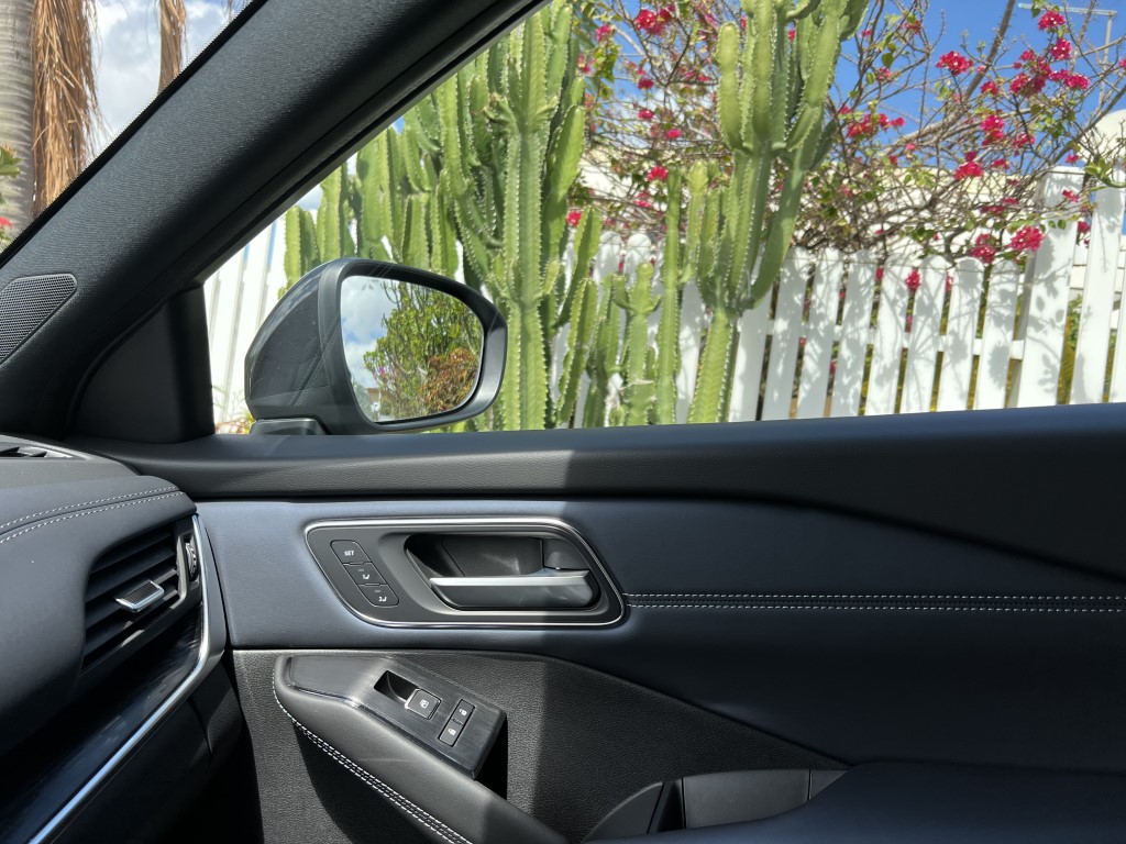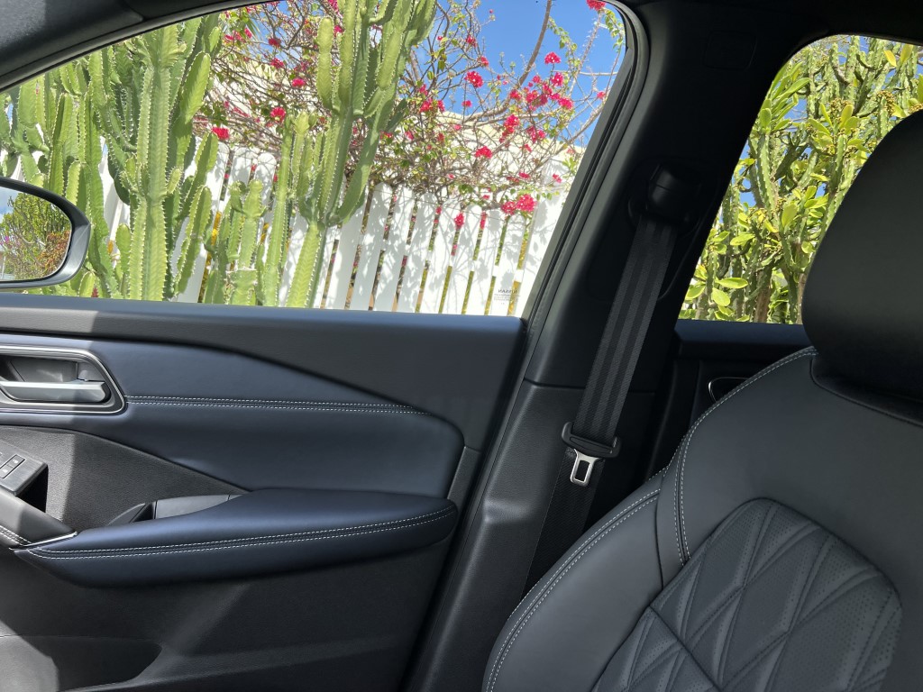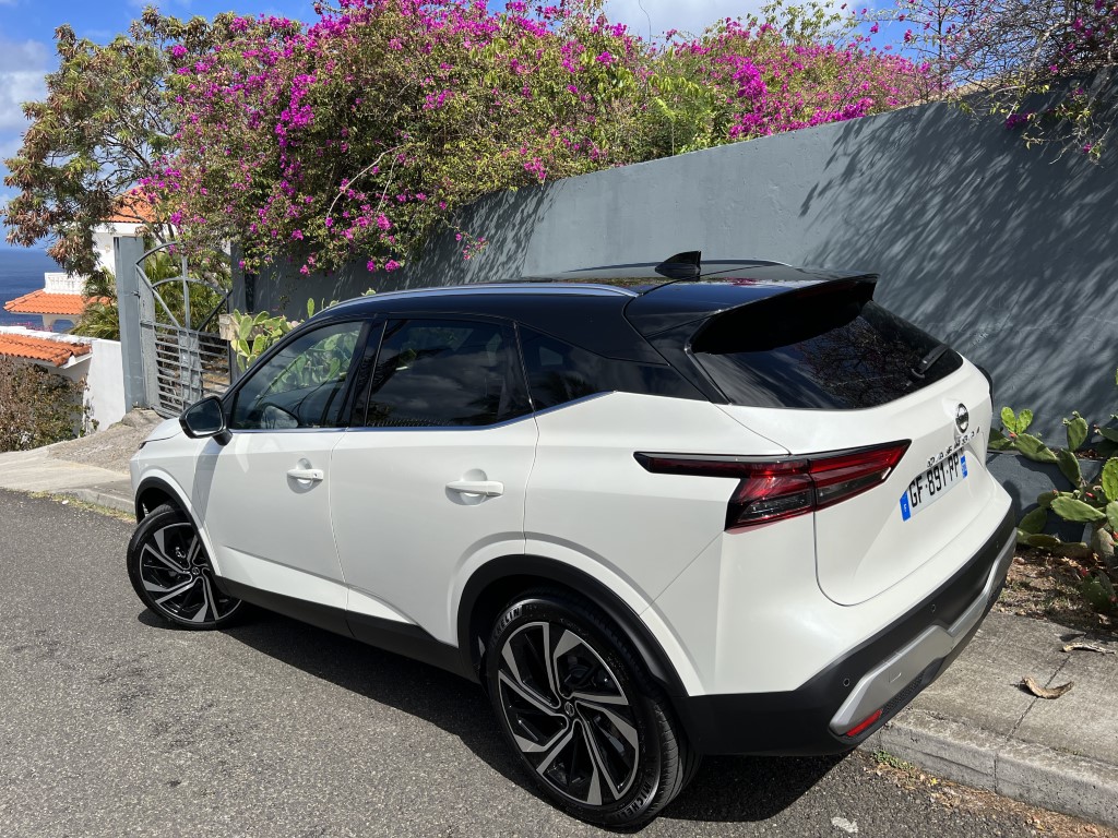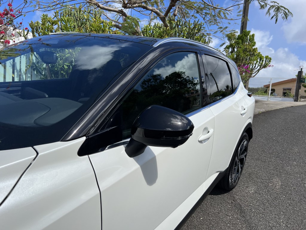 Le Qashqai a été dessiné en Europe. Les designers ont voulu lui offrir une « allure plus musculeuse et plus expressive ». Il y a un air de famille avec l’Ariya (voir ici), le crossover 100% électrique de Nissan. La nouvelle calandre en V, le toit flottant, la petite inscription Qashqai sur les ailes avant, participent à moderniser le dernier né du constructeur japonais. Grâce à la technologie des phares matriciel full LED, les designers ont pu mettre en oeuvre des phares très minces. Les feux de jour sont en forme de boomerang. On note l’apparition de prises d’air très fine, verticales, qui canalisent le flux vers les roues avant. Les amateurs de personnalisations, pourront opter pour des jantes en 20 pouce (19 par le passé). C’est très joli mais un peu moins compatible avec un usage tous chemins si important sur notre île… Plus long de 31 mn, le Qashqai fait bénéficier à ses occupants d’un peu plus d’espace à bord grâce un empattement, une hauteur et une largeur accrus (+19 mn, + 35 mn + 29mn).