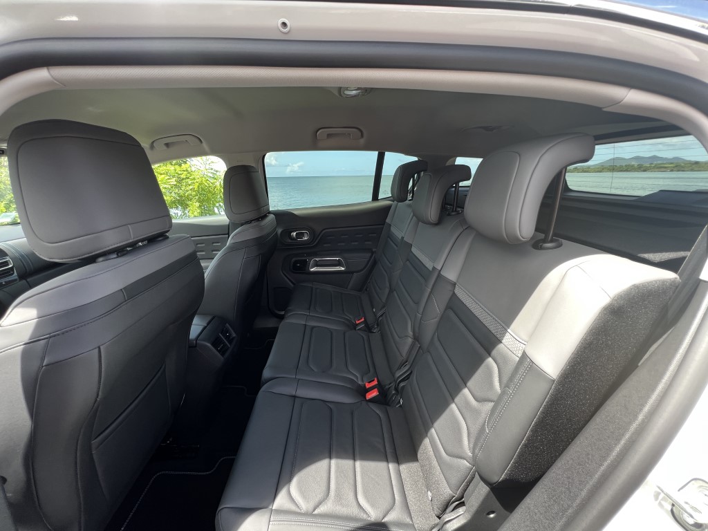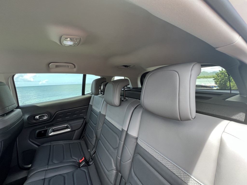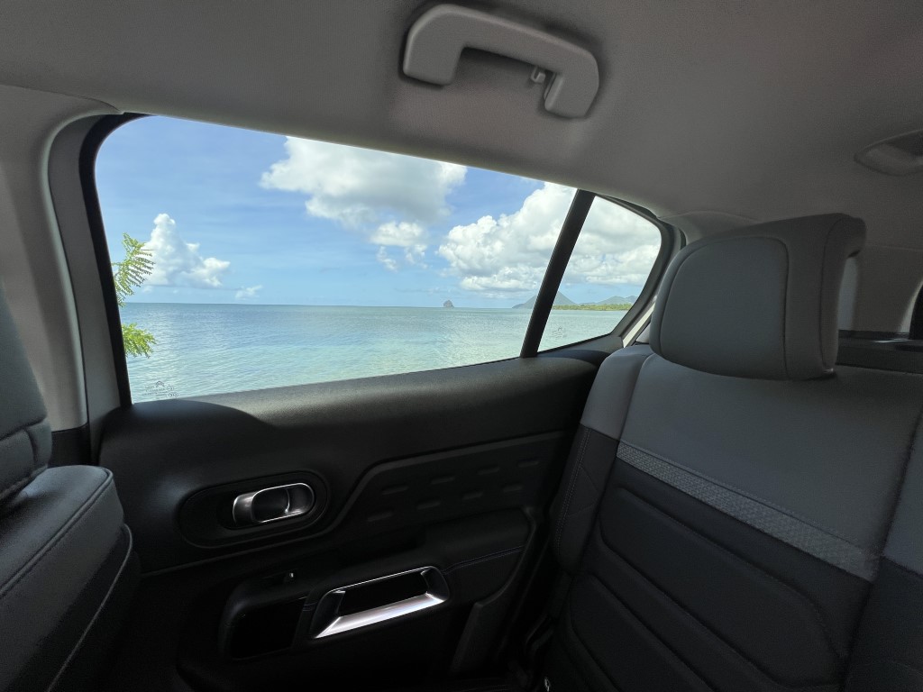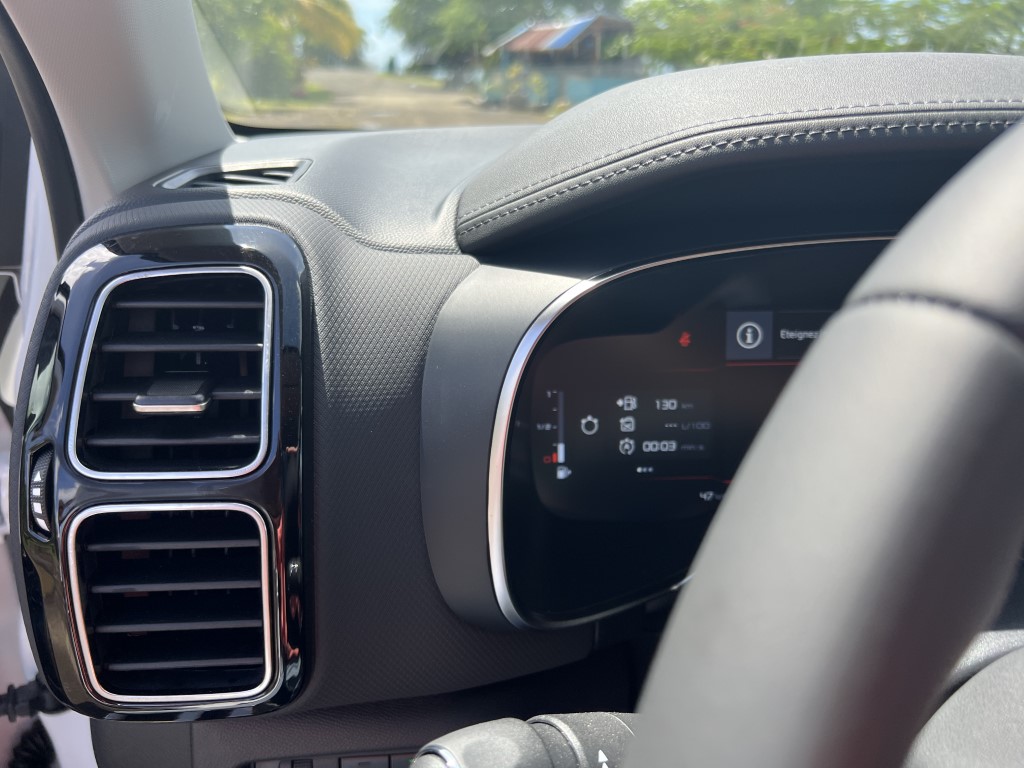 Côté moteur, Le nouveau Citroën C5 Aircross est disponible en motorisations essence (PureTech 130 S&S) ou diesel (BlueHDi 130 S&S) et de boîtes de vitesse manuelle ou automatique selon la finition. La version hybride rechargeable propose une motorisation Hybrid 225 avec une batterie li-ion HT 200V – 13,2 KWH de 55KM d’autonomie et un moteur thermique essence PureTech 180 avec boîte automatique 8 rapports EAT8. Le 3 cylindres turbo de 1,2L de 131CH de notre essai ce matin lui offre un couple raisonnable de 230Nm à 1750tr/min, bien secondé par sa boîte automatique à 8 rapports donc et très bien étagée, cette boîte EAT8 offre au nouveau C5 Aircross des performances suffisantes sur notre Rocade mais surtout sur les petites routes de notre île...