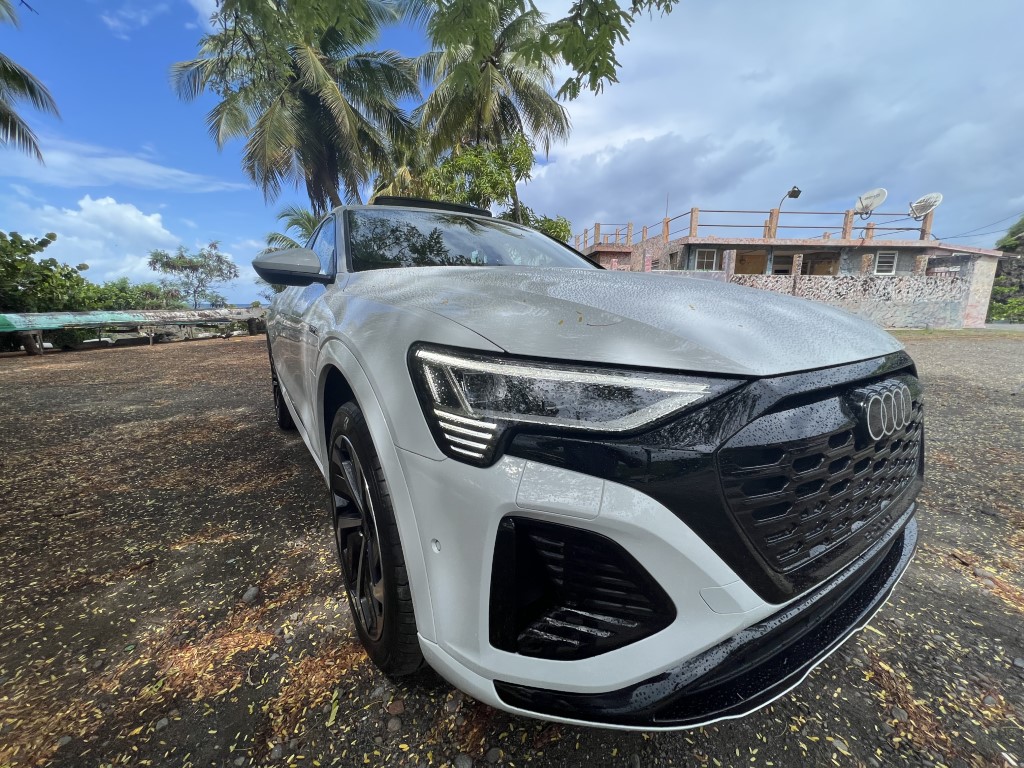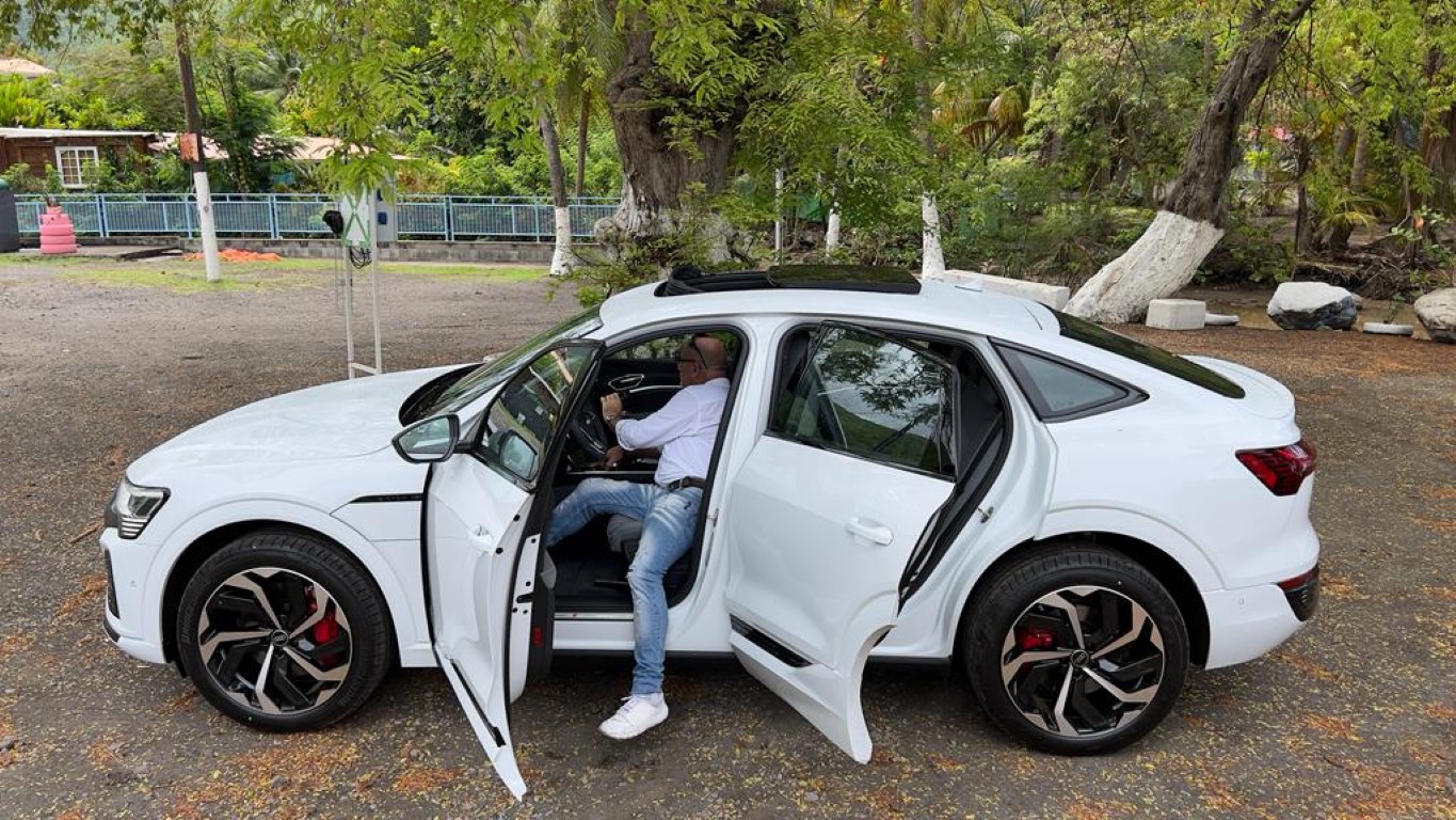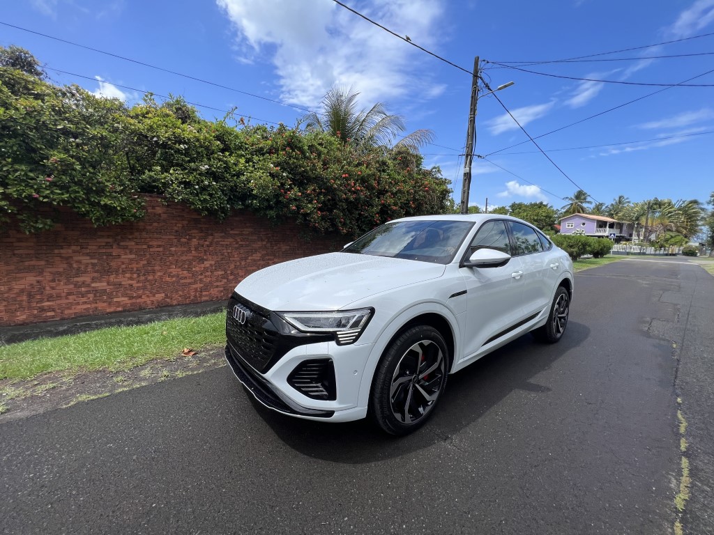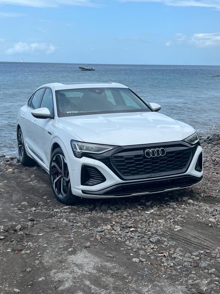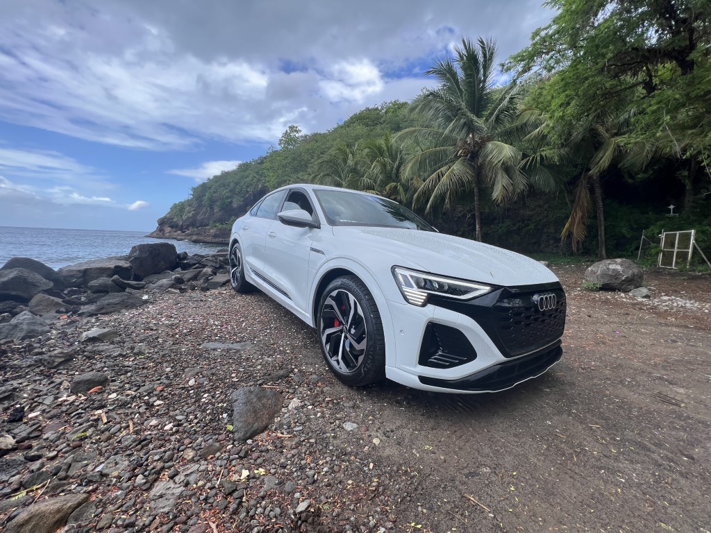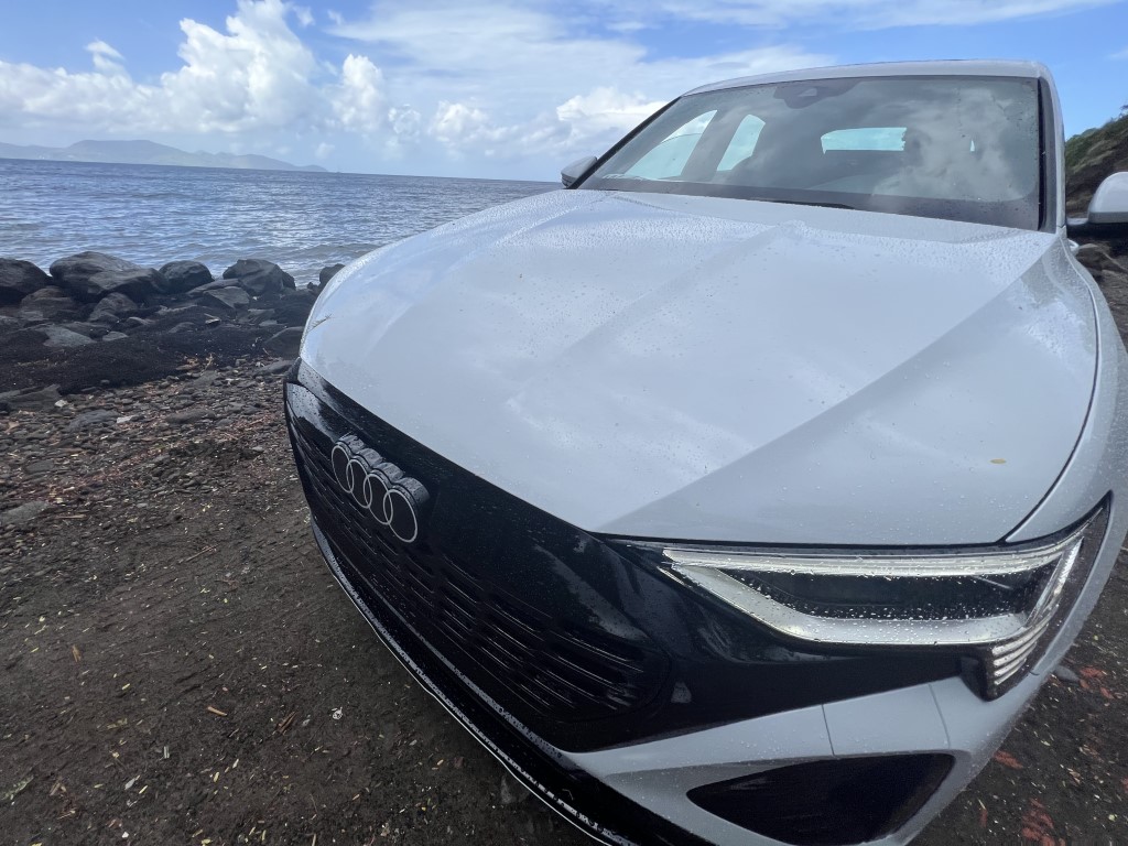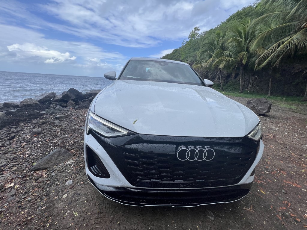 Et oui rappelons-nous ce modèle était le premier SUV de la marques aux anneaux lancé en 2018, aujourd'hui l’e-tron devient le Q8 e-tron. Derrière ce changement d’appellation qui le place en haut de gamme de l’offre électrique devant le Q4 e-tron et en attendant un Q6 e-tron, le Q8 e-tron 2023 fait prévaloir de multiples améliorations. Esthétiquement, on remarque en premier lieu le nouveau logo Audi de type 2D qui trône sur une calandre retravaillée avec un bandeau Led supérieur et le nouveau bouclier avant. A l’arrière, le bouclier est également retravaillé mais les feux ne changent pas. Dans l’habitacle, pas de révolution car rien ne change, hormis quelques apparats, et finalement l’amélioration la plus importante concerne l’intégration de nouvelles batteries qui améliorent considérablement l’autonomie. Départ de chez AUDI Martinique au pied de la Galléria...