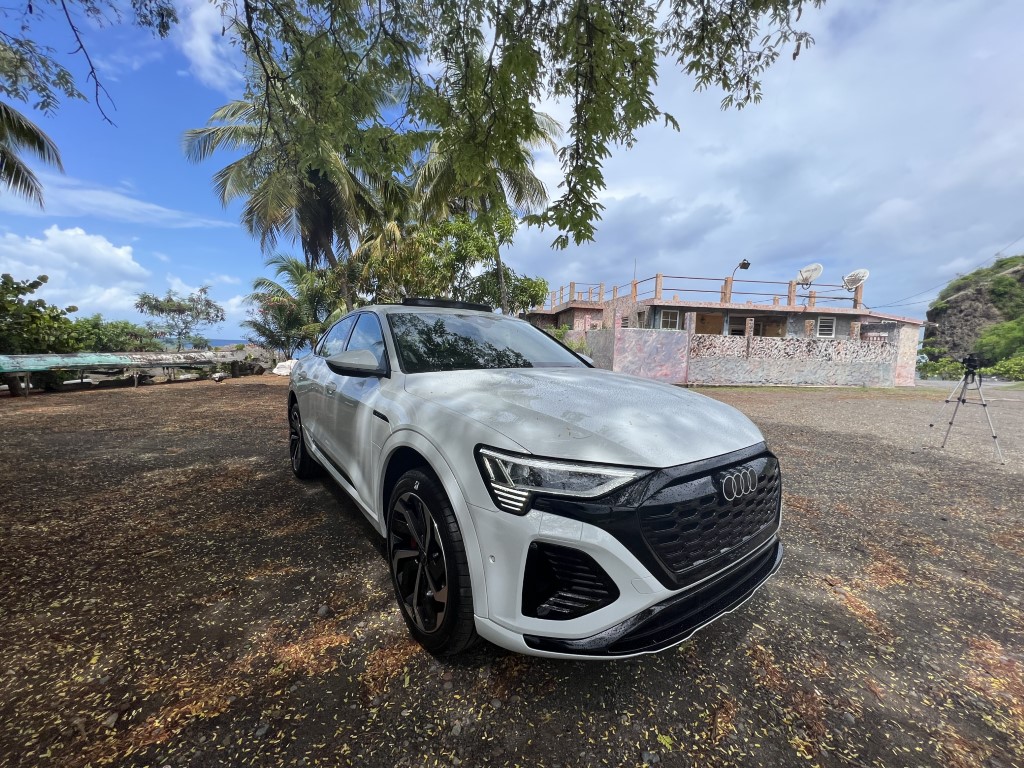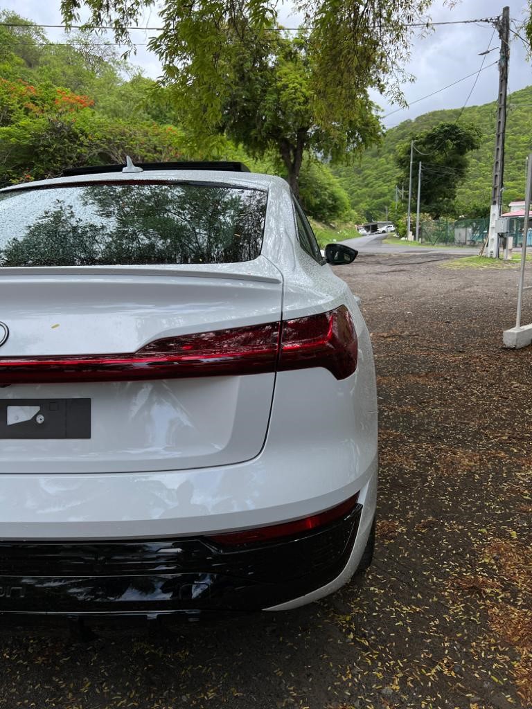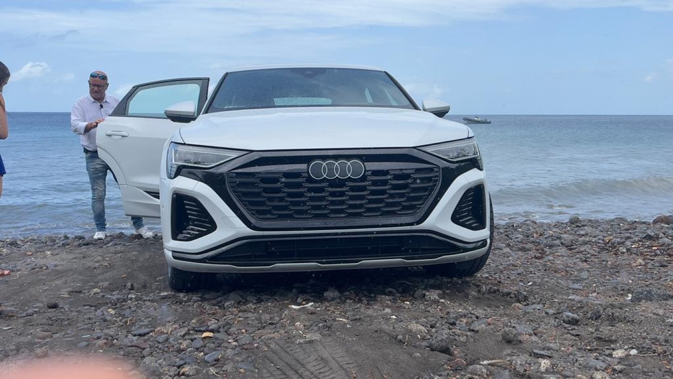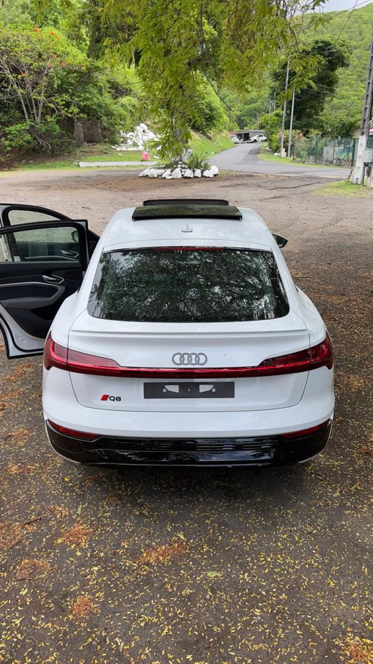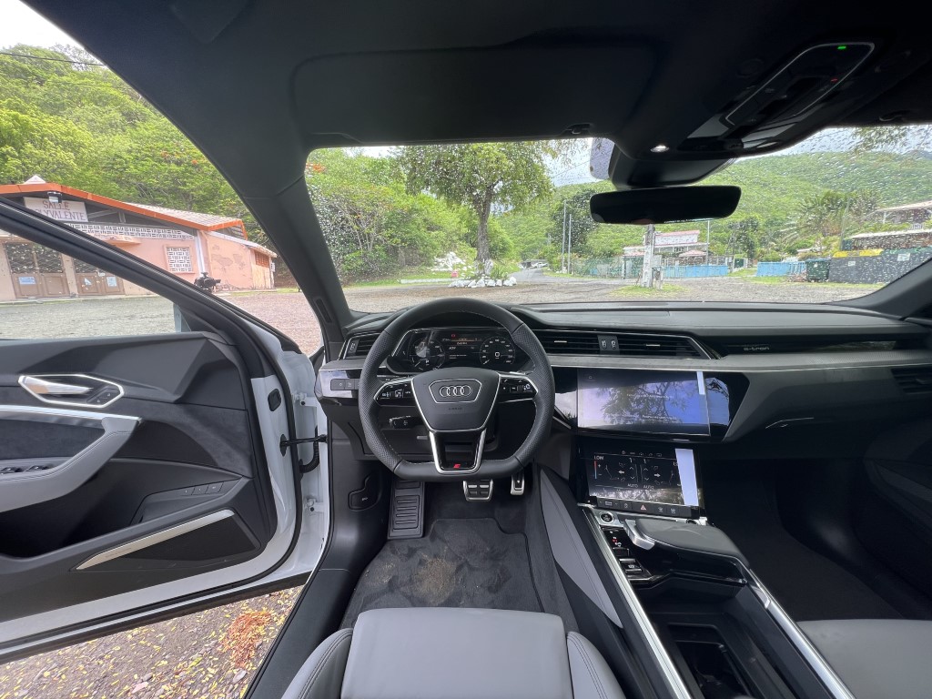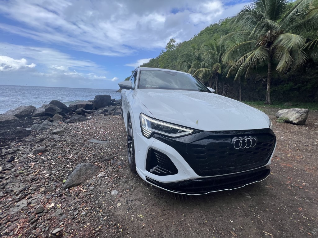 Et oui rappelons-nous ce modèle était le premier SUV de la marques aux anneaux lancé en 2018, aujourd'hui l’e-tron devient le Q8 e-tron. Derrière ce changement d’appellation qui le place en haut de gamme de l’offre électrique devant le Q4 e-tron et en attendant un Q6 e-tron, le Q8 e-tron 2023 fait prévaloir de multiples améliorations. Esthétiquement, on remarque en premier lieu le nouveau logo Audi de type 2D qui trône sur une calandre retravaillée avec un bandeau Led supérieur et le nouveau bouclier avant. A l’arrière, le bouclier est également retravaillé mais les feux ne changent pas. Dans l’habitacle, pas de révolution car rien ne change, hormis quelques apparats, et finalement l’amélioration la plus importante concerne l’intégration de nouvelles batteries qui améliorent considérablement l’autonomie. Départ de chez AUDI Martinique au pied de la Galléria...