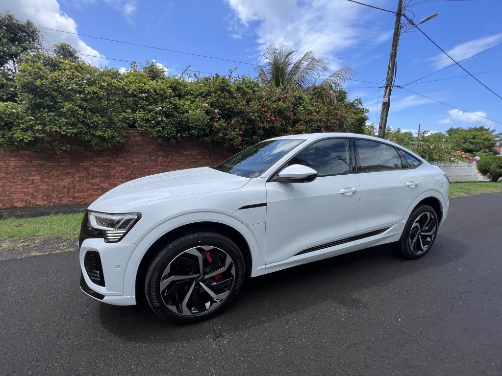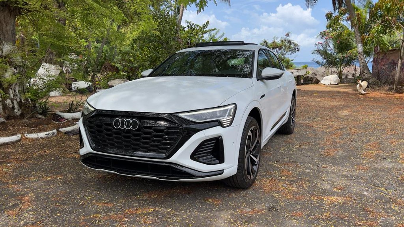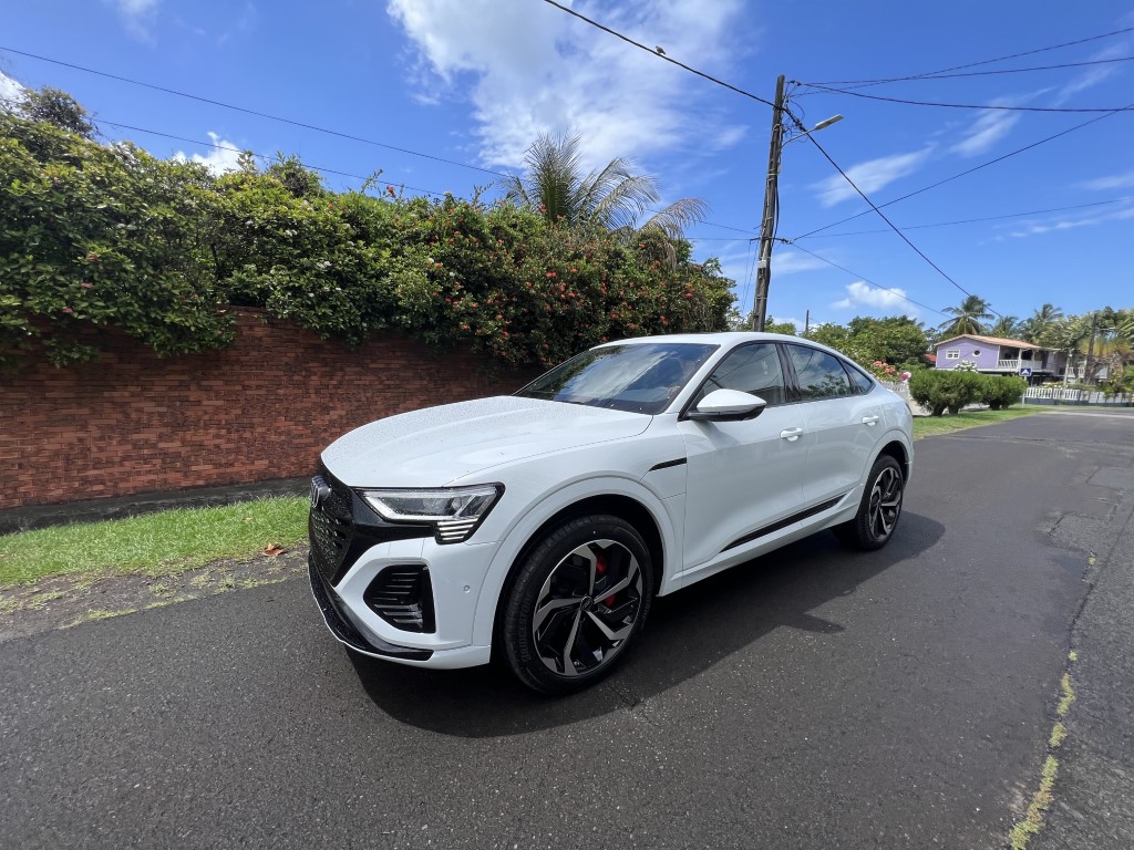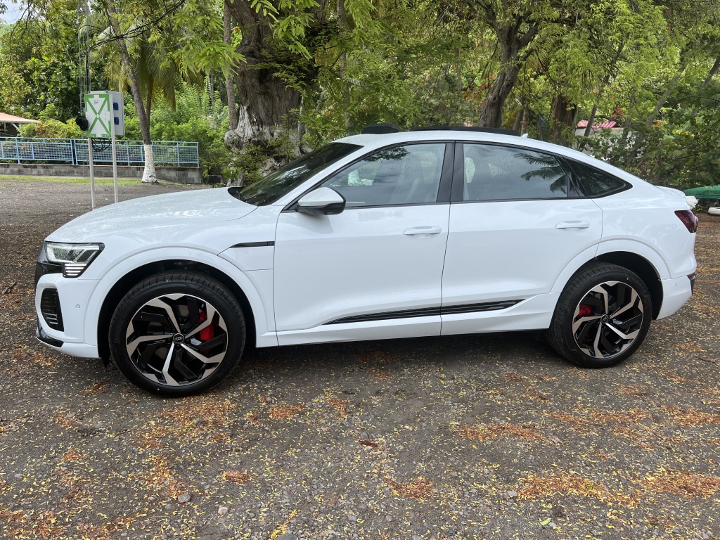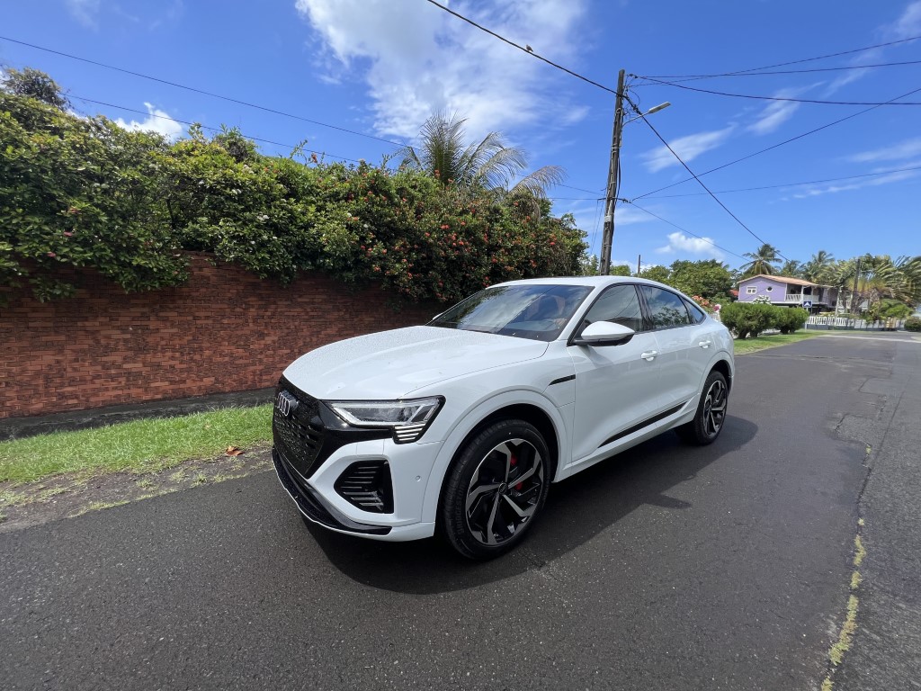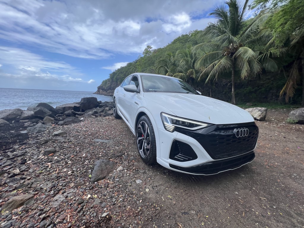 Et oui rappelons-nous ce modèle était le premier SUV de la marques aux anneaux lancé en 2018, aujourd'hui l’e-tron devient le Q8 e-tron. Derrière ce changement d’appellation qui le place en haut de gamme de l’offre électrique devant le Q4 e-tron et en attendant un Q6 e-tron, le Q8 e-tron 2023 fait prévaloir de multiples améliorations. Esthétiquement, on remarque en premier lieu le nouveau logo Audi de type 2D qui trône sur une calandre retravaillée avec un bandeau Led supérieur et le nouveau bouclier avant. A l’arrière, le bouclier est également retravaillé mais les feux ne changent pas. Dans l’habitacle, pas de révolution car rien ne change, hormis quelques apparats, et finalement l’amélioration la plus importante concerne l’intégration de nouvelles batteries qui améliorent considérablement l’autonomie. Départ de chez AUDI Martinique au pied de la Galléria...