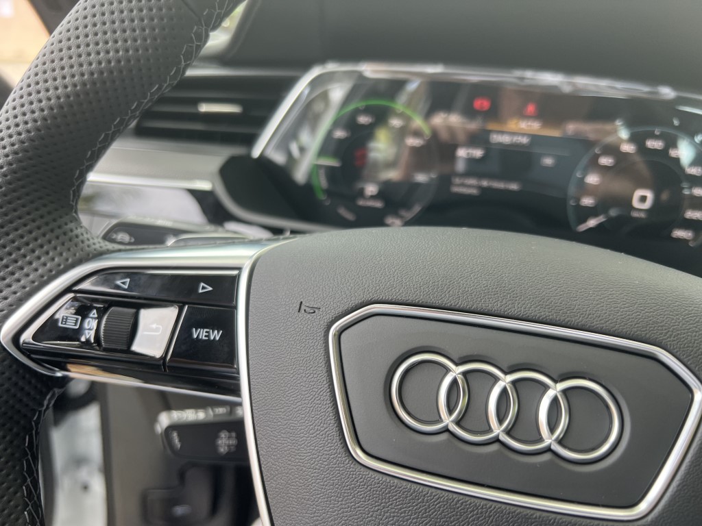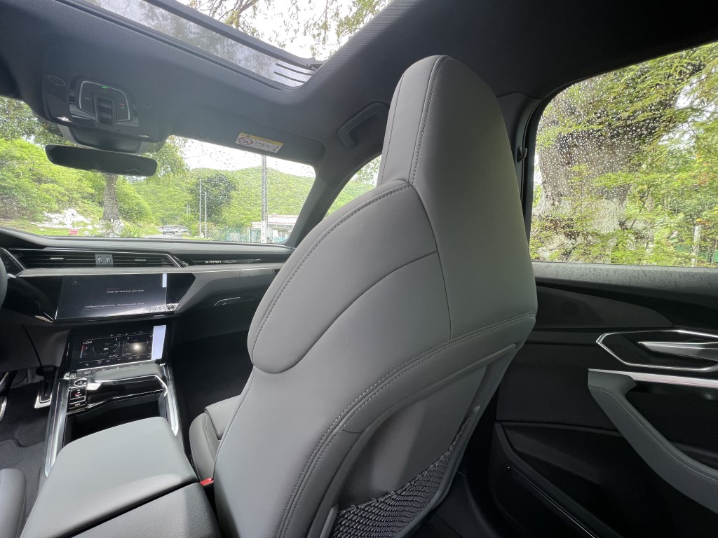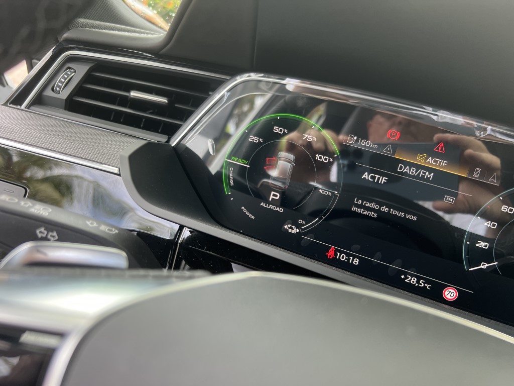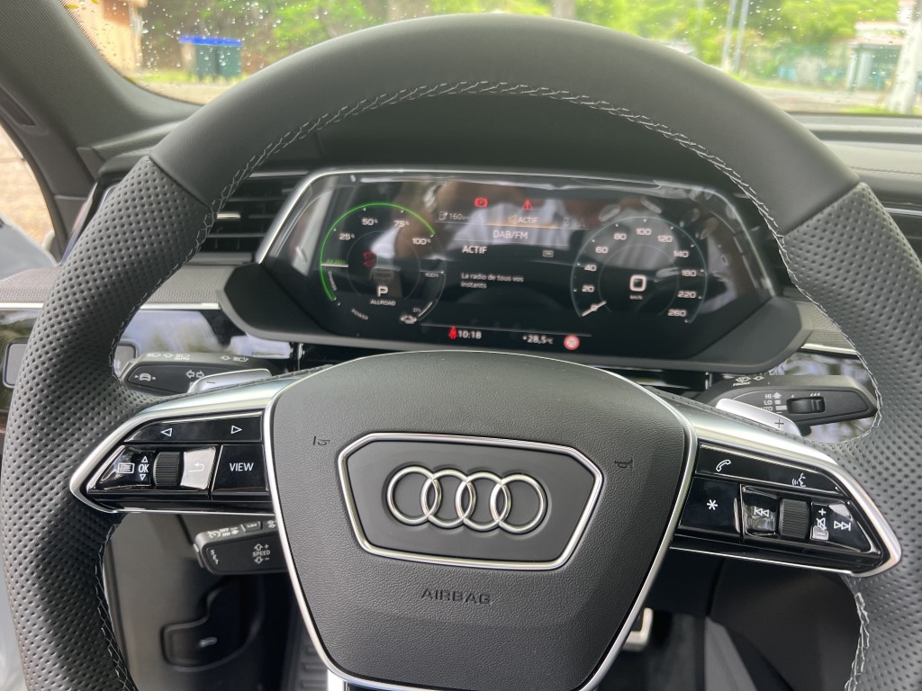 Placé au-dessus d’une console centrale flottante, la planche de bord reprend le concept général du design extérieur, avec des angles obliques qui l’orientent vers le conducteur. Le volant, non circulaire, est certes très joli et bien intégré, les palettes du volant permettent de gérer la force du freinage électrique à récupération sur trois niveaux. Les sièges sport en cuir noir compris dans le pack d’intérieur S-Line disposent d’une longueur d’assise réglable. Ils sont très texturés et procurent un bon maintien latéral. Les surpiqûres blanches ressortent bien à la lumière naturelle, diffusée par le toit panoramique en verre... Les trois places arrière disposent d’un espace suffisant pour les jambes et une hauteur acceptable pour un adulte de grande taille. Plusieurs fonctions sont disponibles via l’application myAudi, comme par exemple la pré-climatisation avant de partir. A noter que Android Auto et Apple Car Play sont disponibles, sans fil, via Bluetooth.