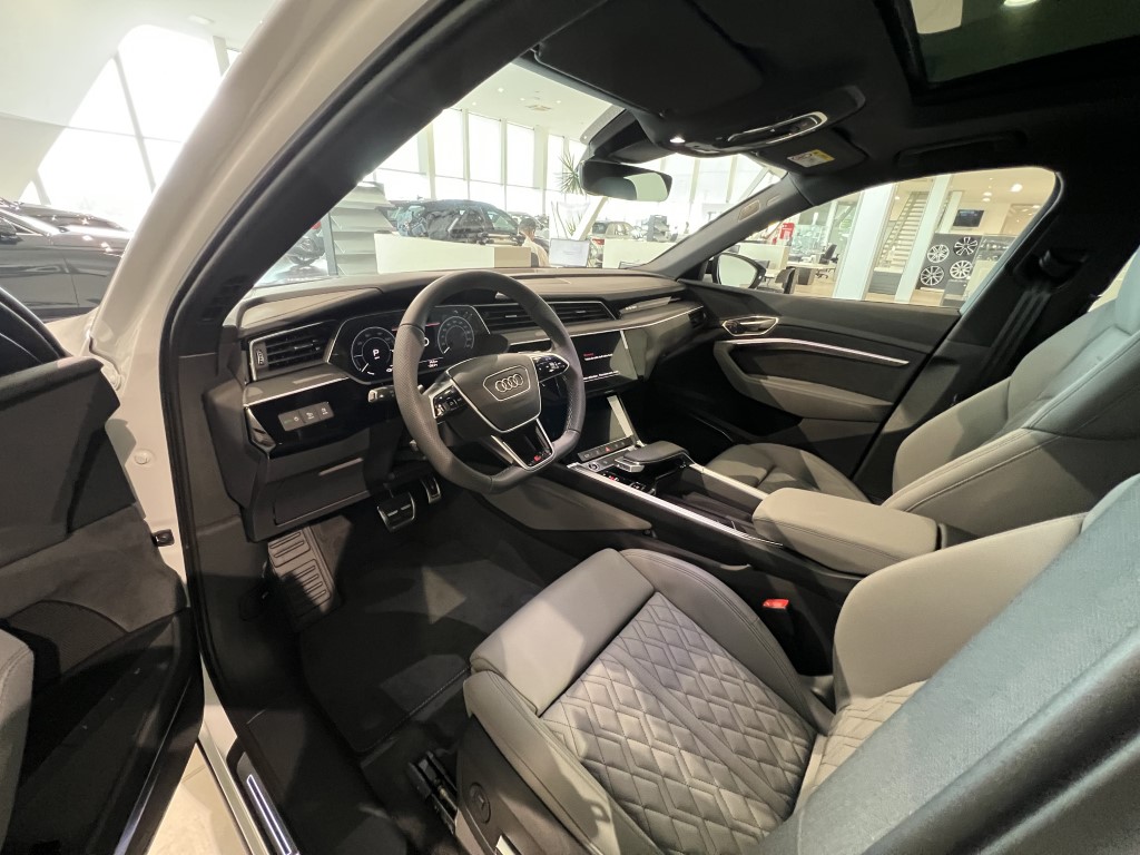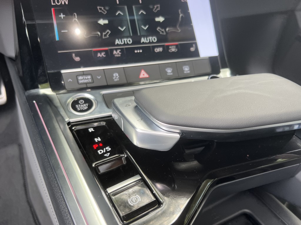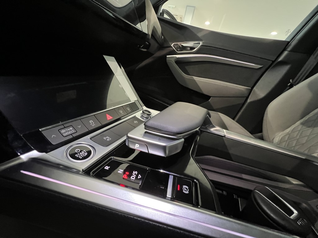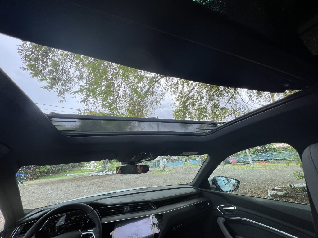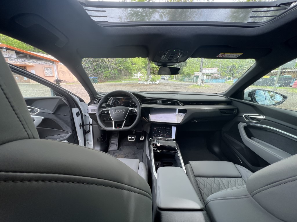 Placé au-dessus d’une console centrale flottante, la planche de bord reprend le concept général du design extérieur, avec des angles obliques qui l’orientent vers le conducteur. Le volant, non circulaire, est certes très joli et bien intégré, les palettes du volant permettent de gérer la force du freinage électrique à récupération sur trois niveaux. Les sièges sport en cuir noir compris dans le pack d’intérieur S-Line disposent d’une longueur d’assise réglable. Ils sont très texturés et procurent un bon maintien latéral. Les surpiqûres blanches ressortent bien à la lumière naturelle, diffusée par le toit panoramique en verre... Les trois places arrière disposent d’un espace suffisant pour les jambes et une hauteur acceptable pour un adulte de grande taille. Plusieurs fonctions sont disponibles via l’application myAudi, comme par exemple la pré-climatisation avant de partir. A noter que Android Auto et Apple Car Play sont disponibles, sans fil, via Bluetooth.