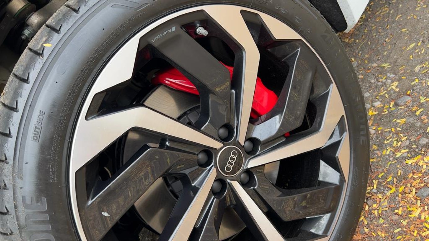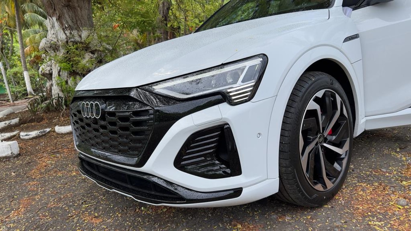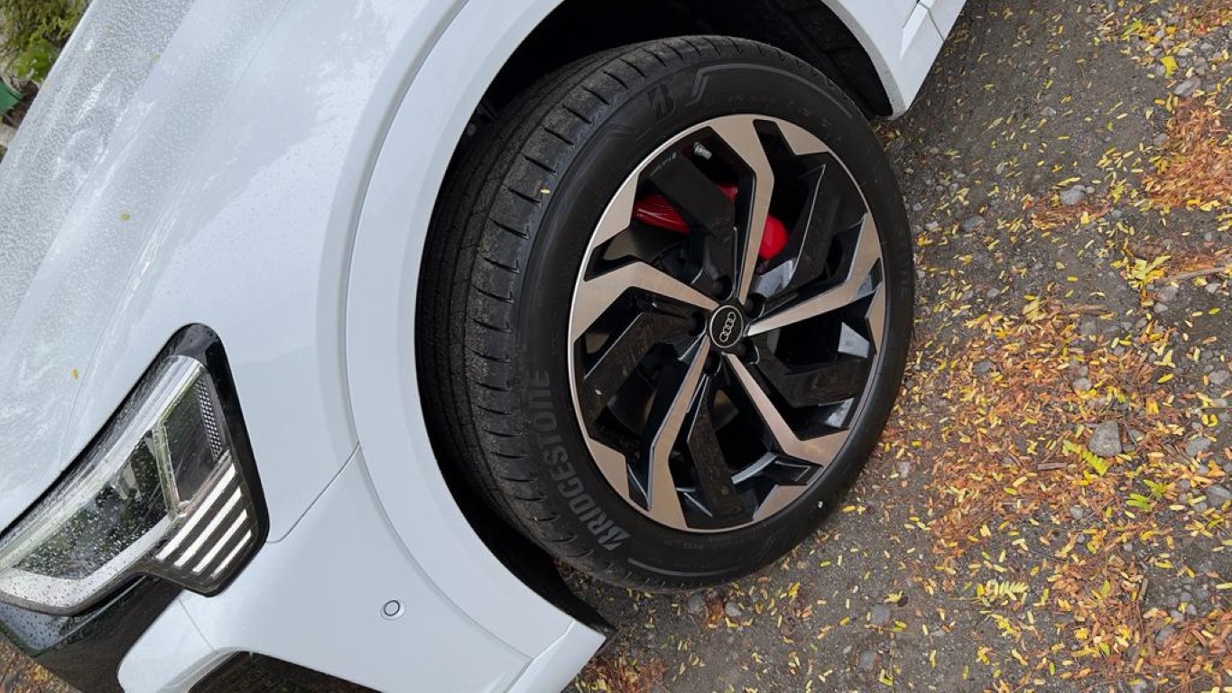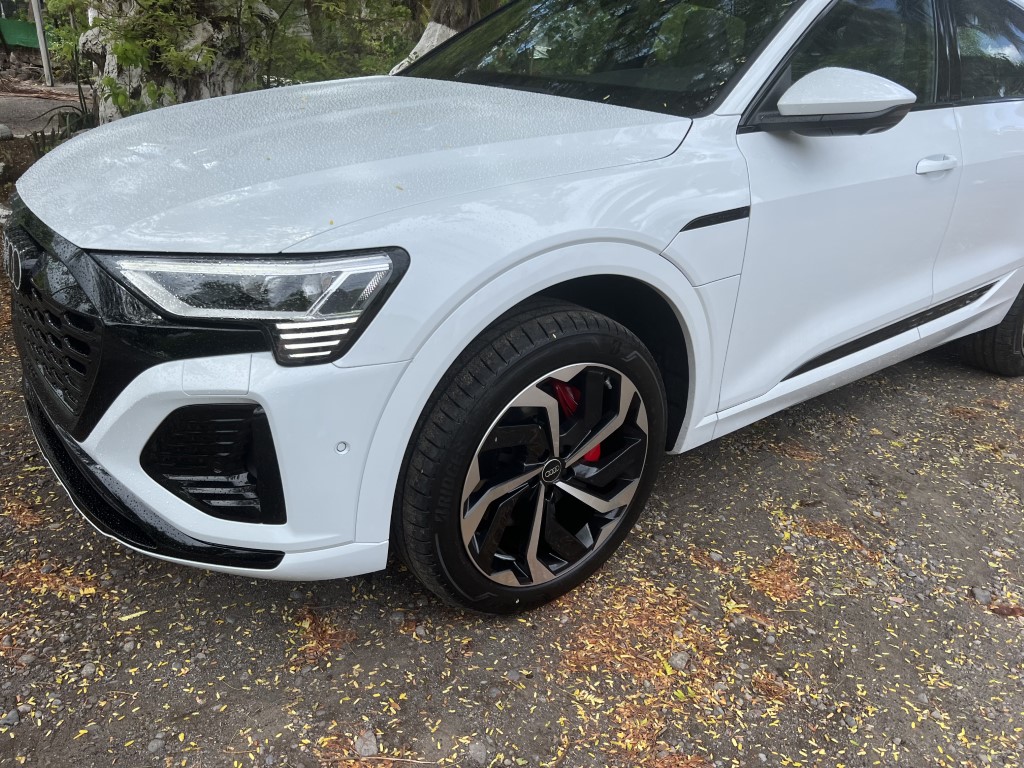 Le SUV électrique chausse des jantes « rotor aero » à 5 bras de 21 pouces partiellement pleines, afin de diminuer la traînée. Même sur cette version non-Sportback, la vitre arrière est assez inclinée, ce qui fait perdre du volume au coffre au profit de la fluidité de la ligne. Les feux arrière reprennent l’identité visuelle de la marque aux anneaux, avec le bandeau rouge sur toute la largeur de caisse et les feux en double flèche.