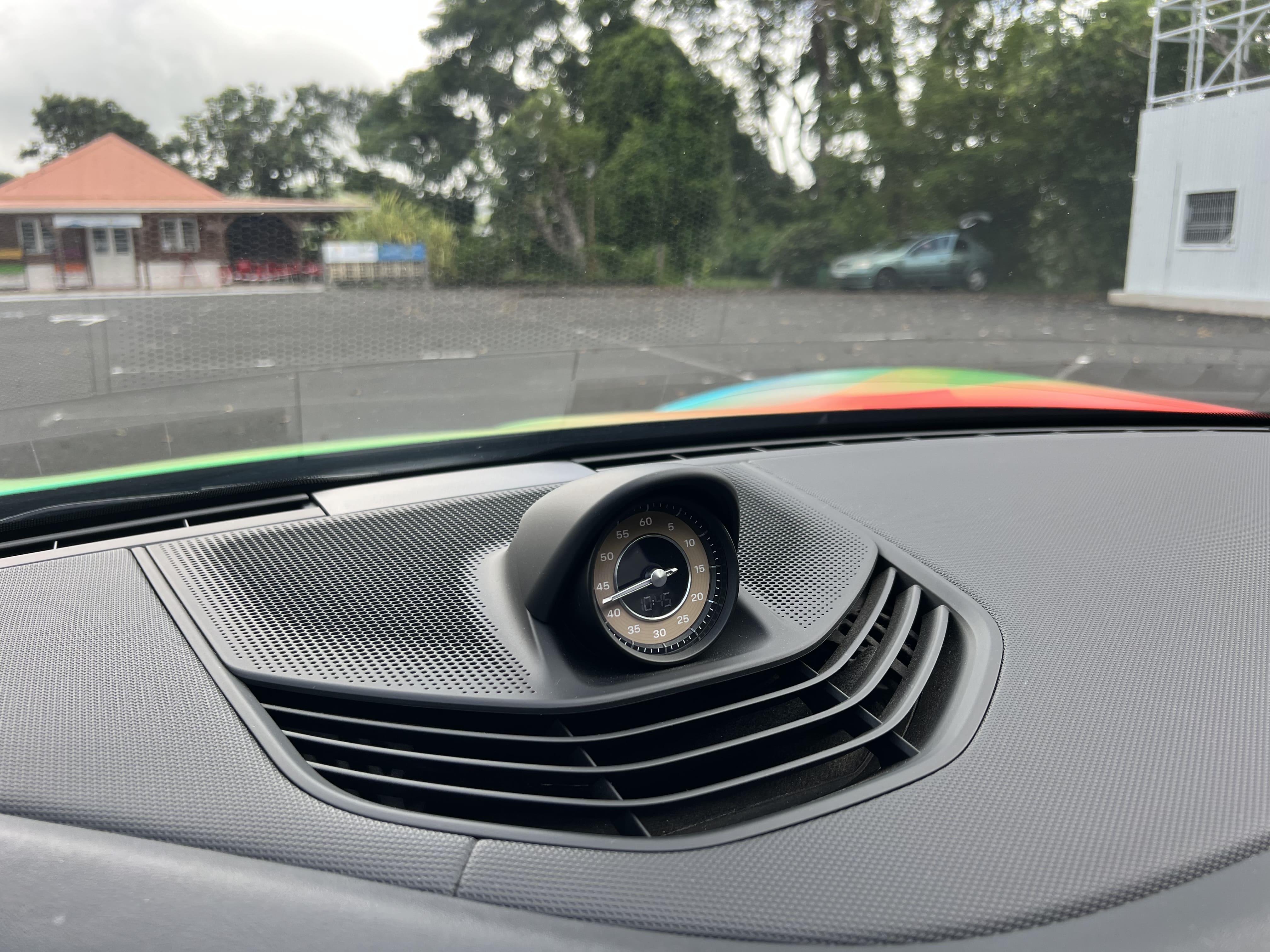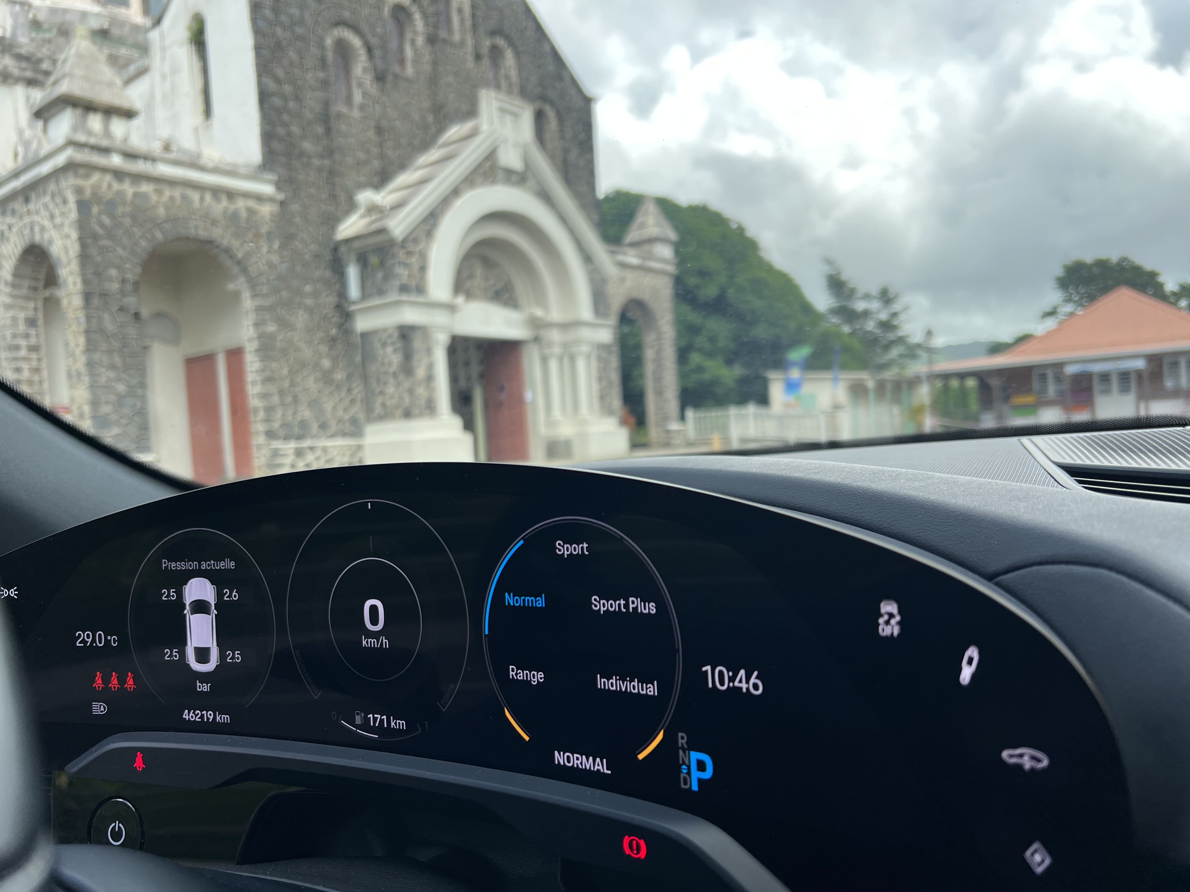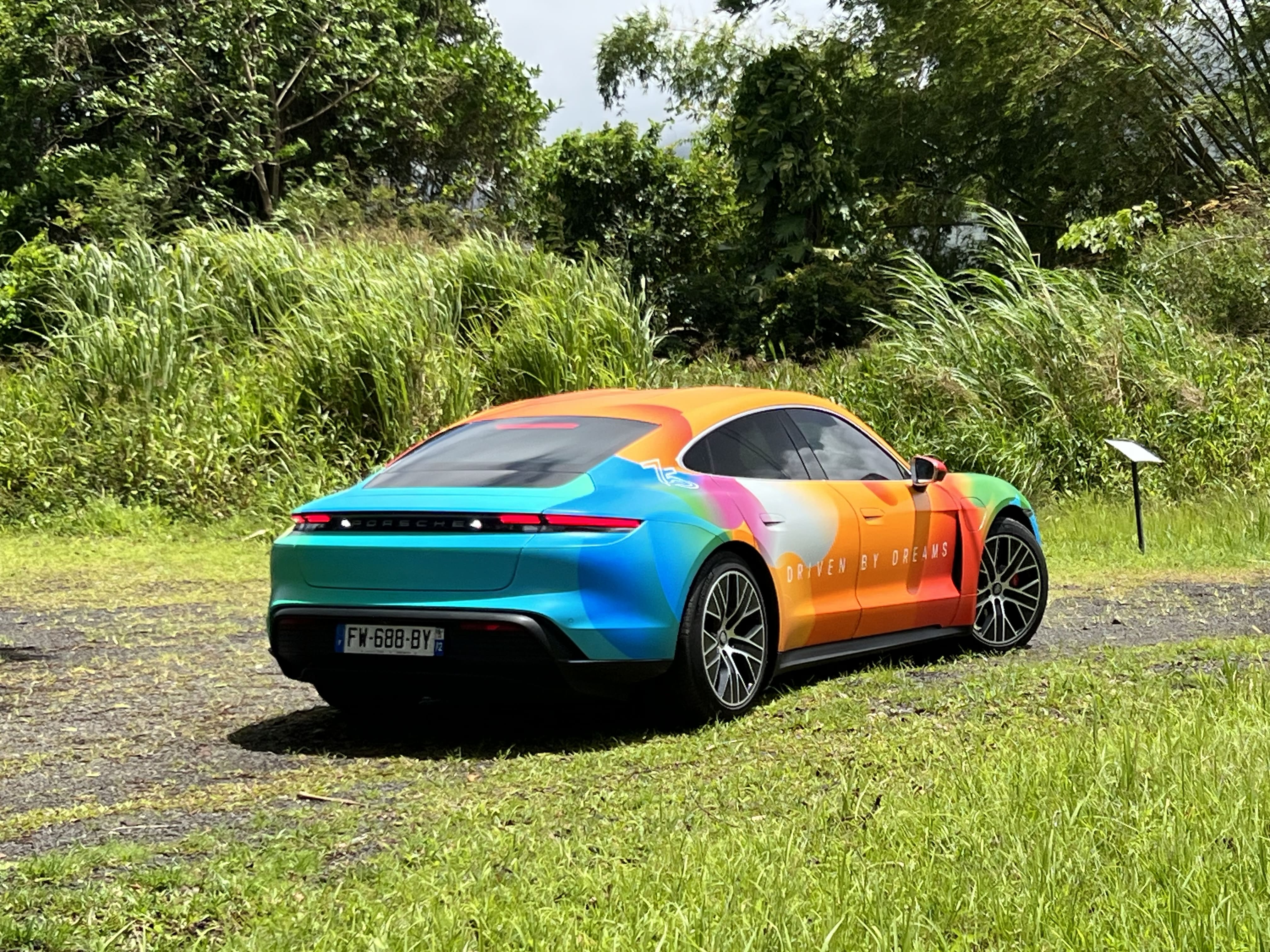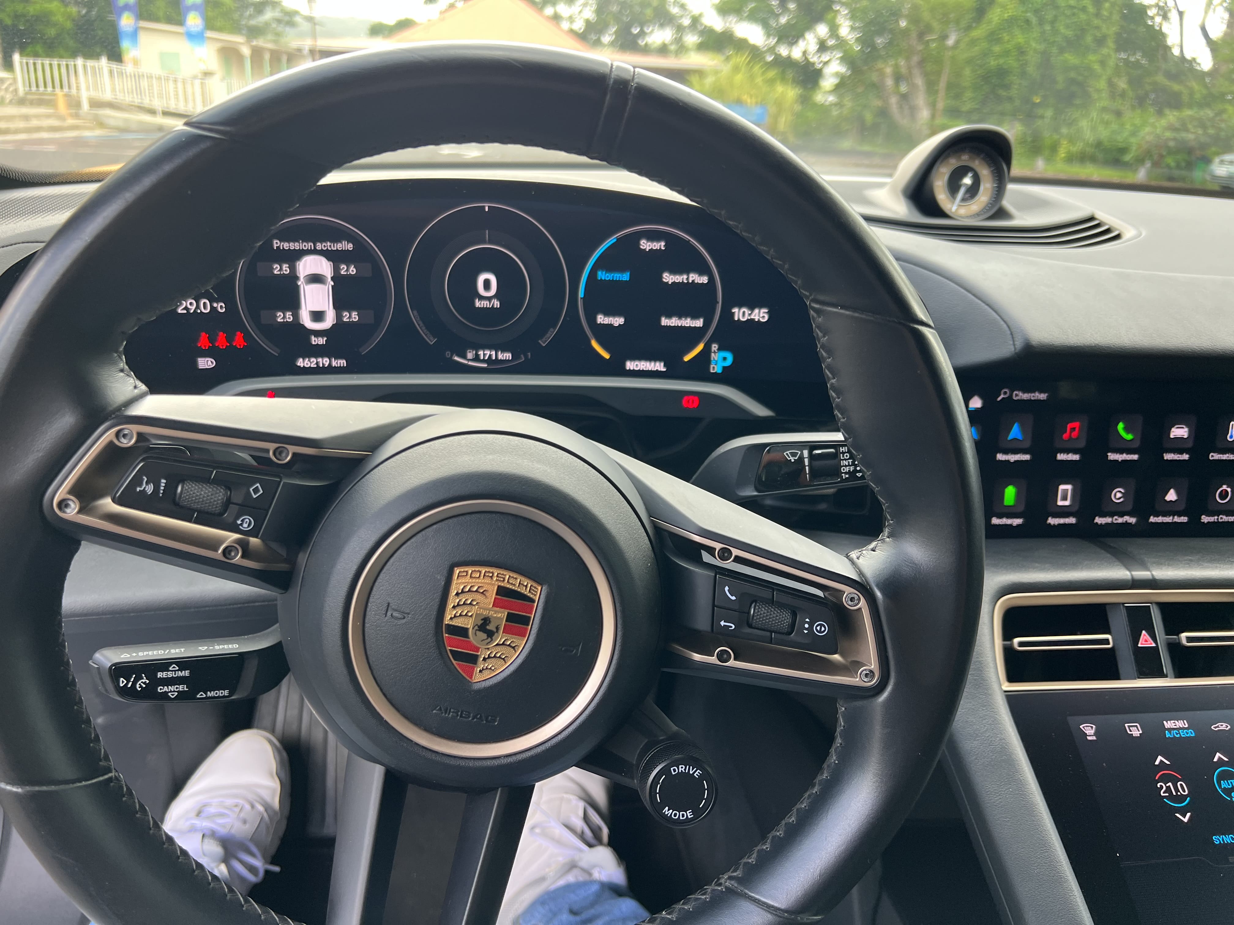 Nous prenons en main ce matin en Martinique pour Grantomobil.fr l’emblématique Taycan 4S proposé par le constructeur de Stuttgart distribuée par le centre Porsche Martinique. Bariolée, mais on est dans une Porsche, c’est bien cela qui saute aux yeux lors de la première prise en main effectuée avec Andréa TUFANO et Jean-Marc WOLLSCHEID nos pilotes. La Porsche de ce matin joue les grandes, on pourrait presque la confondre avec une Panamera, mais nous nous apercevrons très vite à son volant que les sensations ressenties se comparent plus à une 911 que celles d’une grande et luxueuse routière. Premier émoi ; l’imposante console centrale qui se prolonge aux places arrières par un tunnel central jamais trouvé chez une autre marque. On a immédiatement la sensation de conduire une voiture cossue, 1,71 mètres à l’avant, même sensation qu’avec la Panamera, (22 cm de moins pourtant). Reprise du cuir des sièges sur le tableau de bord, tous les matériaux sont parfaitement sélectionnés, cela sent le premium de haute couture ! Cela ne peut ressembler qu’à une Porsche…