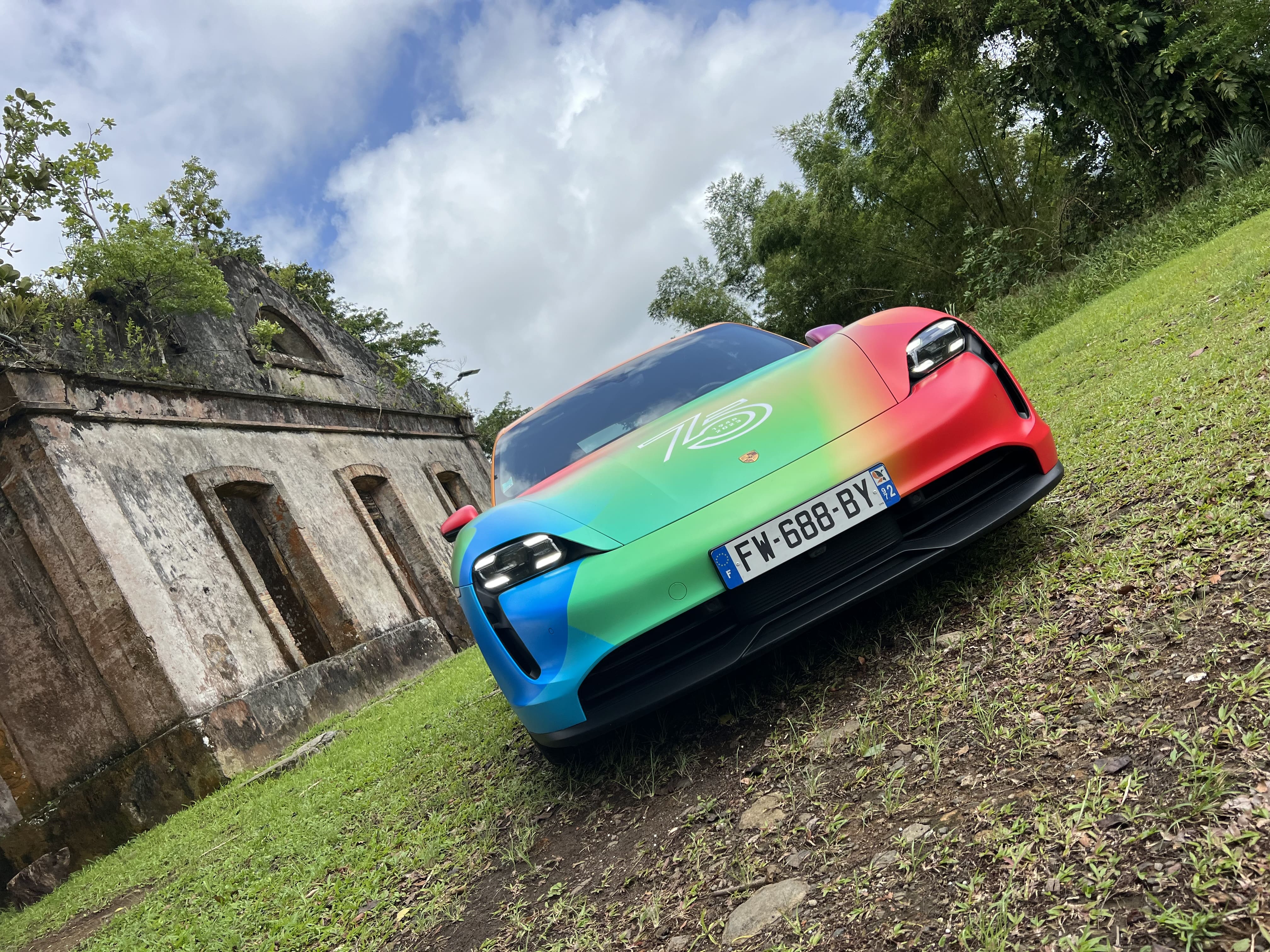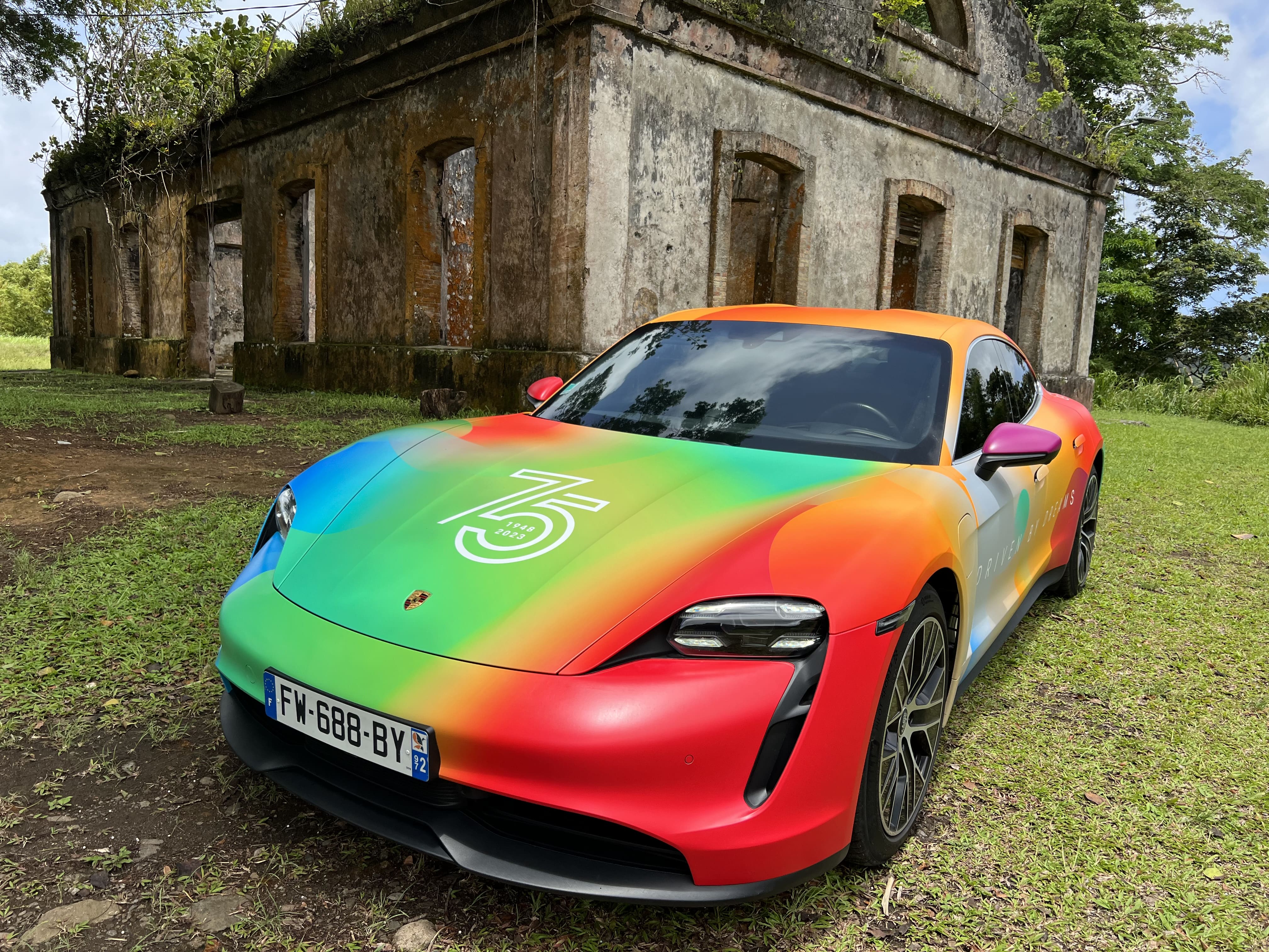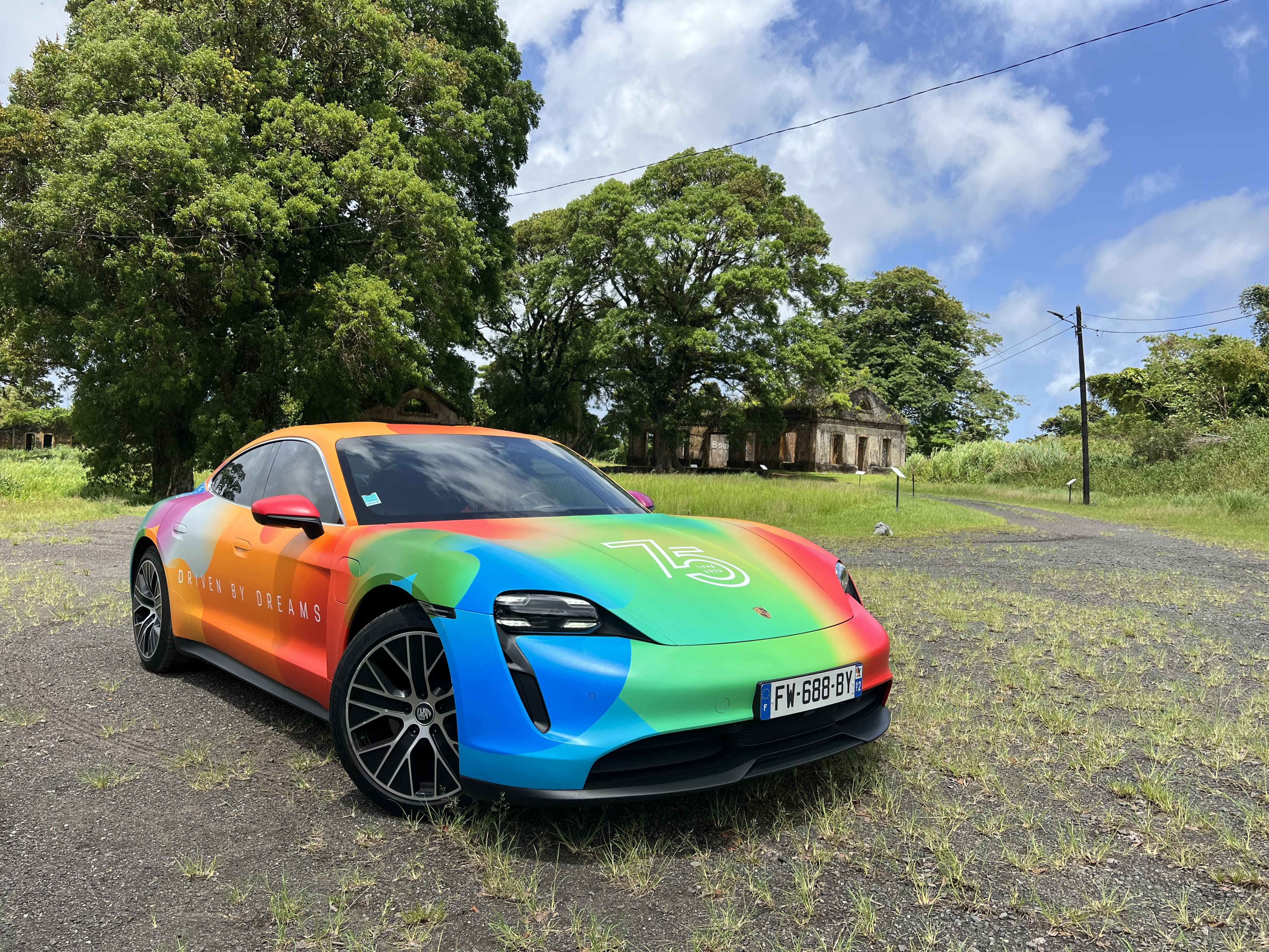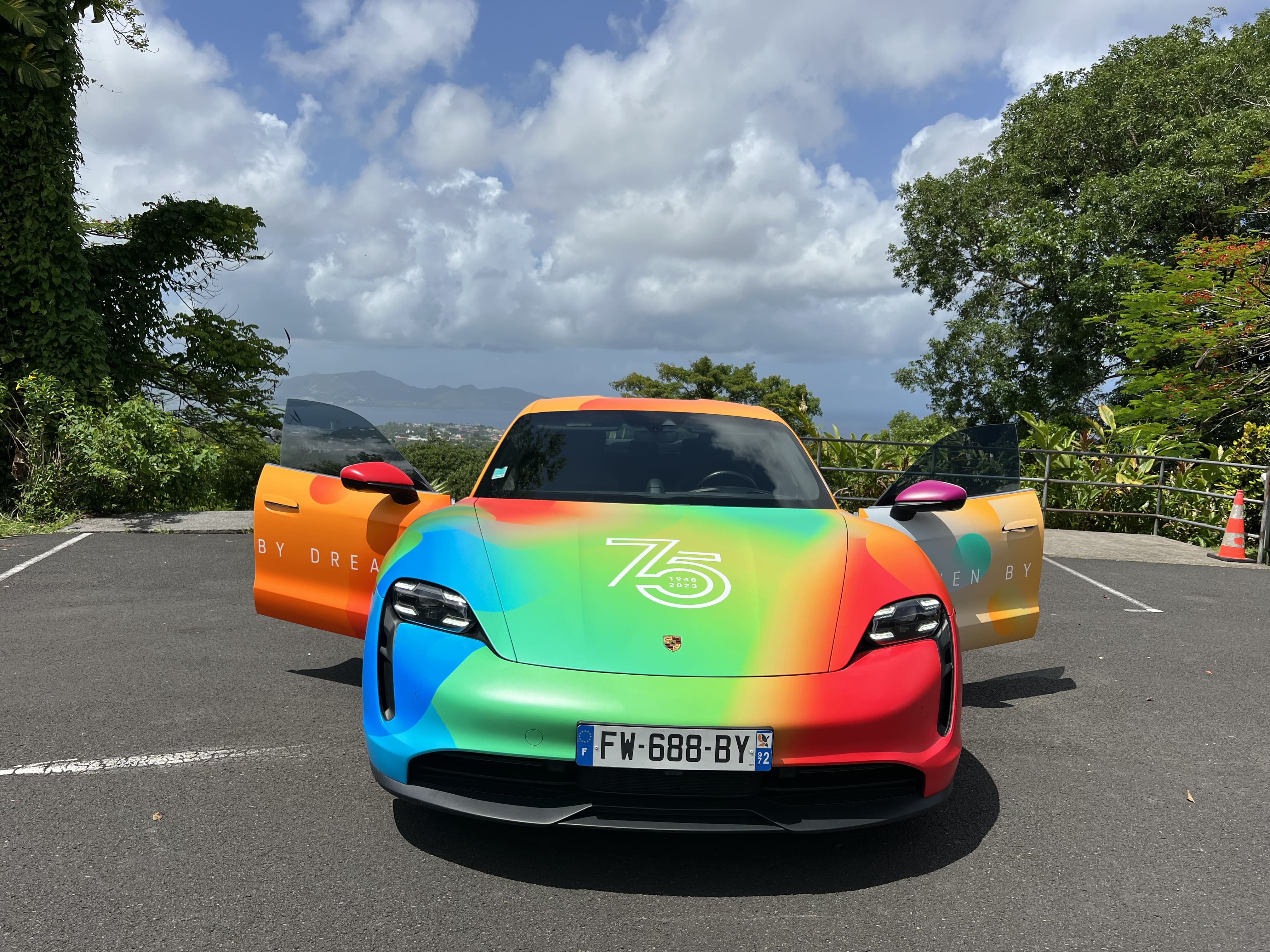 « La couleur, une expression de la personnalité et de la créativité, apporte un rayonnement unique au monde qui nous entoure. Ensemble, célébrons les 75 ans de Porsche avec nos couleurs les plus iconiques. Nous vous invitons à rêver et à rendre le monde plus coloré. » cela explique les couleurs de notre modèle de ce matin que vous avez vu ou que vous verrez quelques temps sur les routes de notre île ! Très bon idée de Porsche Antilles... Alors bon anniversaire Porsche…