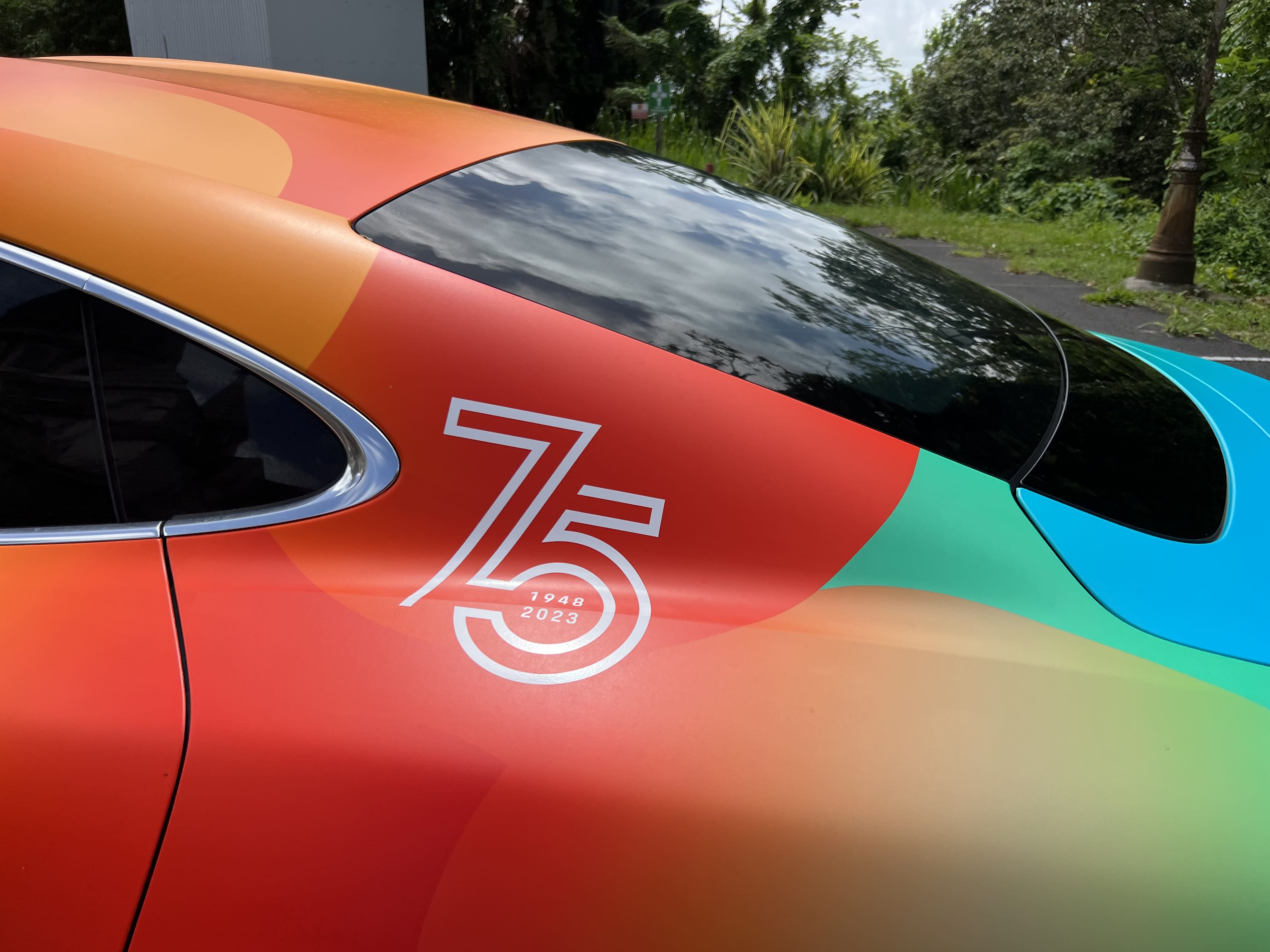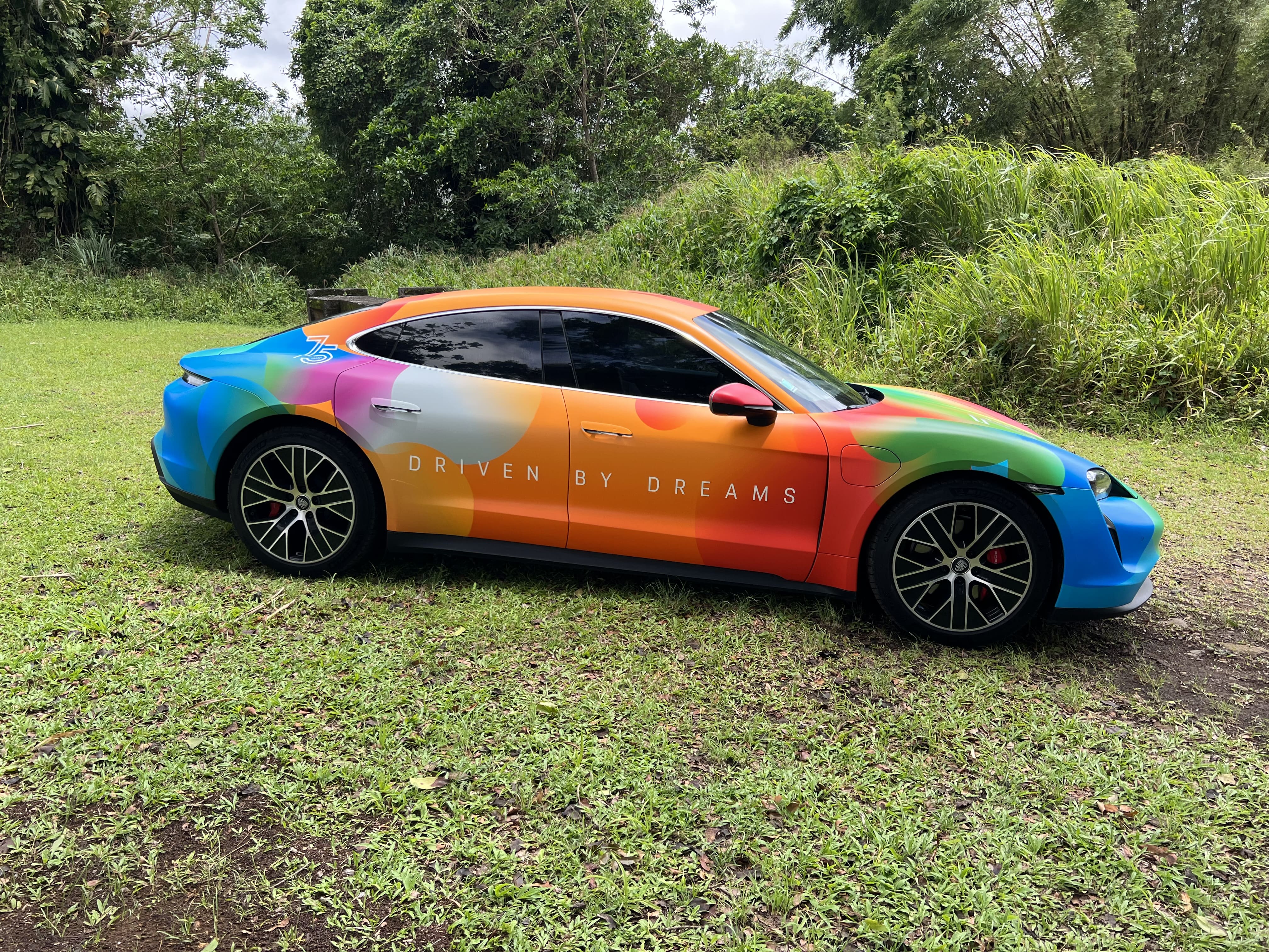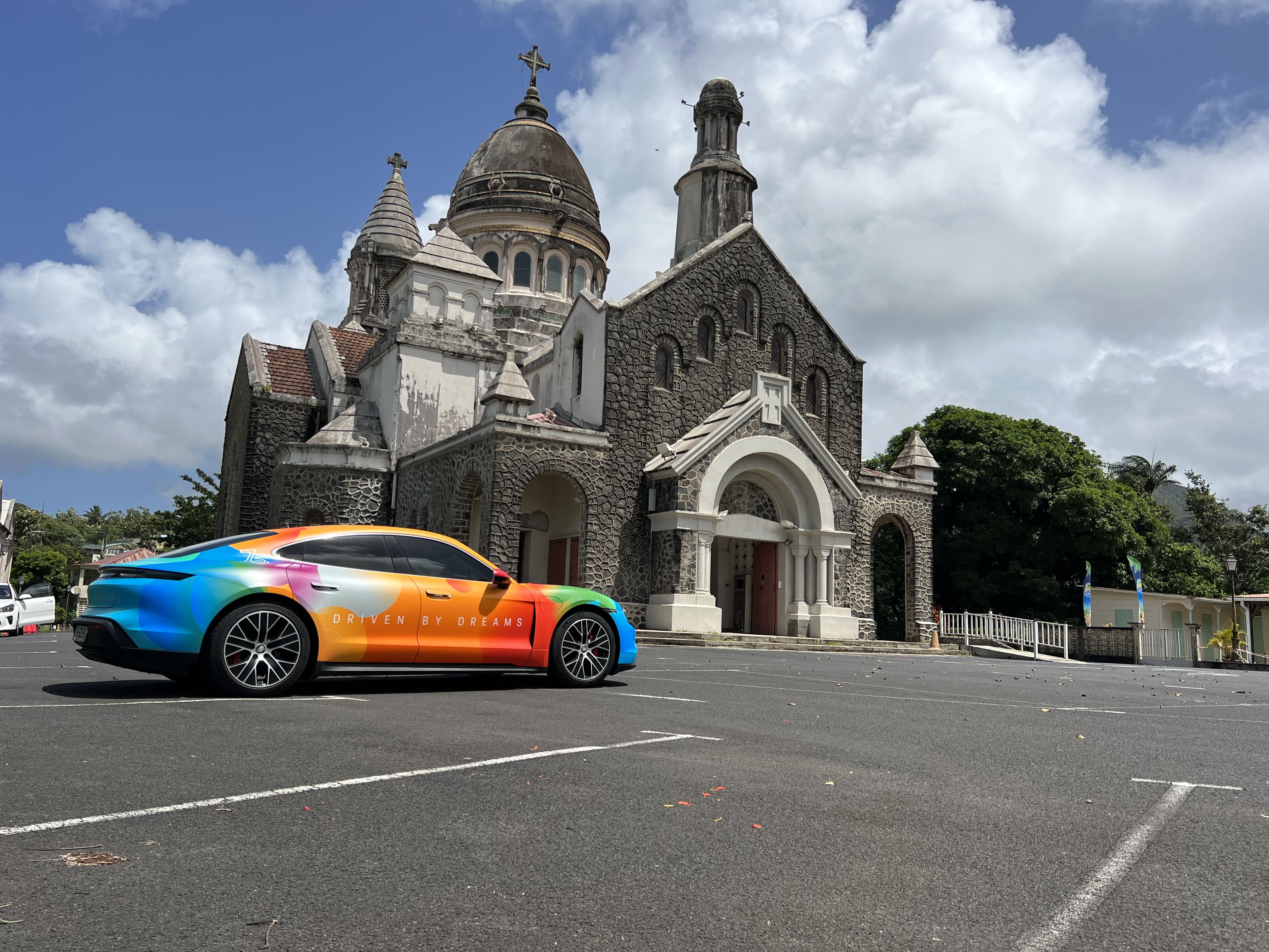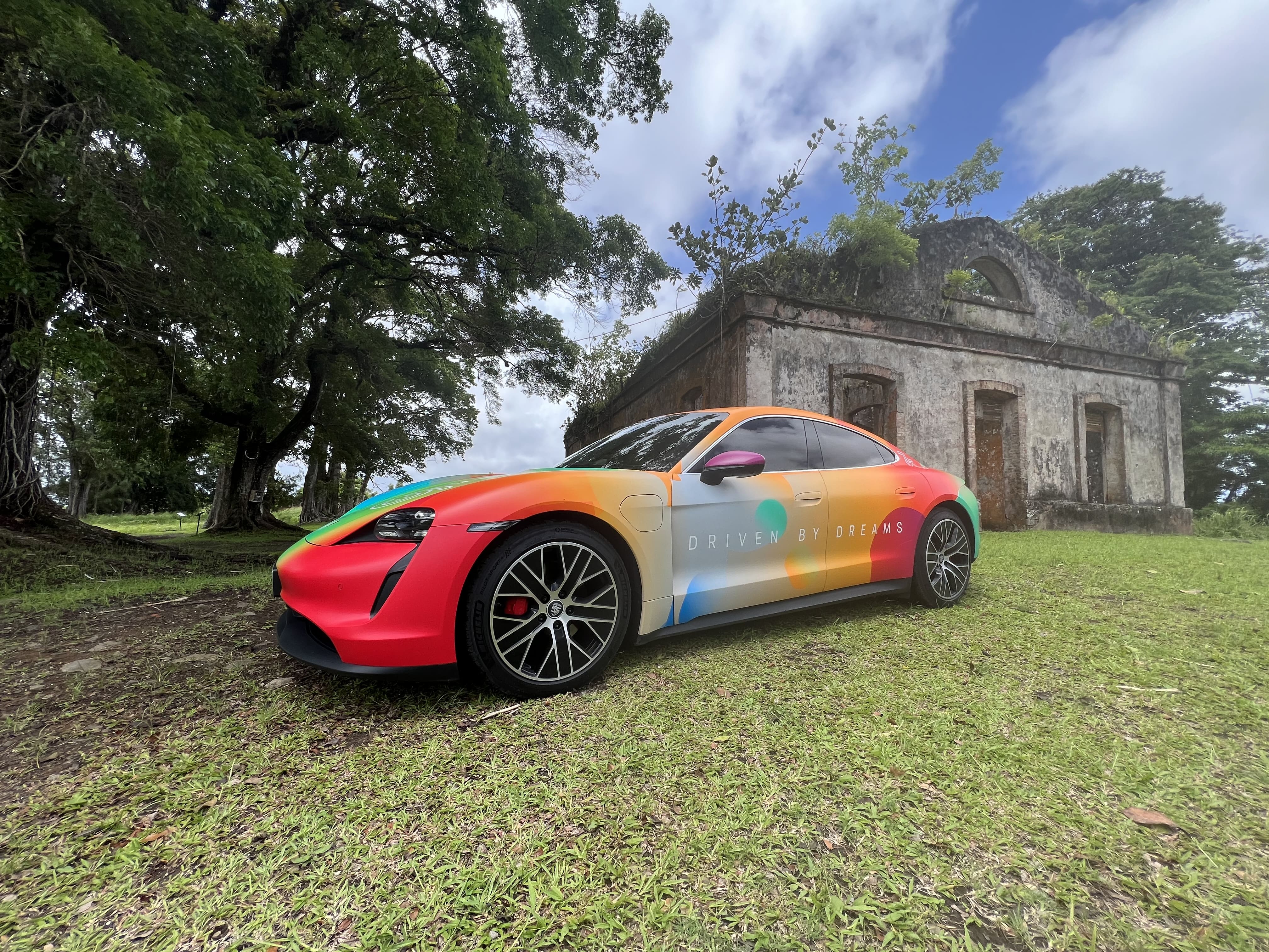 « La couleur, une expression de la personnalité et de la créativité, apporte un rayonnement unique au monde qui nous entoure. Ensemble, célébrons les 75 ans de Porsche avec nos couleurs les plus iconiques. Nous vous invitons à rêver et à rendre le monde plus coloré. » cela explique les couleurs de notre modèle de ce matin que vous avez vu ou que vous verrez quelques temps sur les routes de notre île ! Très bon idée de Porsche Antilles... Alors bon anniversaire Porsche…