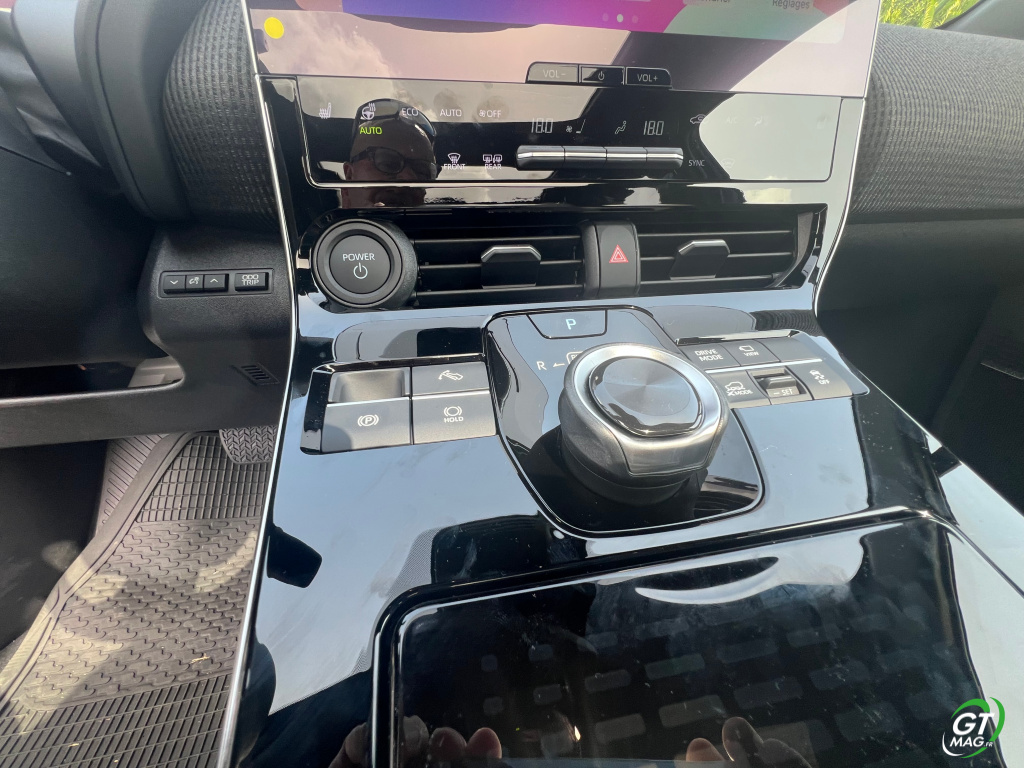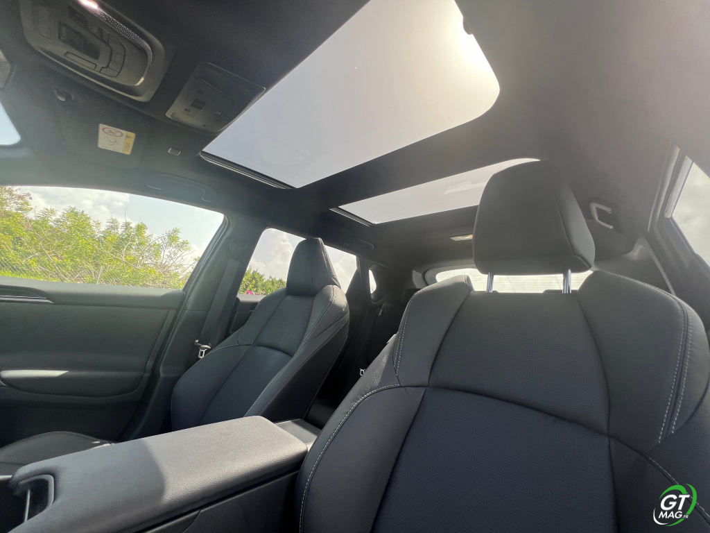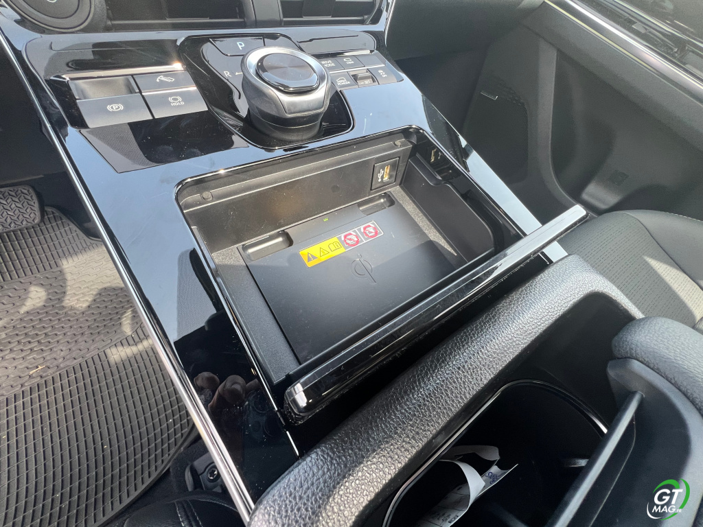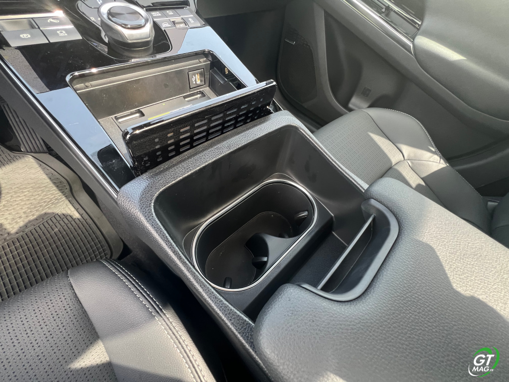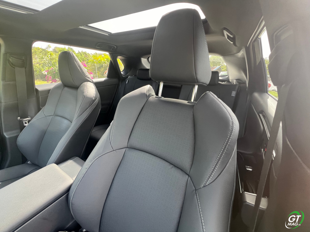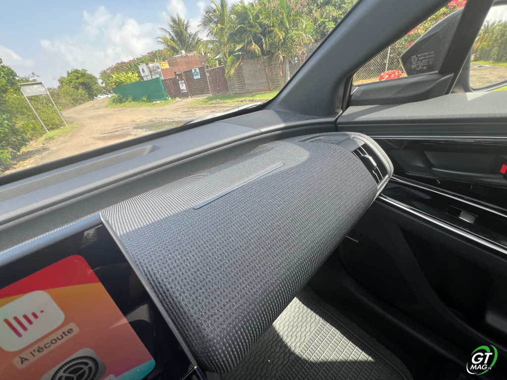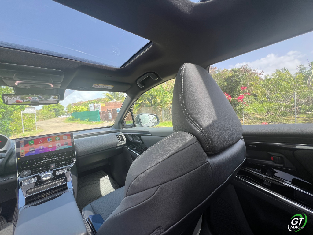 Au-dessus de la console de 12.3 pouces, le rétroviseur intérieur dispose d’une fonction caméra. Il suffit de tirer légèrement la petite languette sur sa partie basse pour voir ce qui se passe à l’arrière…même en marche avant. Cela est très pratique notamment si le coffre est plein. Les matériaux sont de bonne facture, la sellerie en similicuir propose un confort réaliste et bien pensé… Les sièges avant se règlent électriquement, à l’arrière aussi l’habitacle est vraiment spacieux et donne envie de pousser plus loin sur nos petites routes martiniquaises le conducteur ayant même droit au support lombaire. Le coffre propose un volume de chargement de 441L et peut être augmenté grâce au fait que la banquette arrière est rabattable en 1/3 2/3.