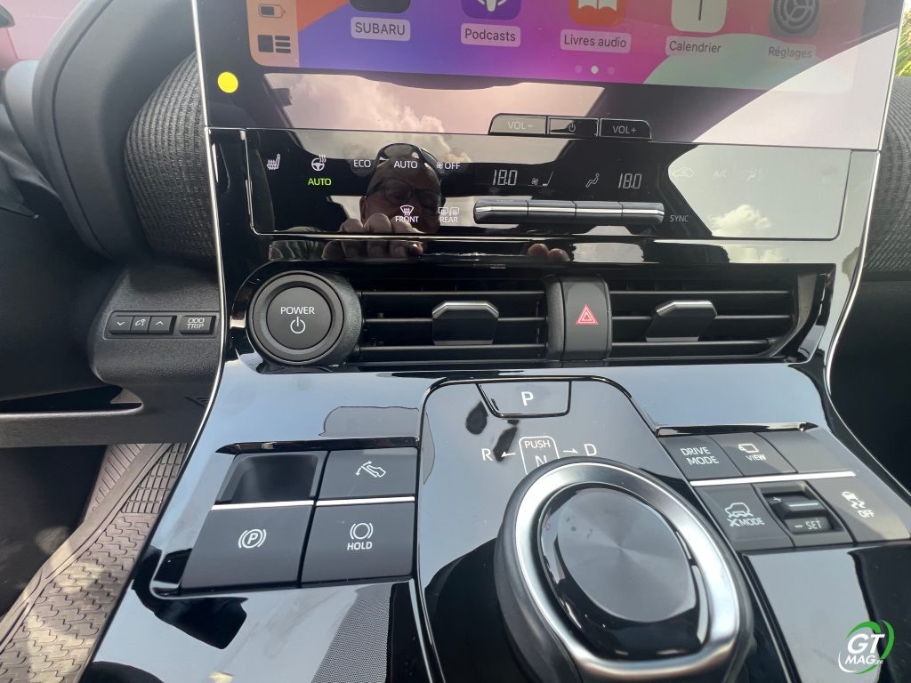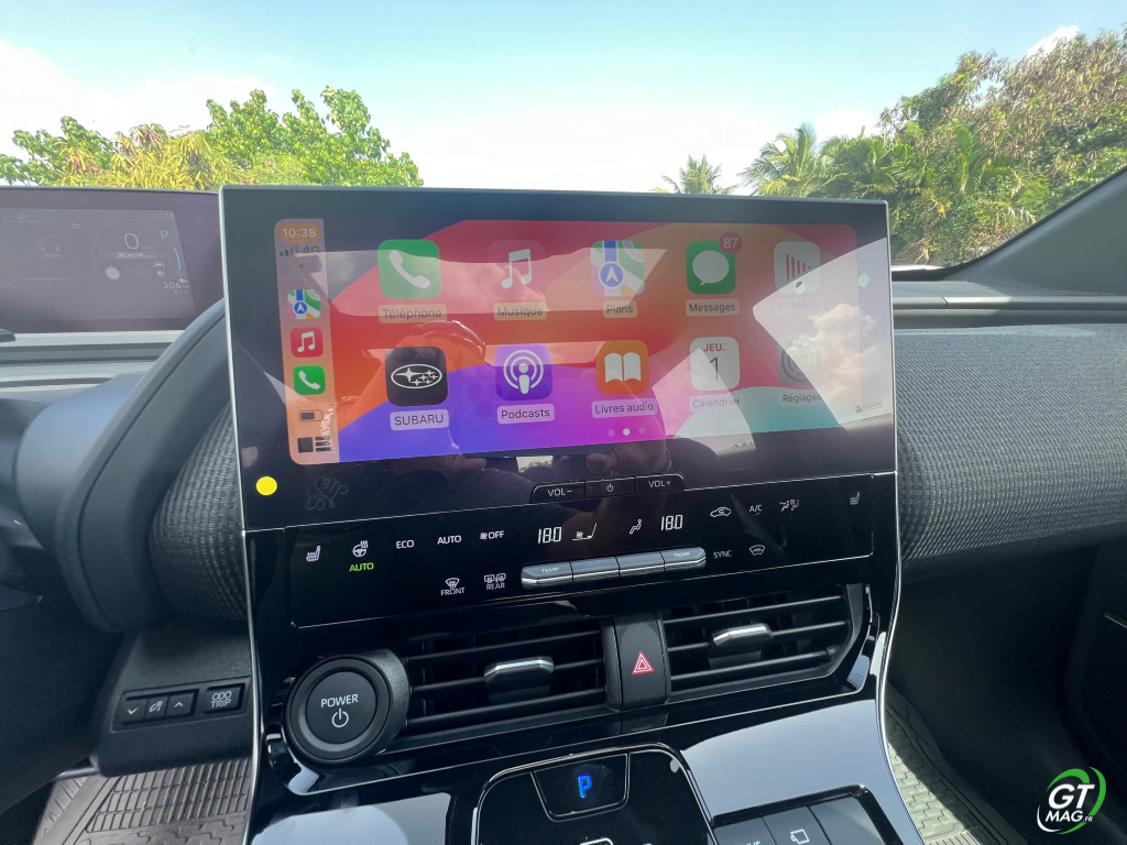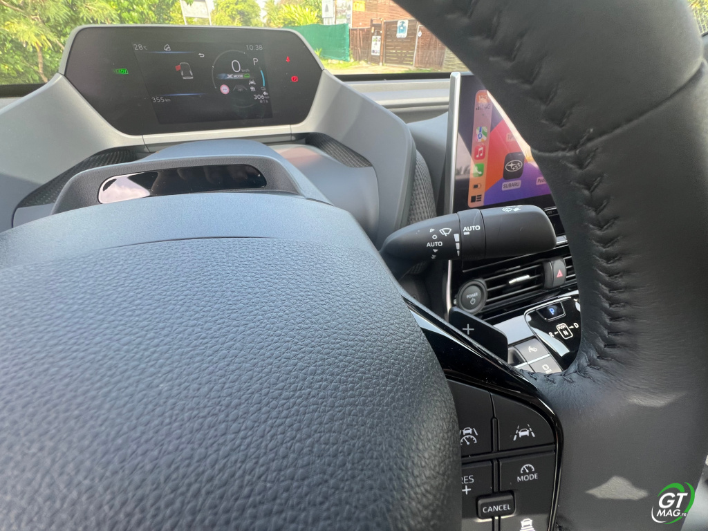 Que deux versions proposées pour le Subaru SOLTERRA Confort et Luxury nous avons la chance de driver le modèles le mieux équipé… Le taux d’équipement justement est impressionnant vous le trouverez ici mais on peut citer ; les feux arrière avec signature lumineuse à LED, le pare-brise acoustique avec filtration UV, le capteur de pluie avec essuie-glaces à déclenchement automatique ou encore le chargeur de smartphone à induction le système multimédia avec compatibilité Apple CarPlay (sans fil) et Android Auto, le SUBARU Care, le système audio premium Harman/Kardon 10 haut-parleurs avec caisson de basses, le système multimédia avec écran central 12,3'', et navigation intégrée ou aussi le système de reconnaissance vocale…