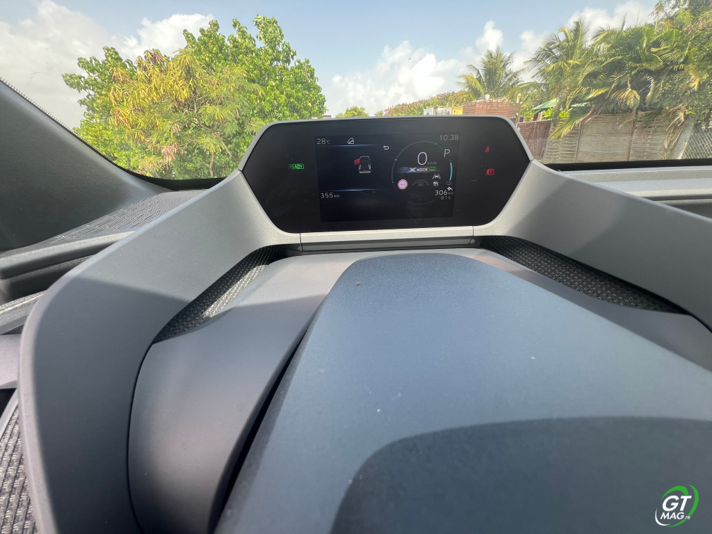 En entrant dans le SOLTERRA on est surpris par la vision panoramique qui est plus que correcte elle offre à mon sens une belle expérience là aussi rarement égalée… On remarque le combiné d’instrumentation numérique de 7” aux formes futuristes placé derrière le volant plutôt en hauteur, surprenant mais utile pour garder à l’œil la consommation sur la batterie, la vitesse, la consommation instantanée ou encore et surtout l’autonomie restante. La console centrale flottante, très grande et l’écran multimédia ne font qu’un. Ce dernier, d’une taille de 12,3” est compatible avec Apple CarPlay et Android Auto sans fil.