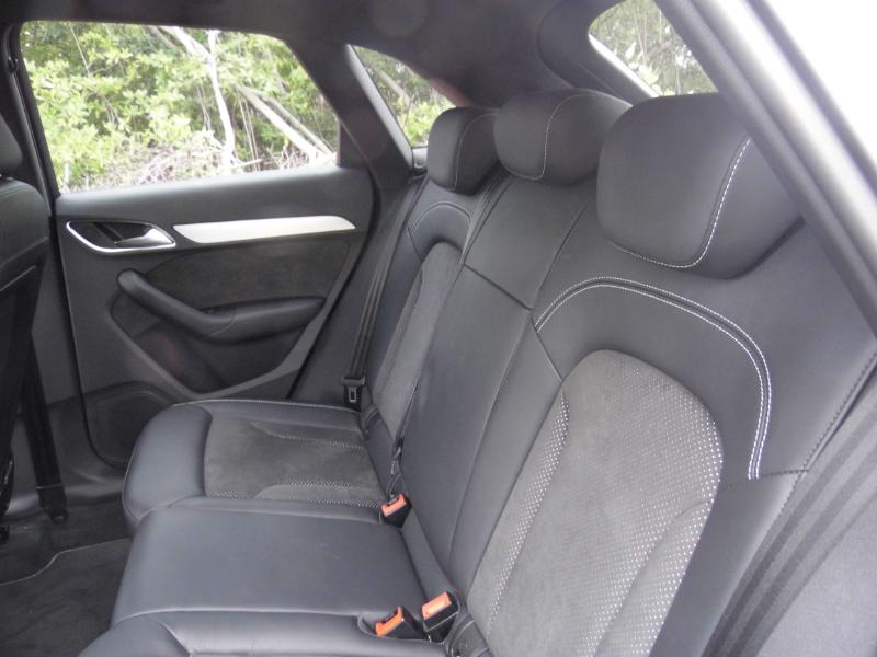 Aux places arrière, les passagers latéraux sont parfaitement à l’aise. C’est un peu moins vrai pour la place centrale, où l’espace est davantage compté. Comme de nombreux SUV compacts, l’Audi Q3 se vivra mieux à quatre. Le hayon électrique facilite l’accès à un coffre de 460 litres qui colle avec une utilisation familiale. En rabattant les dossiers de la banquette, le volume passe même à 1365 litres. A conduire Exceptée la version RS Q3, tous les Q3 sont exclusivement motorisés par des 4 cylindres. Au sommet de la gamme diesel, le2.0 TDI 184 remplace l’ancienne version de 177 ch modèle de notre essai, mais ne bénéficie pas du nouveau label Ultra qui distingue les Audi les plus sobres. Quand le2.0 TDI 150 offre un couple de 340 Nm, le 2.0 TDI 184 culmine à 380 Nm. Il est disponible en traction avant ou en Quattro, et en boîte manuelle ou boîte S-Tronic. Cette dernière est cependant réservée à la transmission intégrale. Ce Q3 d’essai combine donc les différentes technologies disponibles au sommet de la gamme TDI. Le 0 à 100 km/h est avalé en 7,9 s, et l’agrément de conduite est réel avec un châssis équilibré qui autorise une conduite très dynamique. Les ingénieurs ont revu les réglages du contrôle de stabilité et augmenté le diamètre des disques de freins arrière, pour le restele Q3 a conservé les bases précédentes. La boîteS-Tronic utilise deux embrayages, pour garantir une rapidité exemplaire. Elle réagit en fonction des modes de conduite, avec le mode Drive, un mode Sport, et aussi la fonction Efficiency activée via le commutateur Audi Drive Select. Un mode roue libre est alors activé en décélération pour réduire la consommation. Sur les routesdes 3 îlets en directiondu village de la Poterie nous prenons la mesure de l’efficience de l’AUDI Q3…