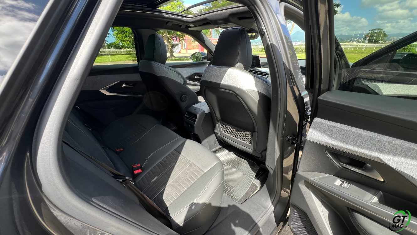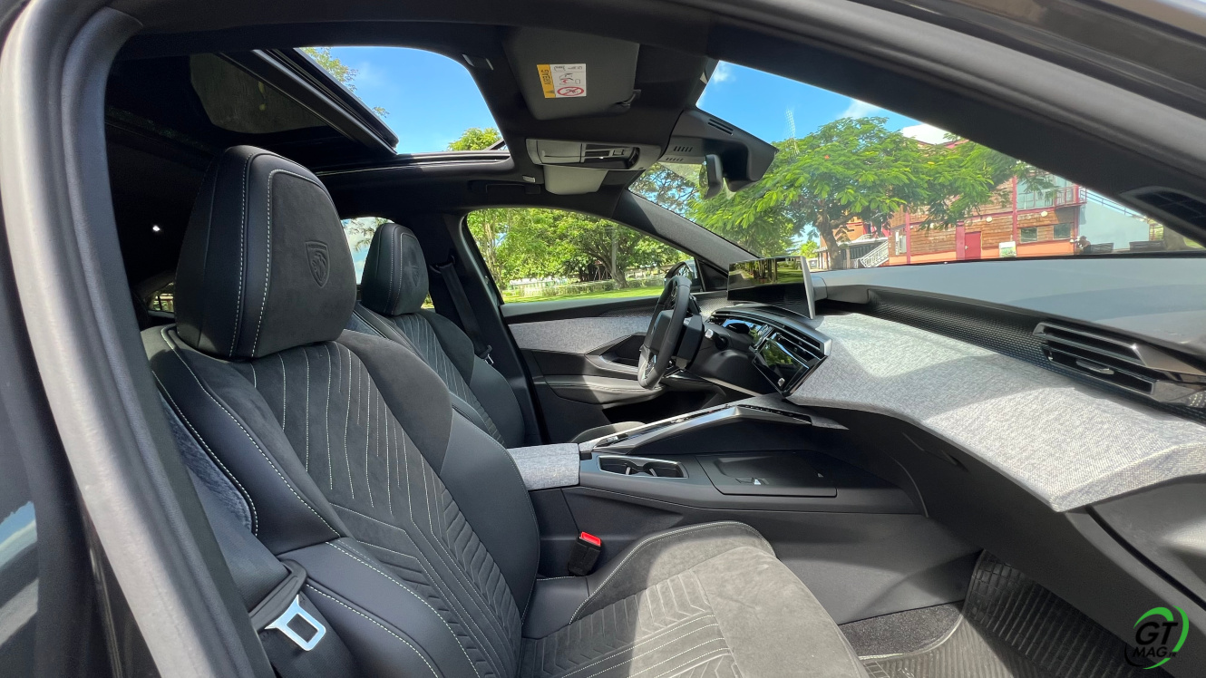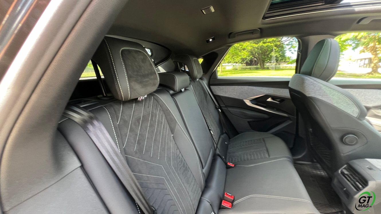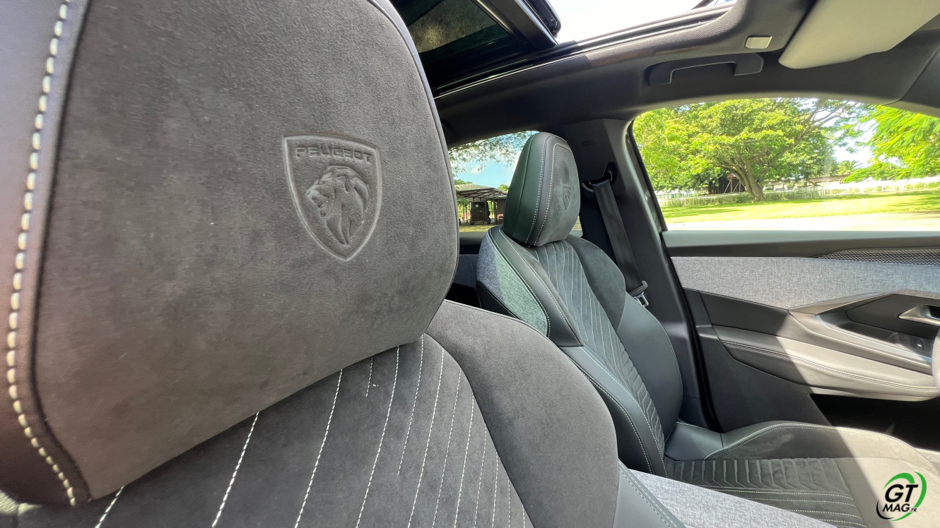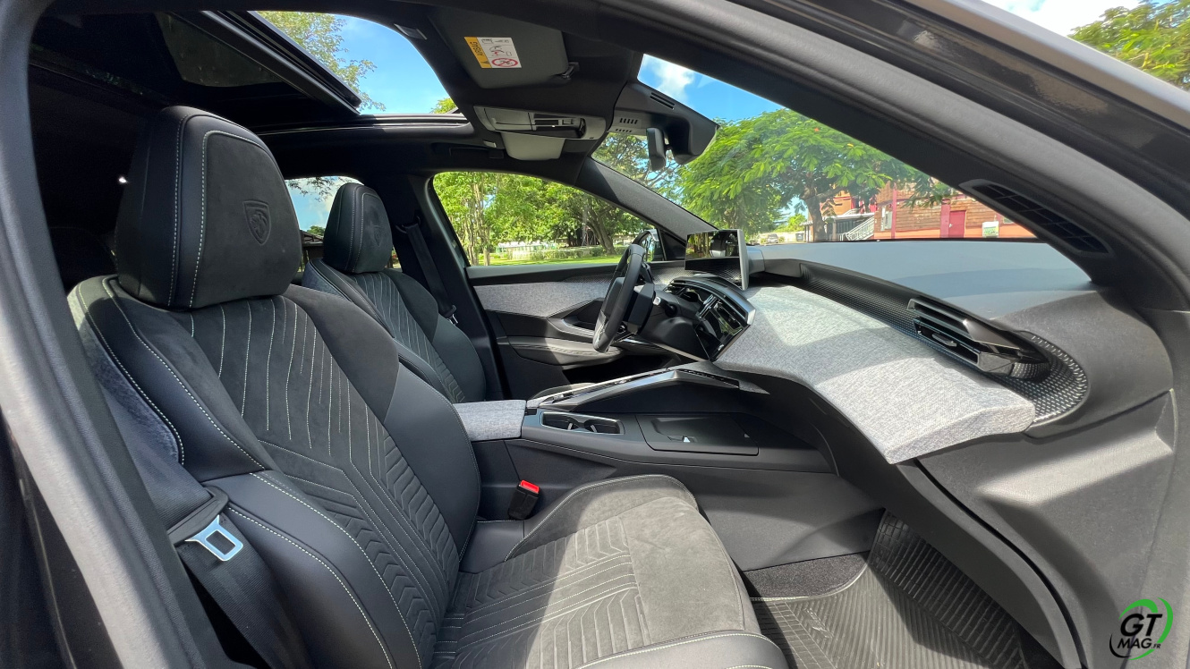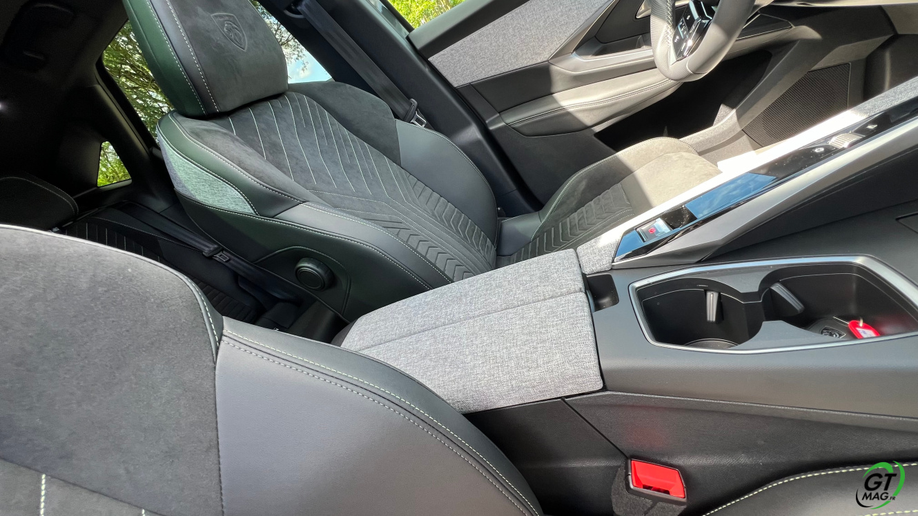 Concernant l’intérieur du 3008 hybrid, ici en finition GT, le conducteur choyé avec comme pour son passager une très bonne assise, et l'ergonomie est plutôt intuitive on peut dire qu’il assomme ses concurrents du segment. Le tissu chiné Rimini chaleureux vous accueil…  Il mêle cuir Nappa et Alcantara profite d’un rembourrage idéal, d’un excellent maintien et d’appuie-tête bien disposés. Rien de surprenant, ces sièges ont la certification AGR et disposent même du maintien latéral adaptatif. Ils ont également une fonction massage avec notamment le mode Patte de chat. Bien pensé aussi : l’espace réfrigéré sous l’accoudoir, pour garder les boissons au frais.
