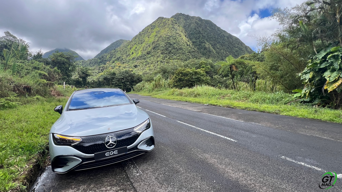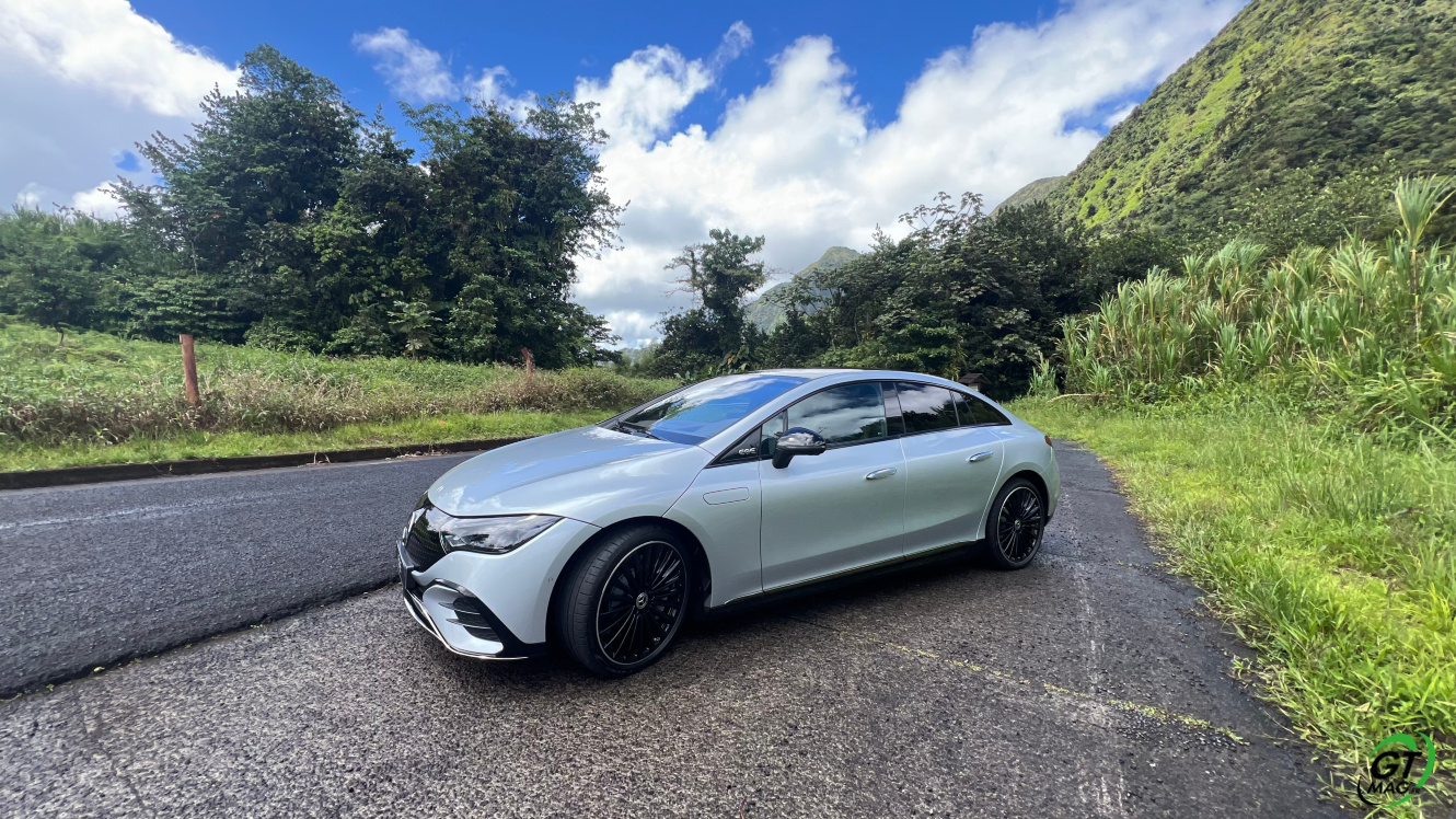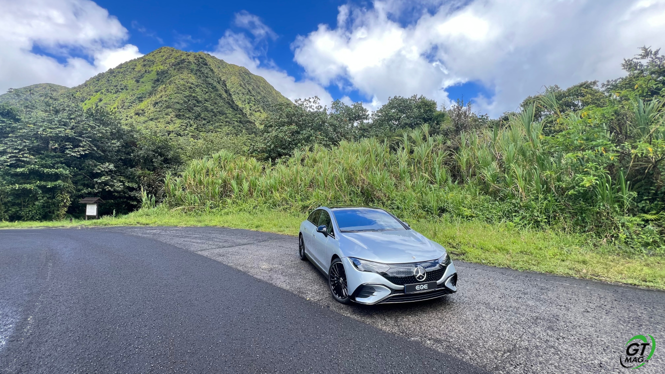 L’EQE est le deuxième modèle basé sur la plateforme 100 % électrique EVA2 après l’EQS. Elle intègre une batterie de 90,5 kWh de capacité lui offrant une autonomie comprise entre 567 et 654 km. Le moteur synchrone à aimants permanents, placé sur l’essieu arrière, développe 215 kW, soit l’équivalant de 292 ch. Il est alimenté par un bloc de batteries lithium-ion d’une capacité de 89 kWh net. Le couple de 565 Nm offre une réserve suffisante pour faire face à tout dépassement. En Martinique ou sur rocade et autoroute, les consommations moyennes relevées varient entre 18,5 et 20,5 kWh/100 km. De quoi parcourir 510 km en roulant très économiquement, soit sensiblement moins que les 650 km annoncés. Avec 6,4s sur le 0 à 100 km/h, l’EQE accélère correctement pour une limousine de 2.3 tonnes. Une recharge de 10 à 100% prend environ 8h30 sur une borne 11 kW et 5h sur une borne 22 kW.