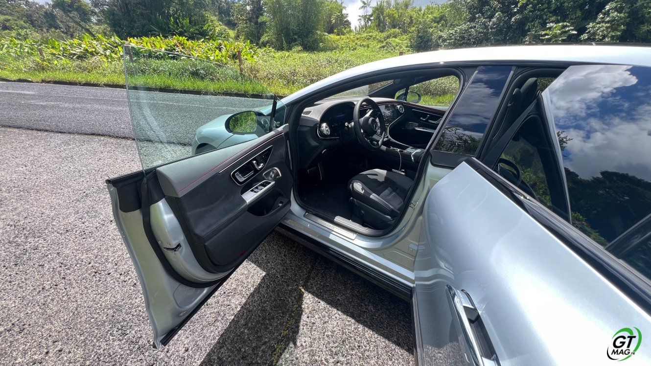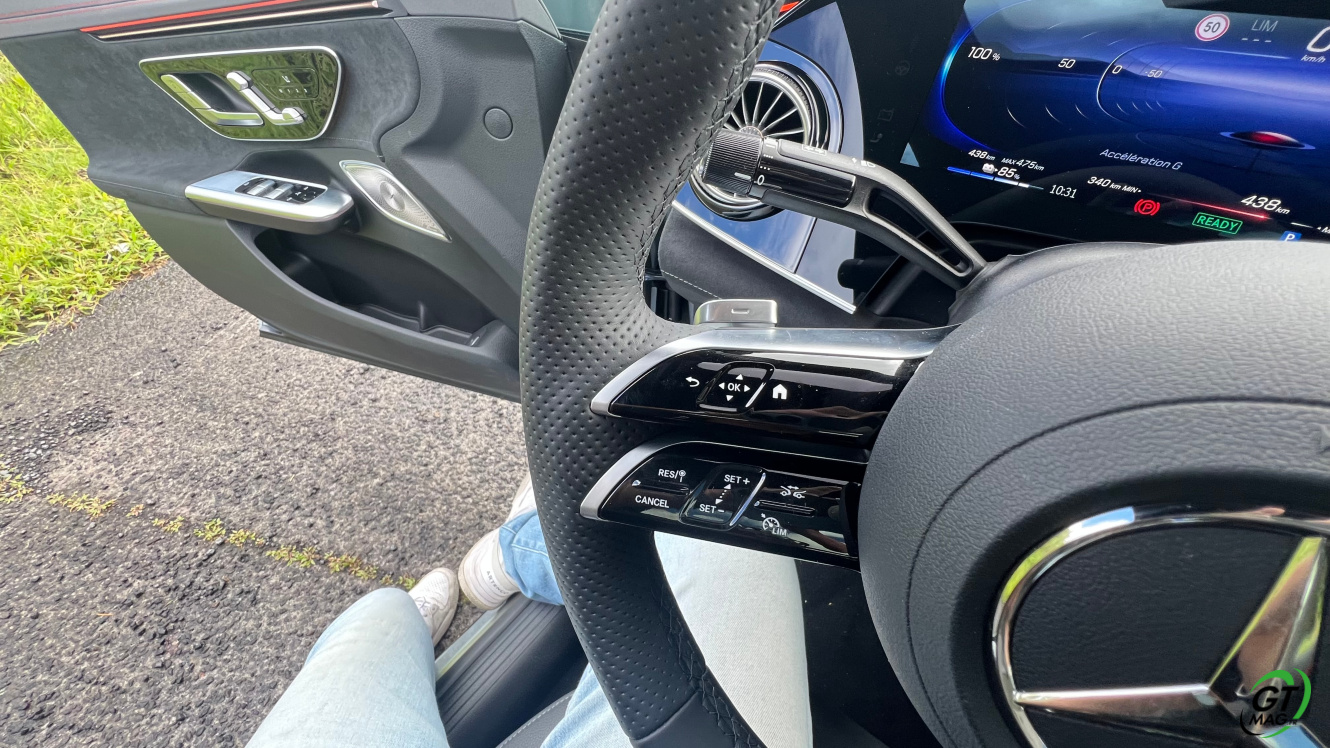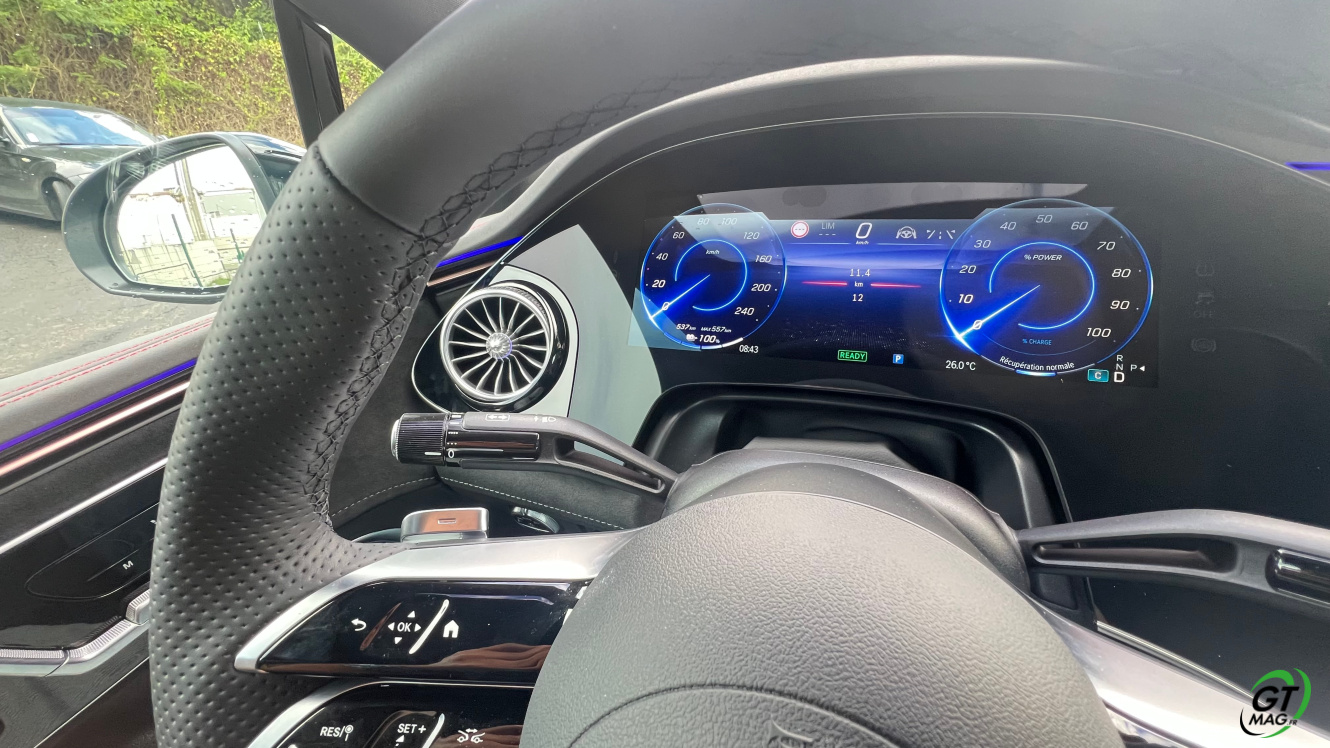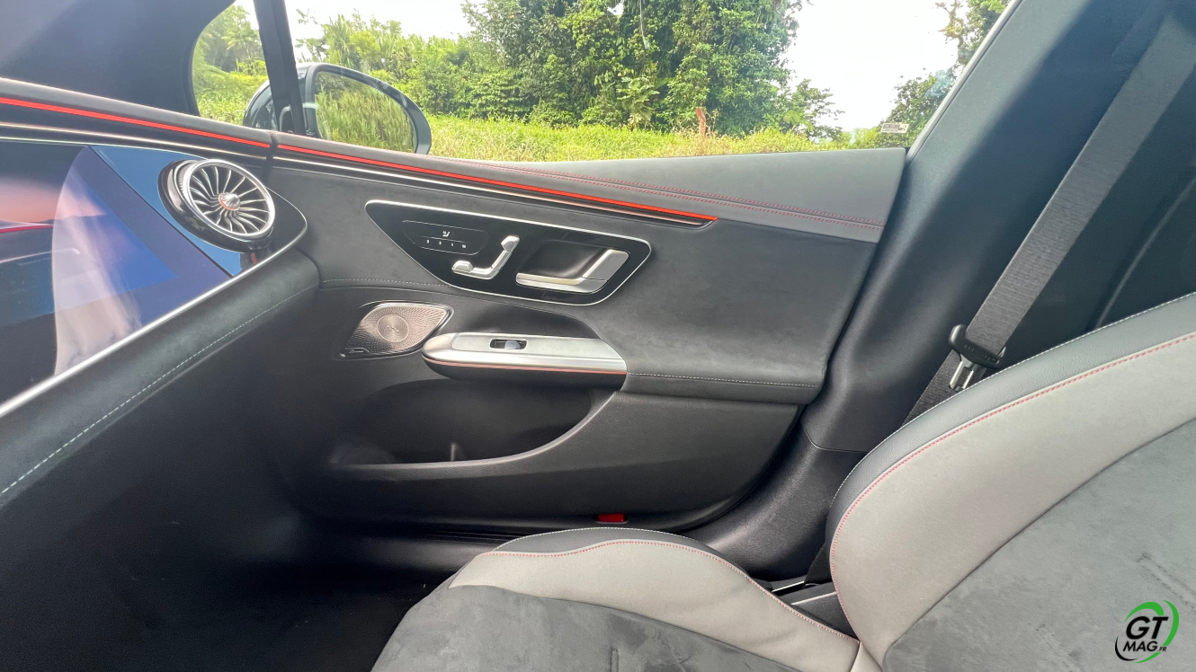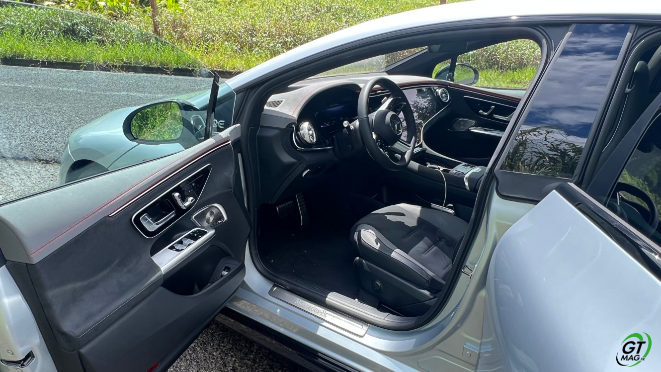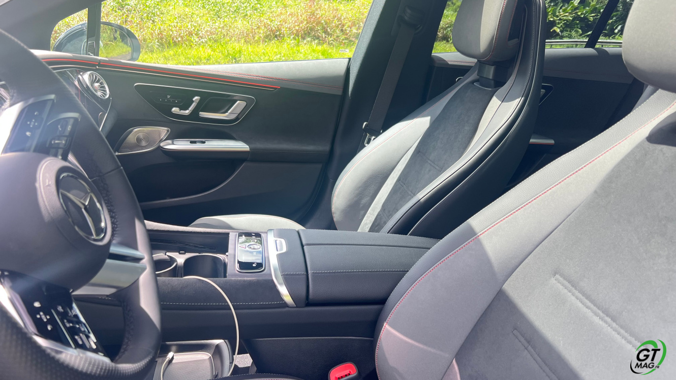 AMG Design ! La version testée aborde une finition AMG Line avec le Pack Premium Plus qui inclut un kit de carrosserie très spécifique avec une calandre étoilée, un toit ouvrant panoramique, le vitrage athermique foncé (pack Sport Black) ou encore les phares LED adaptatifs. Les pare-chocs avant sont de la couleur de la carrosserie avec une partie inférieure en noir. Pour garnir le menu, l’habitacle est également enrichi avec des sièges avant chauffants, ventilés et à réglages électriques, recouvert d’un « simili cuir alcantara ». La console centrale est ergonomique et bien agencée dans notre Mercedes EQE 350 AMG-Line… La suspension pneumatique Airmatic. Cette dernière est un exemple de douceur et de progressivité, elle qui se montre d’une prévenance extrême avec les passagers. Les nids de poule ? A peine ressentis dans l’habitacle. Les dos-d’âne ? quasi effacés. Le bitume de mauvaise qualité ? Avalé avec discrétion et sureté…