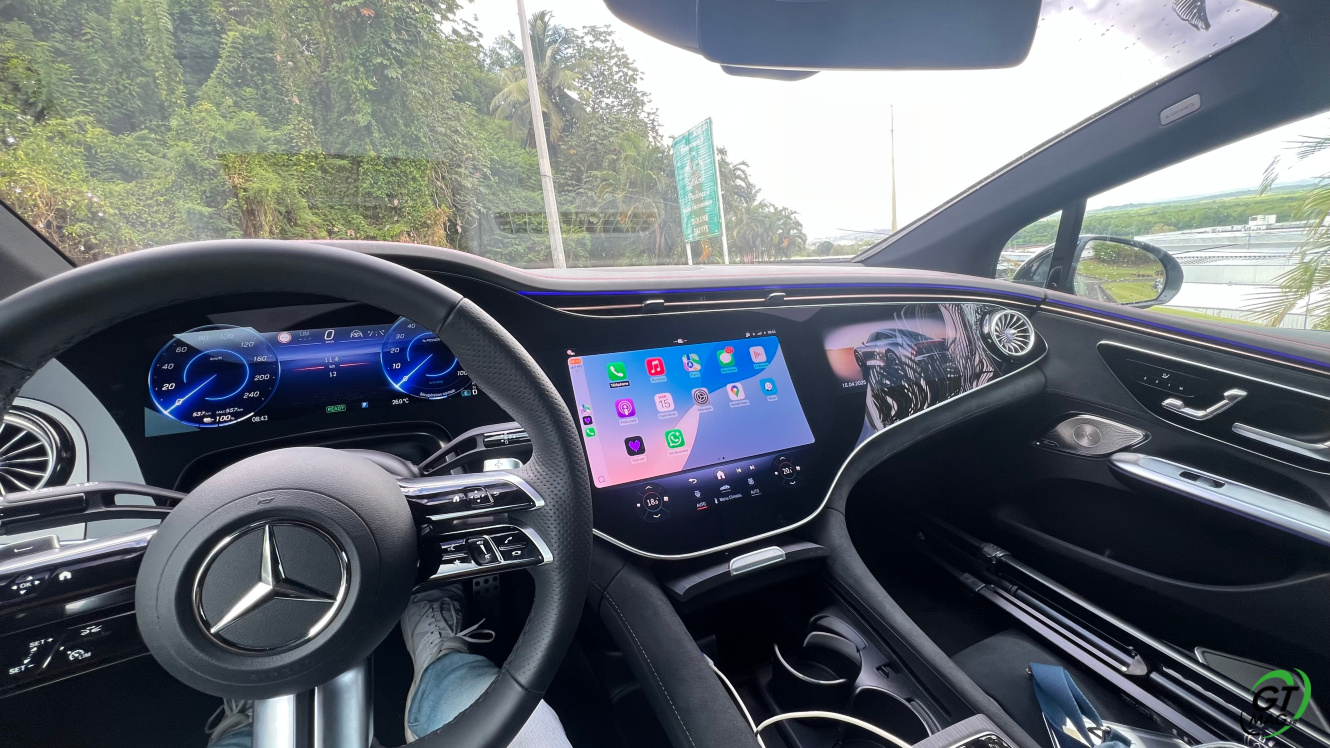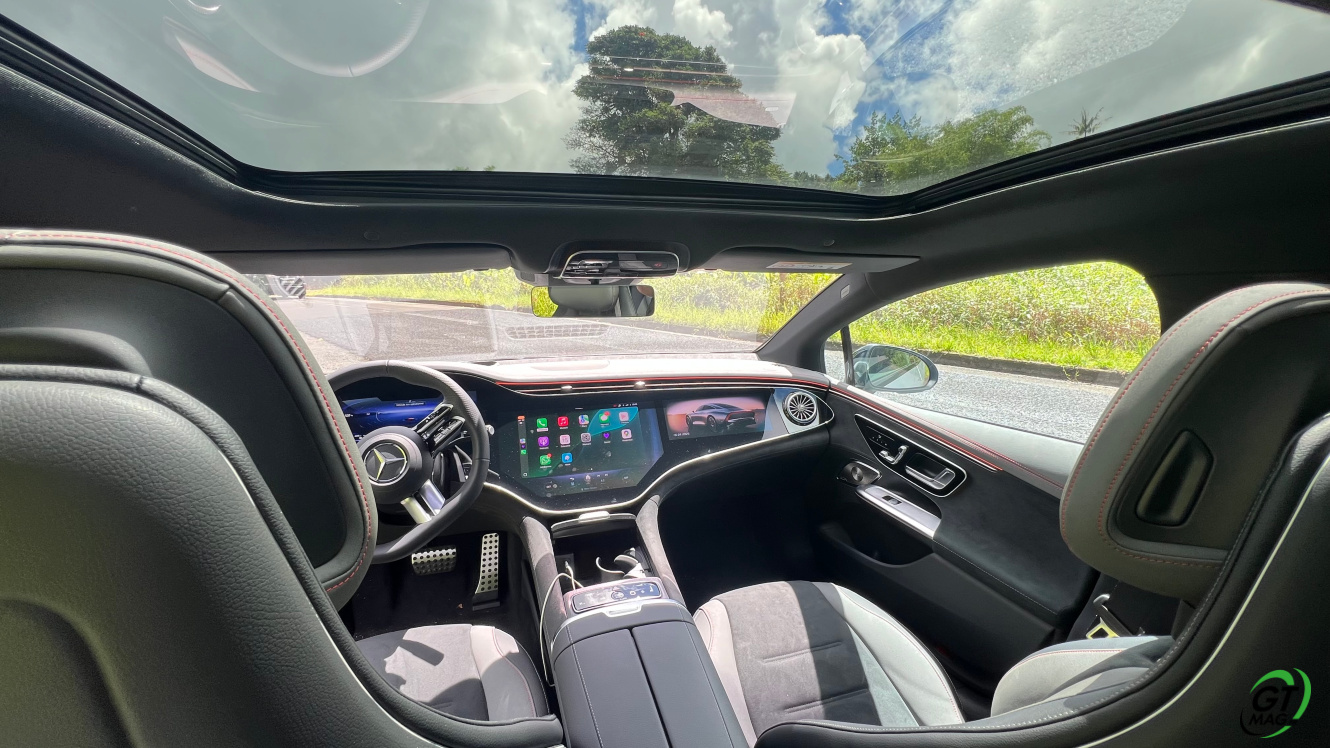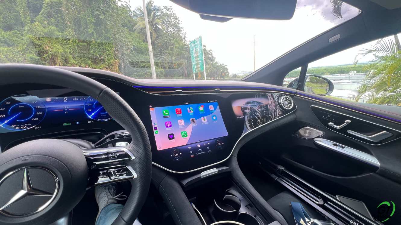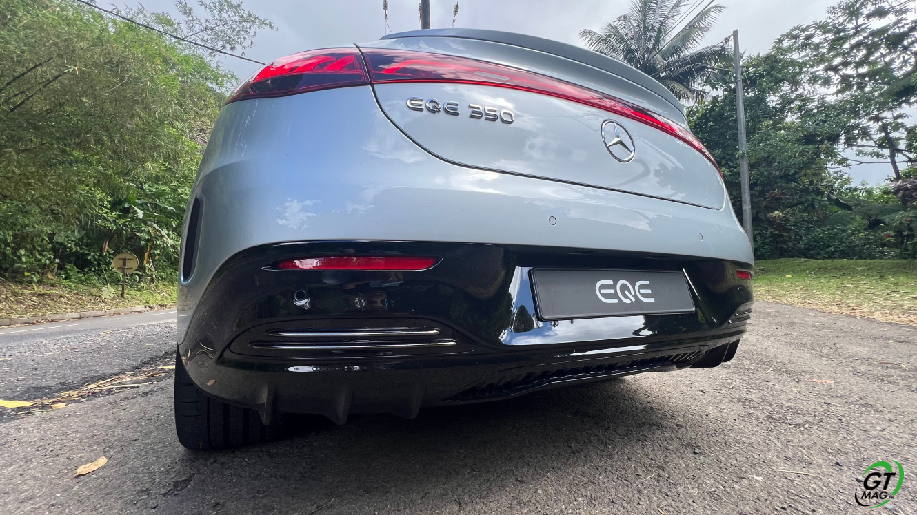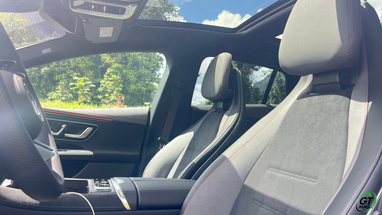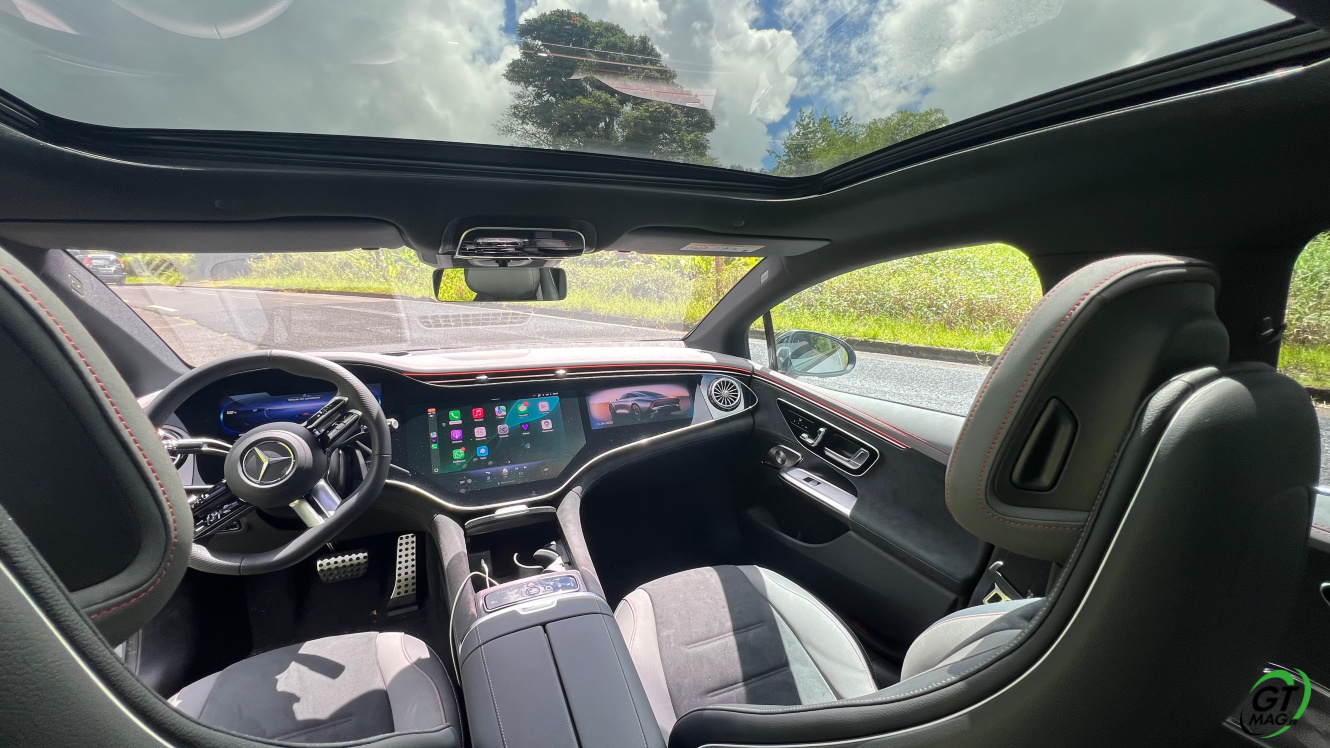 AMG Design ! La version testée aborde une finition AMG Line avec le Pack Premium Plus qui inclut un kit de carrosserie très spécifique avec une calandre étoilée, un toit ouvrant panoramique, le vitrage athermique foncé (pack Sport Black) ou encore les phares LED adaptatifs. Les pare-chocs avant sont de la couleur de la carrosserie avec une partie inférieure en noir. Pour garnir le menu, l’habitacle est également enrichi avec des sièges avant chauffants, ventilés et à réglages électriques, recouvert d’un « simili cuir alcantara ». La console centrale est ergonomique et bien agencée dans notre Mercedes EQE 350 AMG-Line… La suspension pneumatique Airmatic. Cette dernière est un exemple de douceur et de progressivité, elle qui se montre d’une prévenance extrême avec les passagers. Les nids de poule ? A peine ressentis dans l’habitacle. Les dos-d’âne ? quasi effacés. Le bitume de mauvaise qualité ? Avalé avec discrétion et sureté…