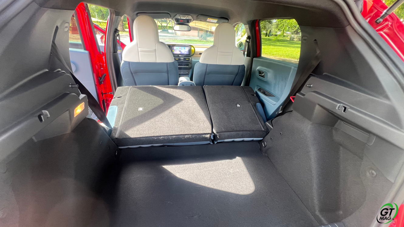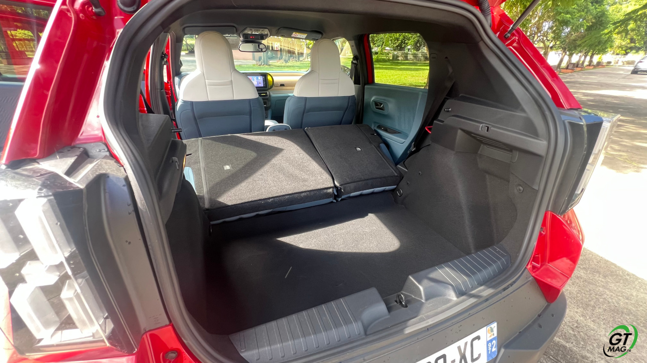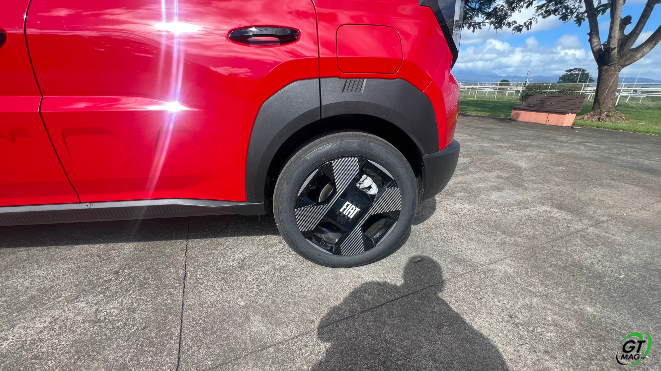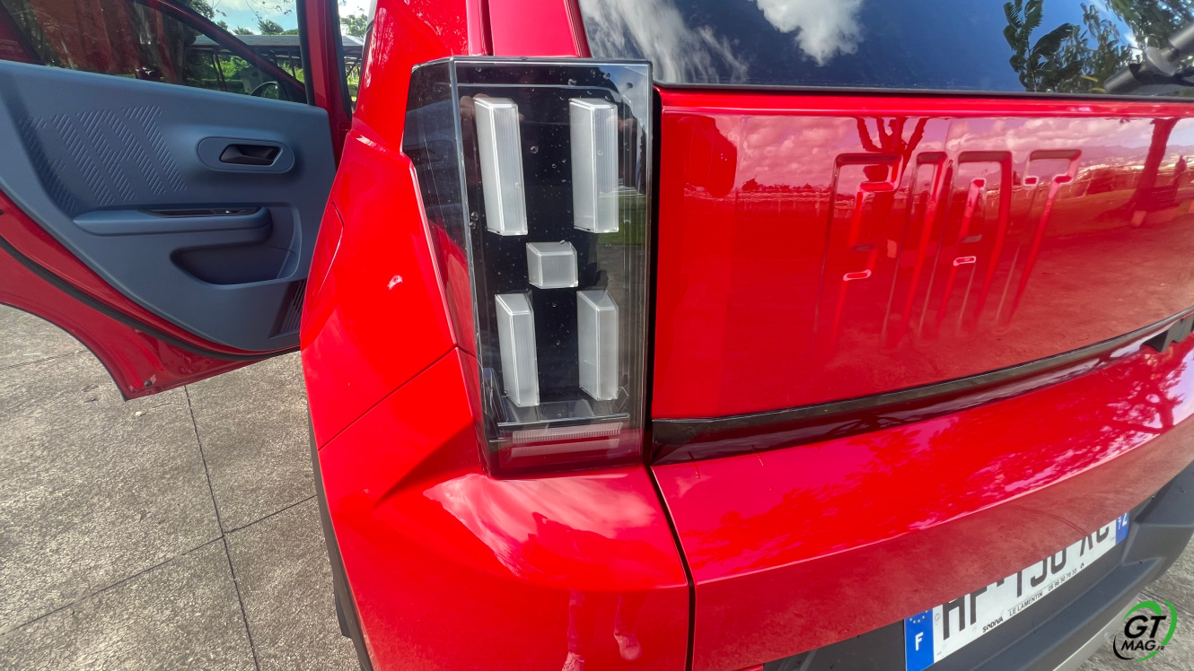 Vue de l’arrière aussi, la Grande Panda rappelle son ancêtre. Ses formes sont rectangulaires, tout comme les feux arrière à LED. Comme sur la Panda originelle, le pare-chocs est proéminent. Comme son nom l’indique, la Grande Panda gagne en volume. Ses dimensions en sont la preuve : 3,99 m de long, 2,01 m de large (avec rétroviseurs) et 1,57 m de haut. ​Elle est donc plus courte de 3 cm par rapport à la Citroën C3. Elle partage avec elle la plateforme STLA Smart du Groupe Stellantis. ​