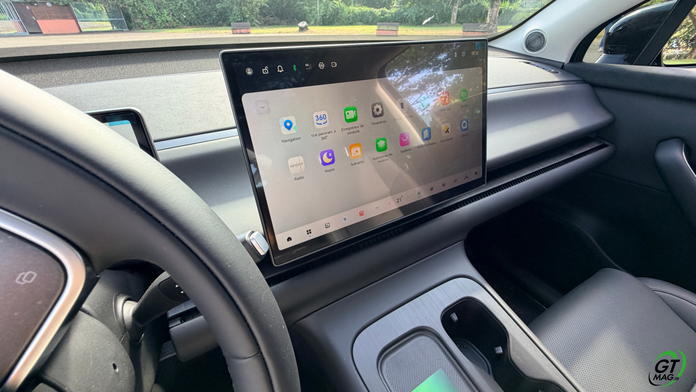 Plutôt réussi, l’habitacle du Leapmotor C10 REEV est une heureuse surprise. Très épuré, le mobilier de bord est constitué de matériaux de qualité correcte, seuls quelques assemblages demeurent perfectibles. Comme chez Tesla, un grand écran central de 14,6 pouces centralise toutes les commandes de la voiture alors que l’instrumentation dispose d’une dalle de 10,25 pouces. L’interface multimédia de la voiture est assez réussie en termes de fluidité et d’accessibilité, mais on peut regretter l’absence de toute compatibilité Apple CarPlay et Android Auto, mais les choses devaient changer courant 2025… Malgré cela Leapmotor a fait du super travaille à l’intérieur de son C10 du moins en termes de matériaux et d’assemblage.