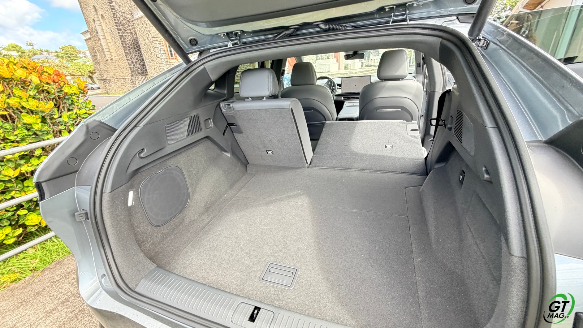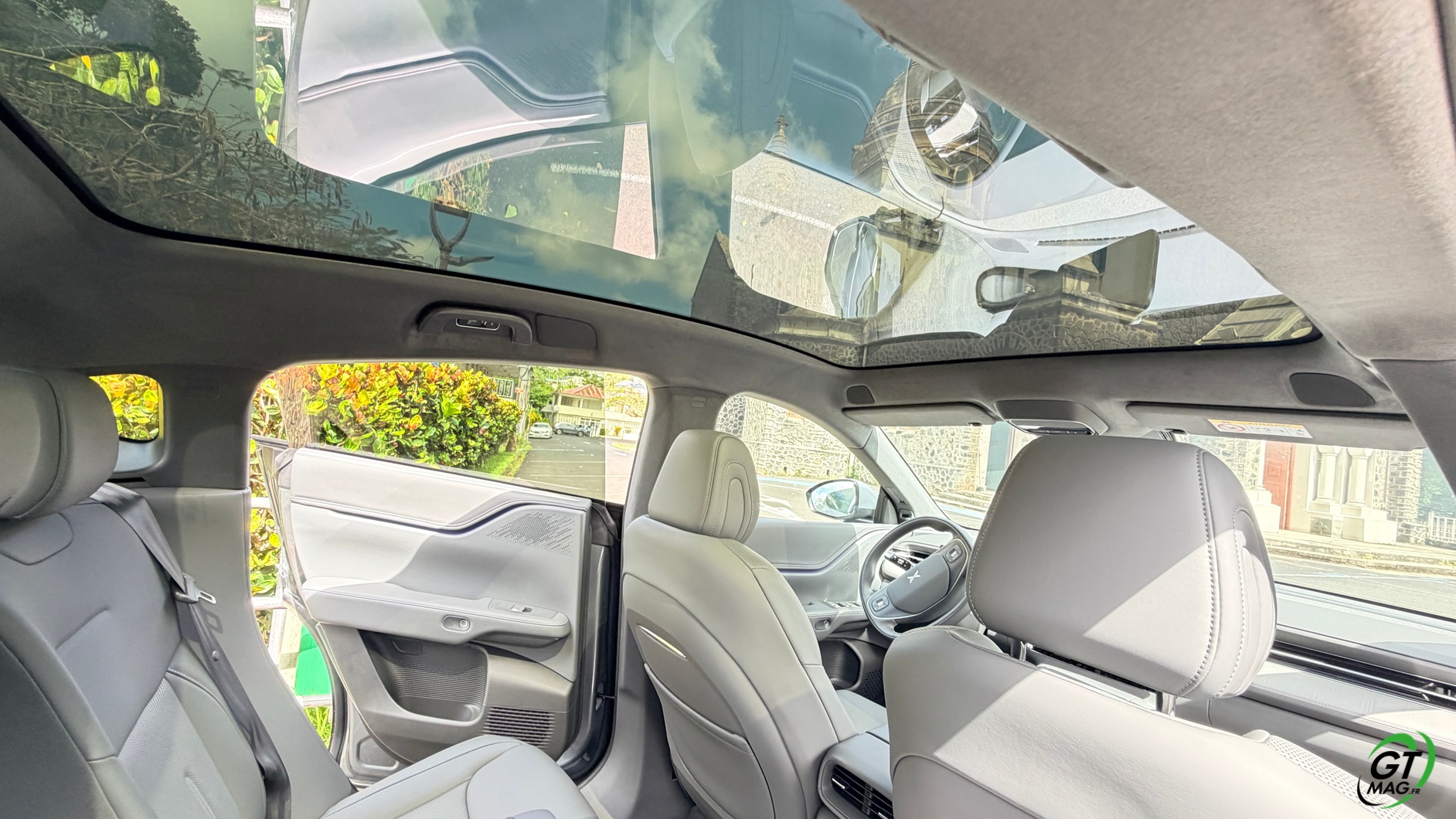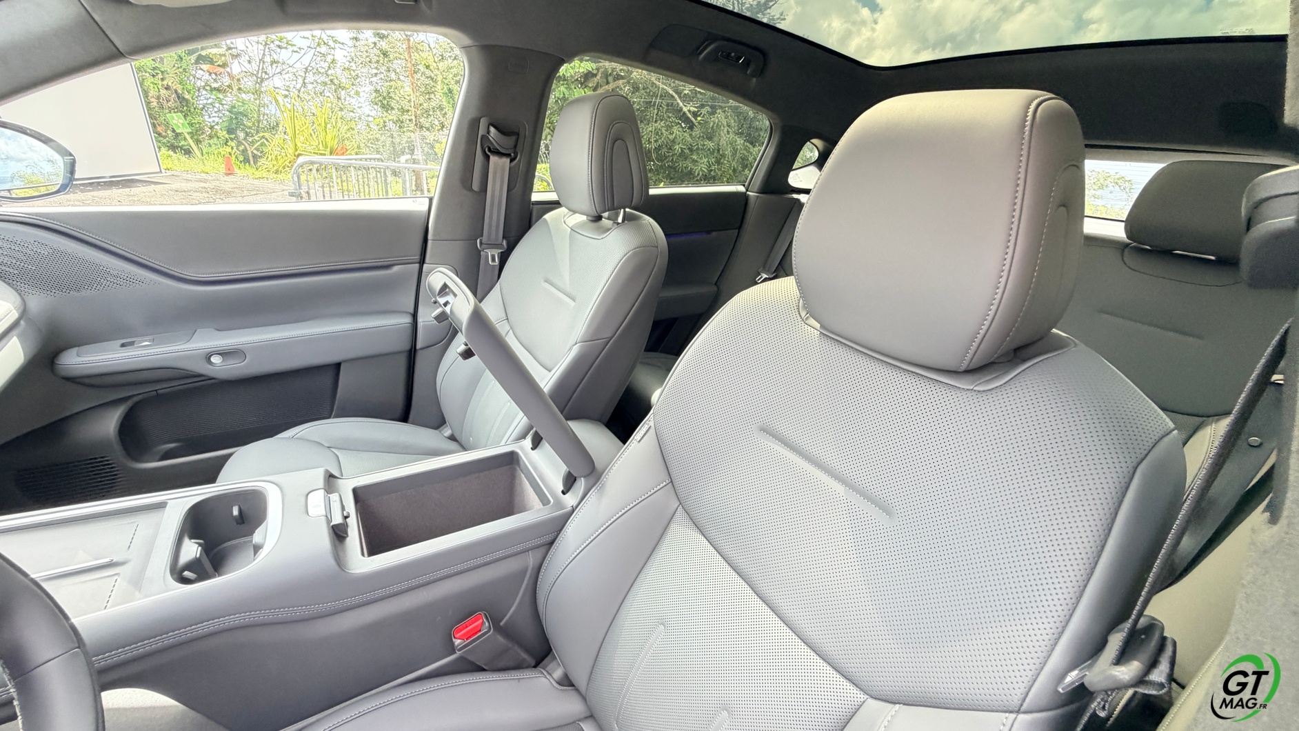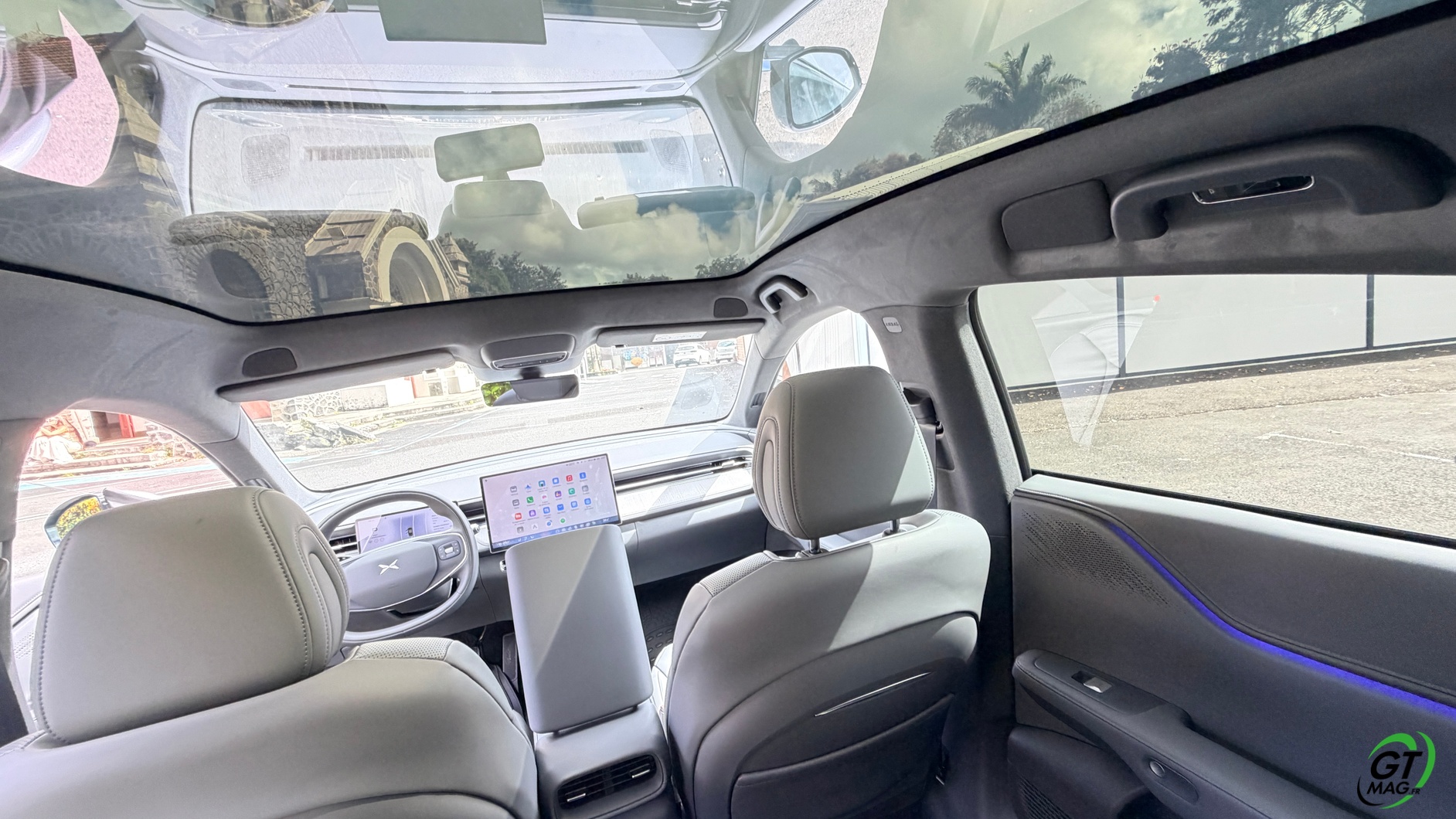 La dalle derrière le volant mesure 10,25 pouces et peut être personnalisée selon les envies du conducteur : Waze, streaming (type Spotify), GPS natif, aides à la conduite, etc. La dalle passe à 15,6 pouces sur le modèle 2025 et notre essai. De plus, la Xpeng G6 Performance 2025 peut être entièrement gérée depuis un smartphone grâce à une application simple d’utilisation, permettant de consulter la charge, l’autonomie et de commander certaines fonctions du véhicule. Les passagers arrière profitent d’un espace généreux aux jambes (grâce à l’absence de tunnel central), d’une assise moelleuse, d’un accoudoir confortable et d’un toit panoramique fixe de 2,12 m². Les dossiers peuvent s’incliner de 11 degrés pour améliorer le confort.