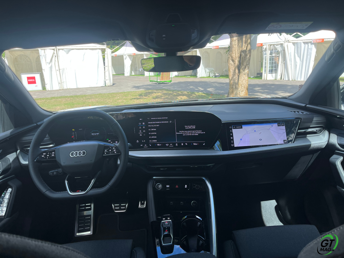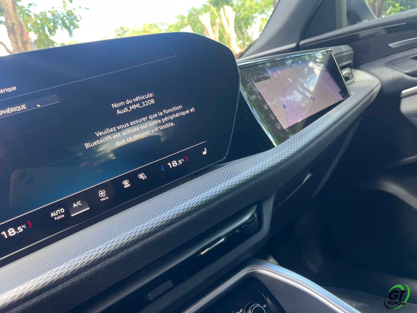Aux places avant, ce Q5 cuvée 2025 adopte les nouveaux standards en matière de disposition des planches de bord, déjà vus notamment sur les Q6 e-Tron ou Audi A6 e-Tron. Elle se compose désormais d’une double dalle numérique arrondie légèrement tournée vers le conducteur avec une instrumentation numérique de 11,9 pouces et un écran multimédia de 14,5 pouces, pouvant être complétés sur la version SQ5 ou en option par un affichage tête haute et un écran face au passager. Cette disposition va progressivement se généraliser sur les autres modèles de la marque. Le nouveau système d’infodivertissement MMI de l’Audi Q5 fonctionne sous Android Automotive, ce qui signifie que les services Google sont intégrés (en ce compris la navigation via Google Maps) et que des applications tierces comme Spotify ou YouTube peuvent être installées directement, sans passer par un smartphone ! La compatibilité avec Apple CarPlay et Android Auto sans fil est bien entendu assurée…De plus les deux écrans peuvent se voir complétés en option par un troisième écran en face du passager, de 10,5 pouces, dont la fonction "Privacy" empêche le conducteur de voir ce qu'il diffuse en roulant. Il permet au passager de contrôler le multimédia, la connectivité smartphone, la navigation, ou même de jouer à des jeux. L'écran central permet aussi ce divertissement, mais à l'arrêt seulement.