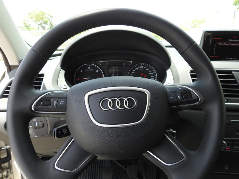 A l’intérieur, le Q3 reste une Audi, c’est-à-dire doté d’un habitacle plutôt flatteur tant pour la qualité des matériaux que pour l’assemblage. Nous avons apprécié l'assise plutôt confortable, le Q3 donne une bonne habilité même si à l'arrière 3 adultes seront un peu serrés... Le coffre atteint les 460 dm3 de contenance, soit un peu plus que le GLA mais moins que le X1. L'écran MMI couleur est agréable et haut perché c'est un plus... (Non tactile). Contact et le 2 litres diesel se montre un peu grondant, mais on évite les vibrations. Il relance facilement à bas régime avec un couple disponible dès 1500 tours. Les performances sont correctes, les 120 ch tracte les 1500kg avec souplesse. La commande manuelle de boîte est plutôt agréable. Dans sa version Attractionl'AUDI Q3 vous propose pour 33 785 euros le volant cuir multifonction, les jantes 17'', le bluetooth, l'Hold assist, Mmi couleur, le radar de recul, les phares xénon, le détecteur de pluie, l'allumage automatique des feux... En conclusion: Le Q3 Tdi 2,0l 120 cv reste fidèle à sa réputation... Le petit SUV d'AUDI vous assure fiabilité et nous impose confiance en lui... Le rapport qualité/prix idéal sur le marché Premium local? Pour faire l'essai de l'AUDI Q3 nouvelle motorisation appuyez ici !!! Jean-Marc Wollscheidpour Grantomobil.fr
