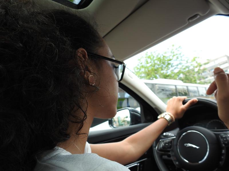 « D’emblée je te parle de la direction... J'adhère en premier car je la conduis d'une seule main et j'adore... La Xj est pourtant longue, bien plus longue et plus large que ma petite Fiat 500... Et bien tu vois même pas gênée par le gabarit !!! J'arrive en un tour de main et d’œil à gérer sa longueur, sa masse et sa largeur.... Pas le frein et alors ??? (Rires),( Il est vrai que Murielle vient de nous faire découvrir la qualité de freinage de la Xj et à du mal sur le dosage de la pédale... Oups, je continu l'interview un coup à l'avant et un coup à l'arrière de la limousine... Oups bis... Aïe !!!)... Quoi ? Il vaut mieux freiner trop que pas assez... Ce qui me touche le plus ce sont les courbes de la Jaguar Xj... Je la voie presque comme un corps de femme et je rejoins Murielle Bedot dans son approche, elle est douce et sensuelle... Je fais souvent la comparaison entre les lignes et courbes d'une voiture et celles d'une femme... Il n'y a rien d'agressif dans la Jaguar Xj aussi bien à l'extérieur qu'à l'intérieur, tout est beau, fluide et luxueux.. Je m'y retrouve dans cette Jaguar... J'aime la taille du volant avec une sorte de prise en main intuitive... J'aime... Vraiment... »