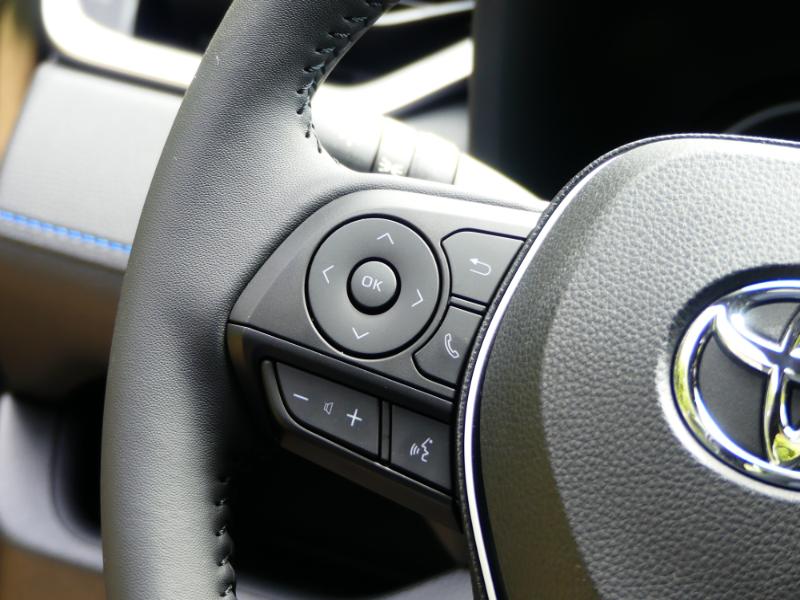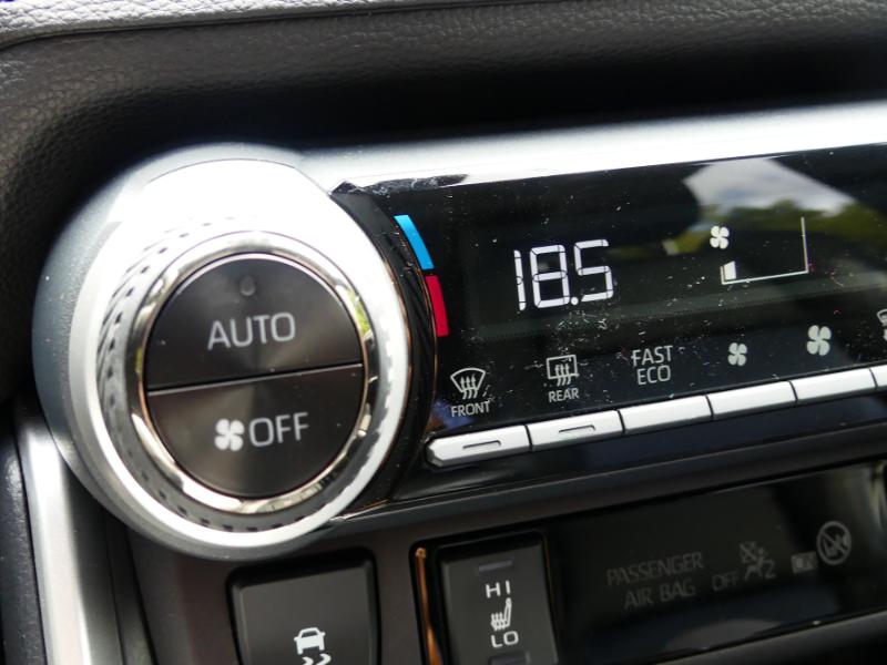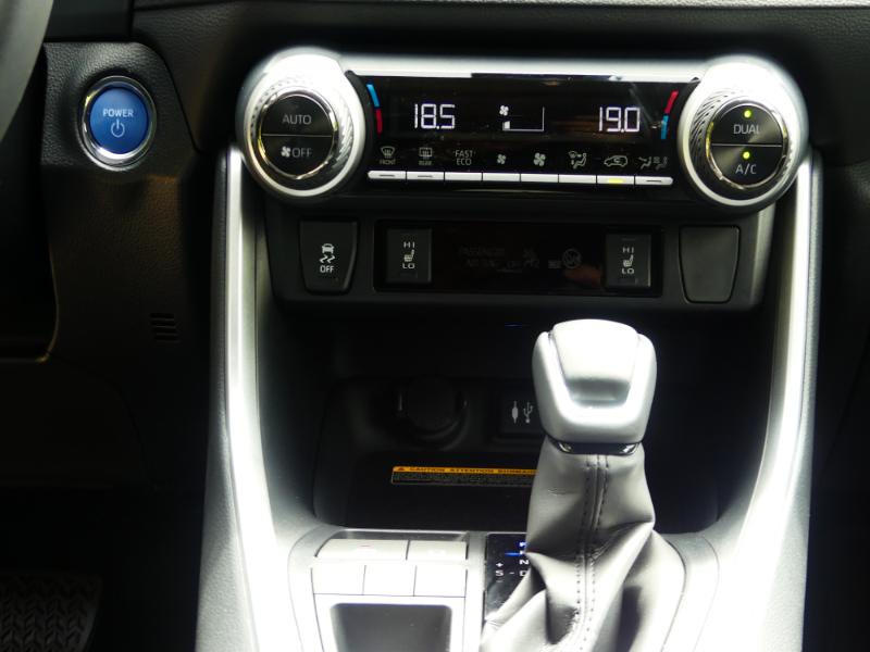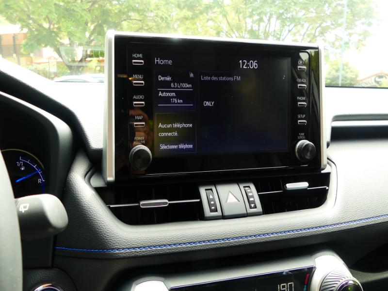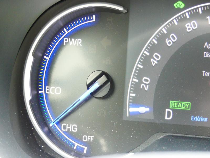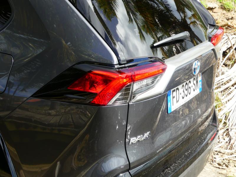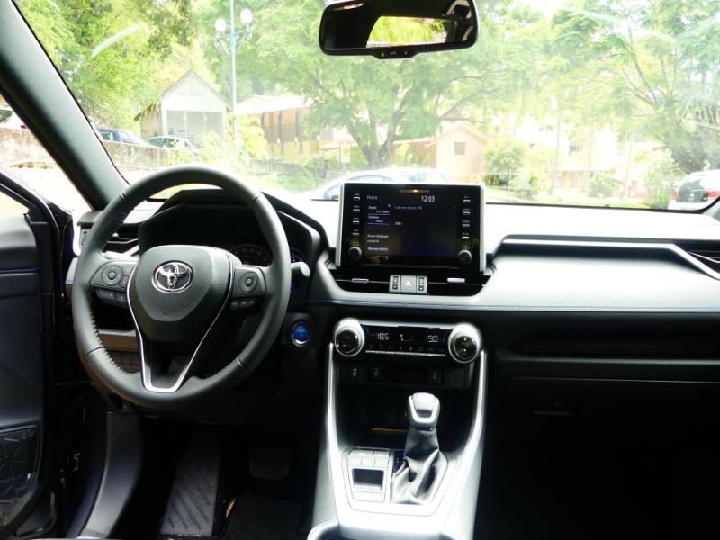 A l'intérieur notre modèle joue la séduction avec un choix de matériaux bien supérieur au segment... Une sur-couture bleue n'est pas pour déplaire et l'ensemble du tableau de bord inférieur comme supérieur fait étal d'un matériau moelleux qui rappelle les modèles les plus Premiums essayés dernièrement sur Grantomobil.fr... Les fonctions sont simples et accessibles sans être à foison ce qui permet une prise en main quasi immédiate de ce RAV 4 Hybride 218 cv 2 roues motrices nouvelle génération... Un écran 8 pouces donne du volume à l'envie de pianoter... Au Top, un écran à cristaux liquides à la place du rétroviseur central juste si vous êtes trop chargé à l'intérieur par exemple, une caméra remplace alors la vision obstruée, génial non ?! L’adoption de la commande électrique pour le frein de stationnement libère une place appréciable pour le téléphone portable et son chargement par induction... Pour ce qui est de la conduite améliorée, le RAV4 2019 vous propose 3 modes de conduites qui agissent sur la direction, les suspensions et la consommation bien-sur, elle, relevée par nos soins en trajet mixte entre le Lamentin et Saint-Anne, soit 6,5 litres au 100 km ce qui reste moyen par rapport à nos attentes pour ce type de véhicule...