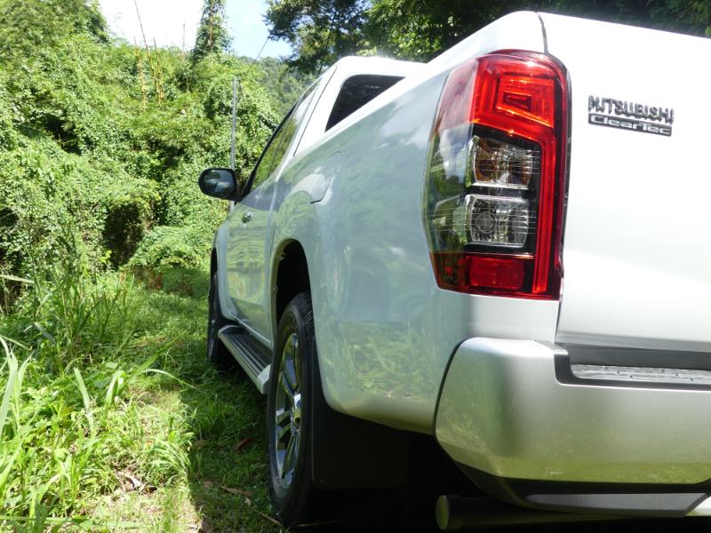 Le restylage selon Mitisubishi c'est lui donner enfin une vraie gueule, ce nouveau L200 a clairement une « personnalité », avec sa face avant affichant maintenant sa robustesse, bien plus expressive que l’ancienne génération. Pour accentuer cet effet de force brute, le capot moteur a été surélevé de 40 mm, et les feux ont également été positionnés un peu plus hauts. Vu de flanc, on remarque les plus grandes jantes (de 18 pouces minimum pour l’instant), ainsi que les marche-pieds plus larges. Imposant par ses dimensions (5,21 m dans cette version Club Cabine, + 2 cm par rapport à l’ancien L200), ce L200 n’est en revanche pas plus large que son prédécesseur, malgré les apparences. A l’arrière en revanche, rien que de très classique, la fonction prenant le devant sur la forme, pickup oblige.