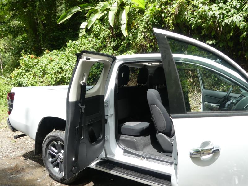 Un bon point : la position de conduite, agréable, et le confort offert par les sièges avants, redessinés par rapport à la génération précédente, et qui offrent un bon maintien (un point important sur les pistes cahoteuses que nous avons emprunté !). Accessibles via des portes à ouverture antagoniste, les places arrières sont à réserver à une utilisation occasionnelle, avec un espace réduit, et des dossiers trop verticaux. Un défaut commun aux autres pickup à cabine simple approfondie, et qui fait qu’il ne faut considérer ce L200 Club Cabine que comme un 2 + 2.