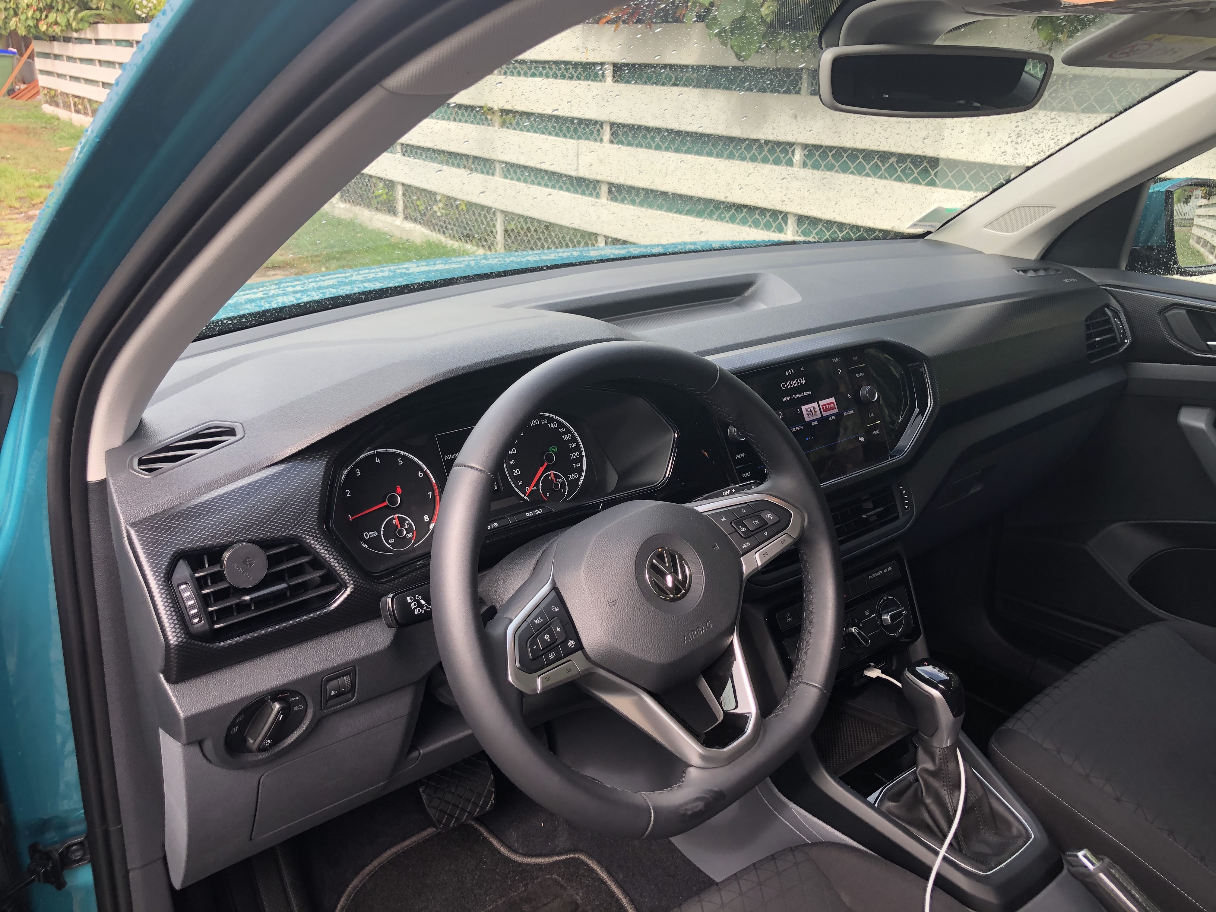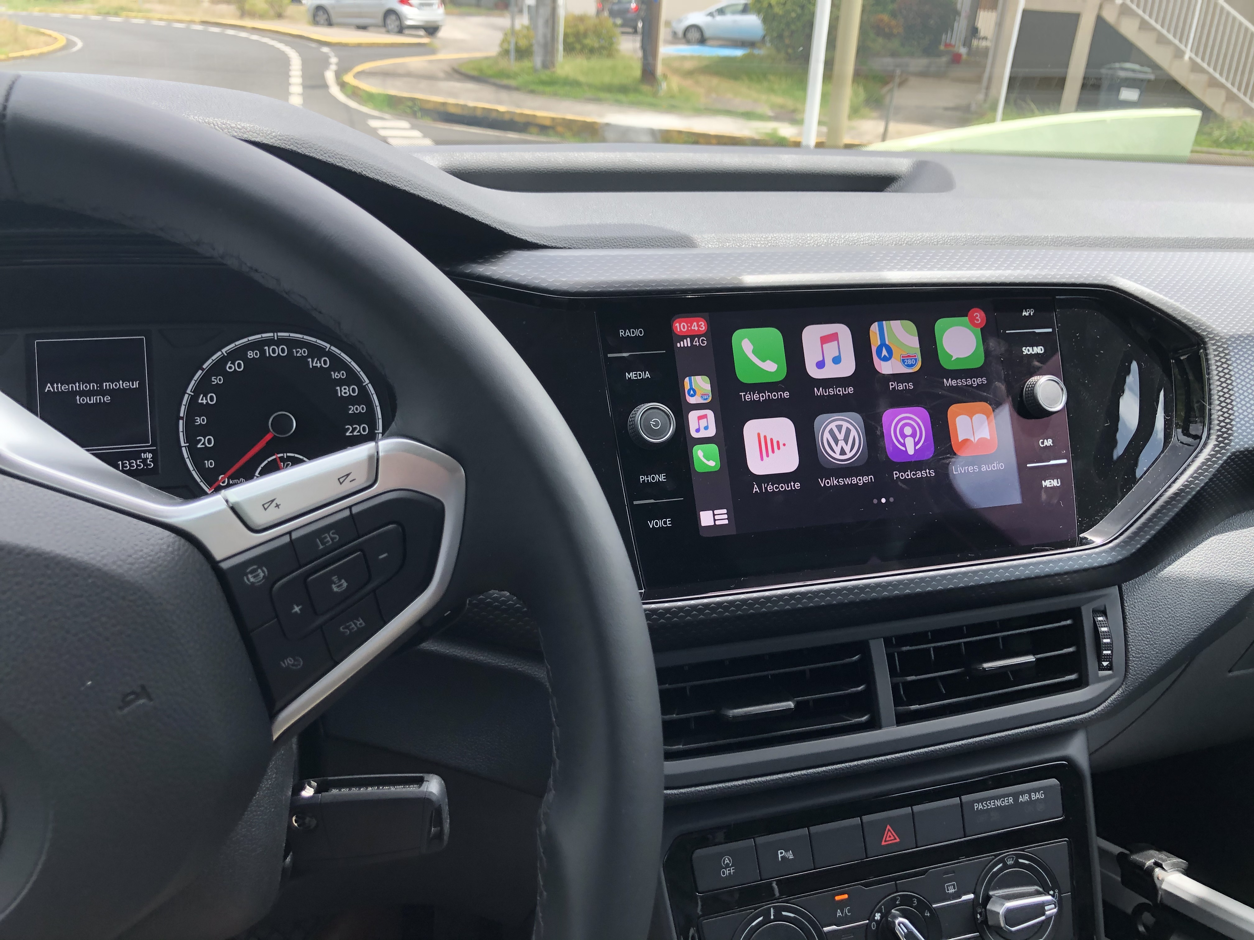 Bon je retrouve les sempiternels plastiques durs de la partie inférieure de l’habitacle, c’est ainsi, mais forcé de reconnaître le sérieux de la fabrication et des ajustements, tandis que différents packs colorés peuvent égayer l’habitacle. Avec quatre ports USB, un équipement sécuritaire à la page (avec la possibilité d’avoir un régulateur de vitesse adaptatif, ainsi qu’un anti-dévoiement actif, un équipement assez peu répandu dans ce segment)… Moderne, le T-Cross offre les dernières évolutions technologiques, un écran tactile de 8 pouces, l’aide au maintien de la trajectoire, une caméra de recul ; la liste est longue aussi bien sur les équipements de série que sur le catalogue d’options. Je retiens également en bon point une assise assez haute qui permet de bien maîtriser la circulation sur nos routes parfois bondées en Martinique, le T-Cross est agréable.